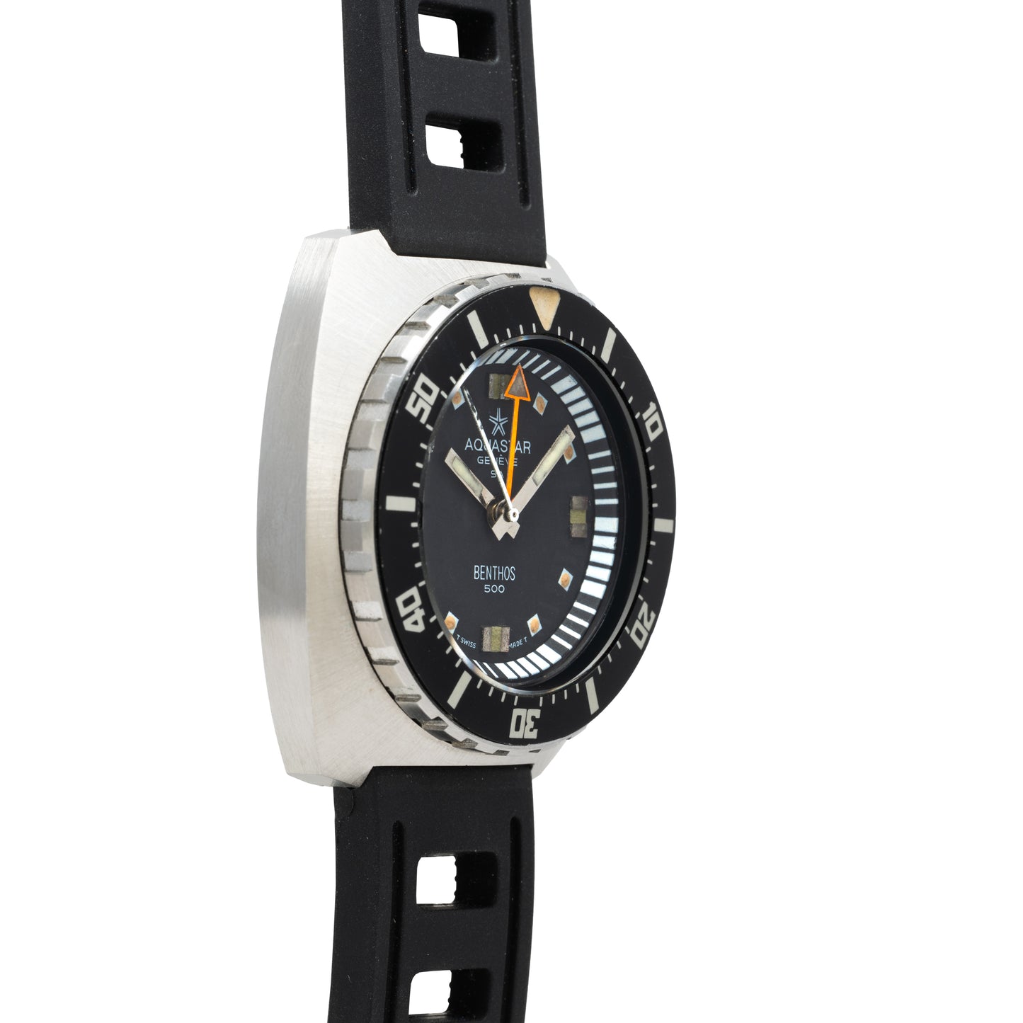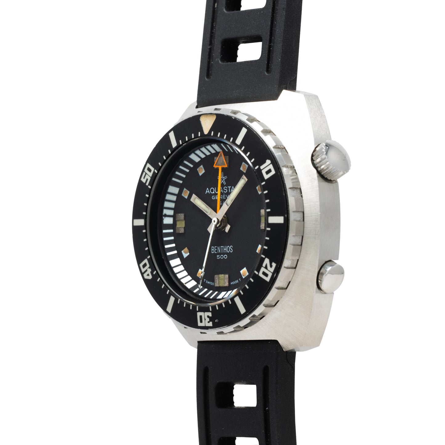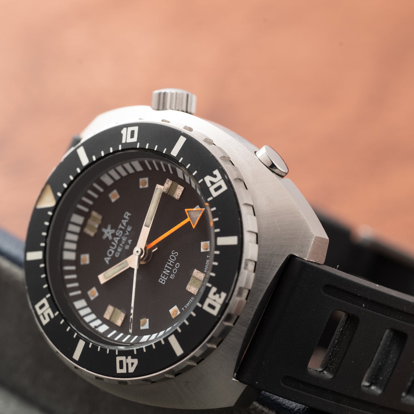 This Aquastar Benthos 500 is just such a monster. Built from the ground up as a no-holds-barred, extreme diver, it can't be considered a pretty watch by any means. But if you're being serious about your tool watch design, aesthetics are very much a secondary thought. (Consider the Omega PloProf 600, for example). Unlike so many of the modern boutique brands that are building chunky steel divers with excessive specifications for contemporary desk divers, the story of the Aquastar goes back to 1962, the very beginnings of SCUBA diving as a sport, and the dawn of the golden age of diver's watches.