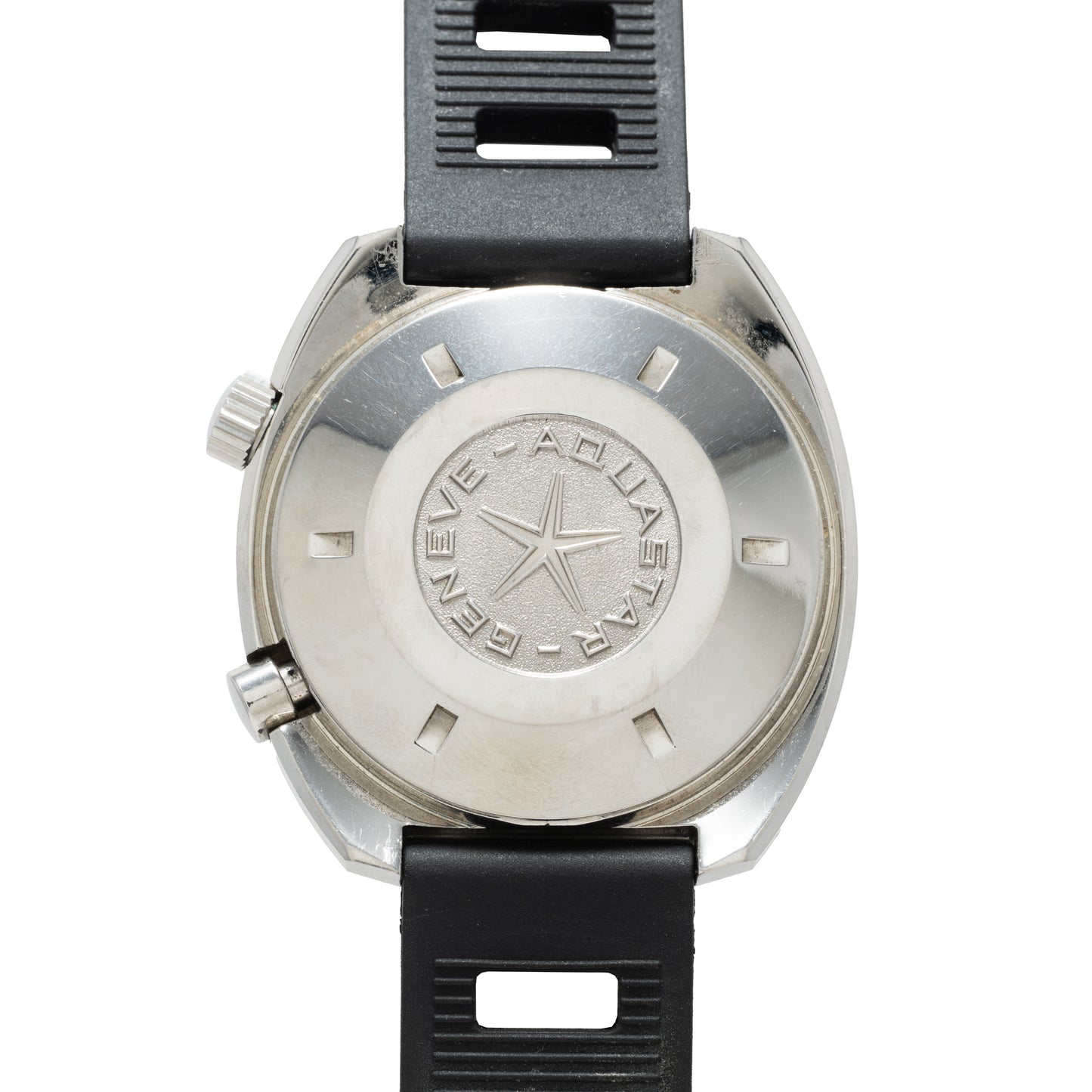 The Benthos 500 was the world's first diving watch to be rated water resistant to 500m, a tremendous accomplishment for a small manufacture in the 1960s. Utilizing a monopusher design, it has a 60-minute timing totalizer with flyback function built into the movement, along with a traditional unidirectional rotating diver's bezel. This means that a SCUBA diver can easily and legibly track elapsed minutes under water using the central minutes hand, while the bezel can be used as a secondary timer. (One might track total dive time, while the other tracks a decompression stop, for example.)