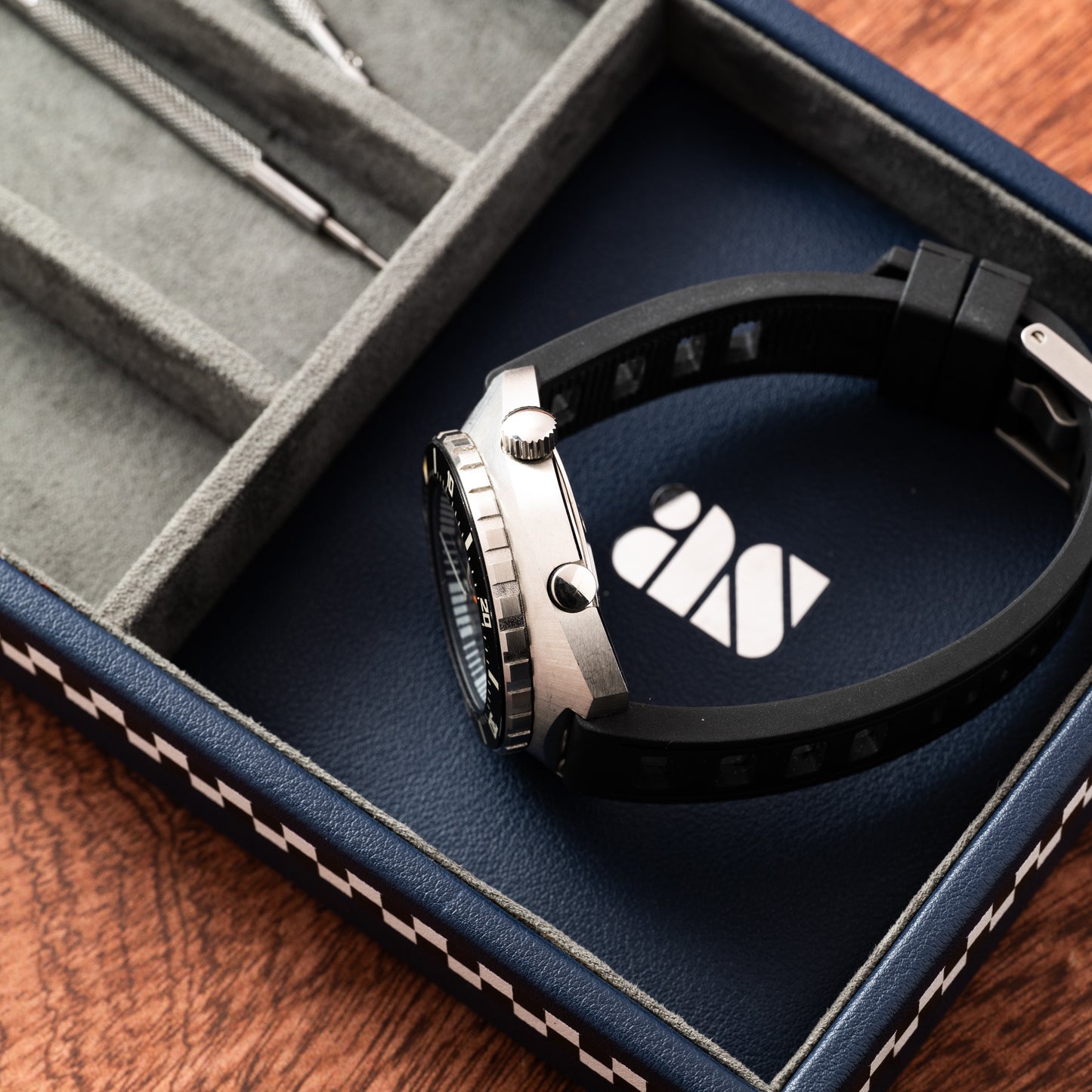 Powered by the unique A. Schild automatic movement with central chronograph minutes, this is one of the downright coolest, purpose-built dive watches we’ve ever laid our hands on.