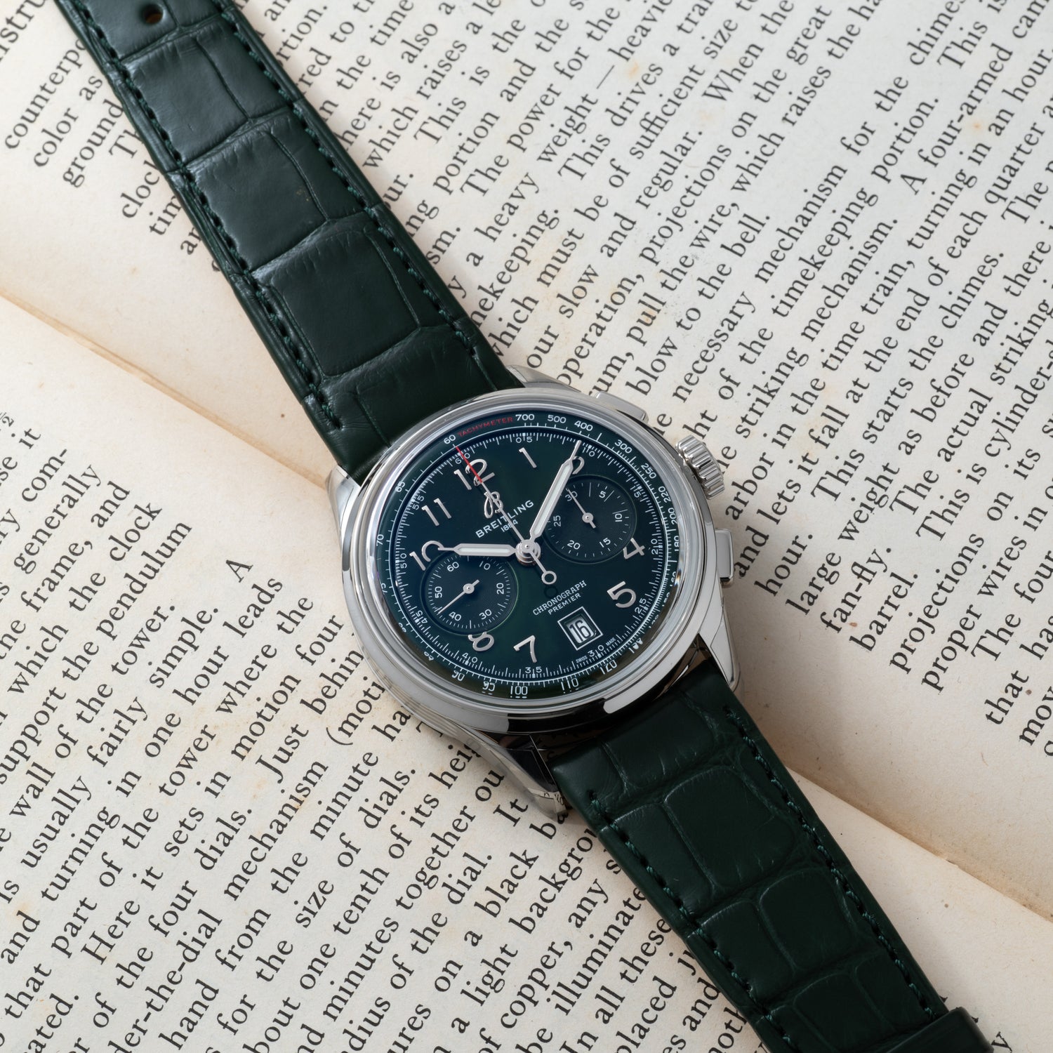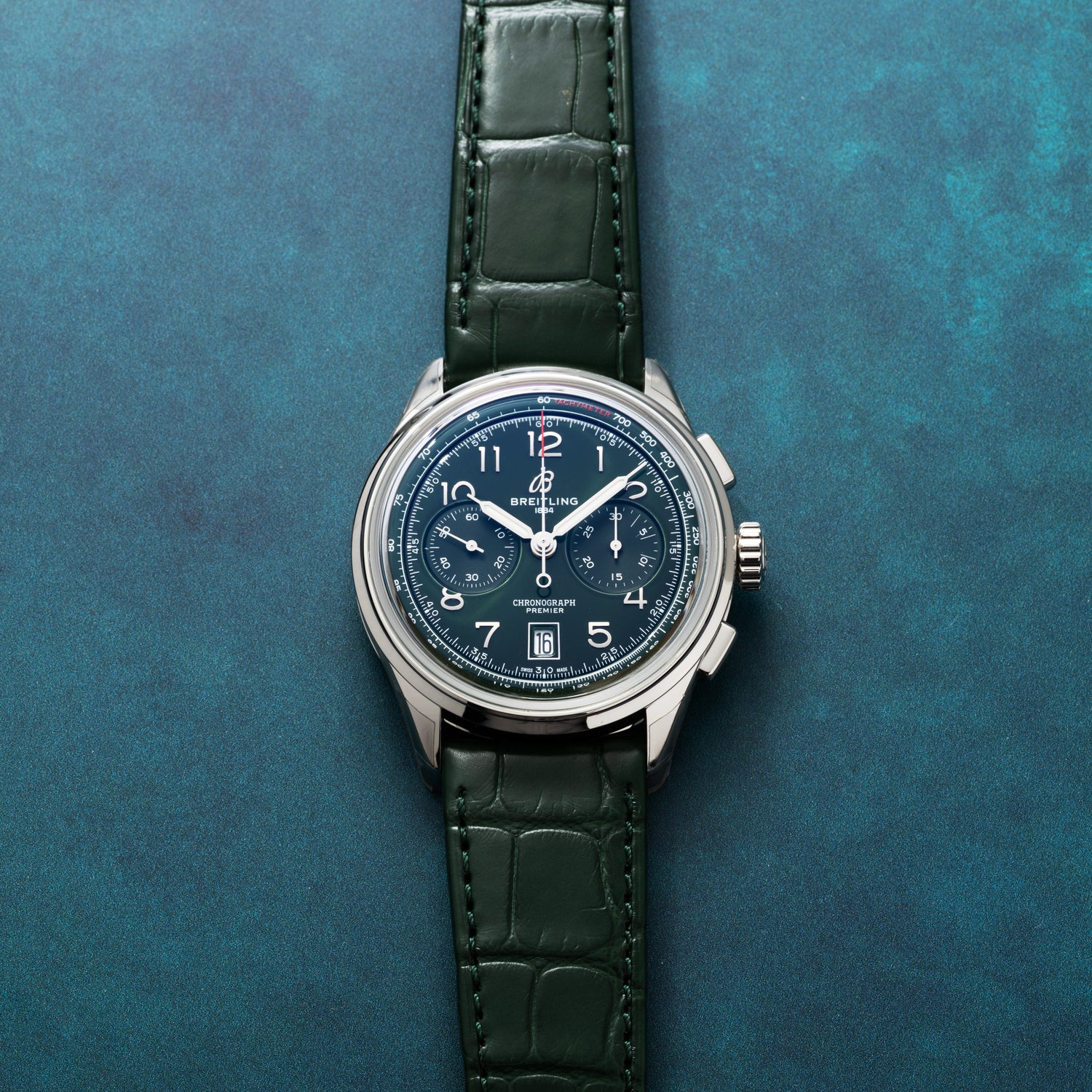 This particular Premier, a B01 Chronograph 42, features a beautiful green sunburst dial. Green has been particularly on-trend recently, and this particular dial does well to modernize a traditional design package. Coming in at 42mm in diameter, it features a fantastic, green alligator strap, a sapphire crystal, a signed crown, dual ‘cushion’ pushers, and a polished bezel. Inside you'll find a crisp, luminous dial with applied indices, recessed sub registers, an outer tachymeter scale, a 6 o'clock date window, and a matching handset.