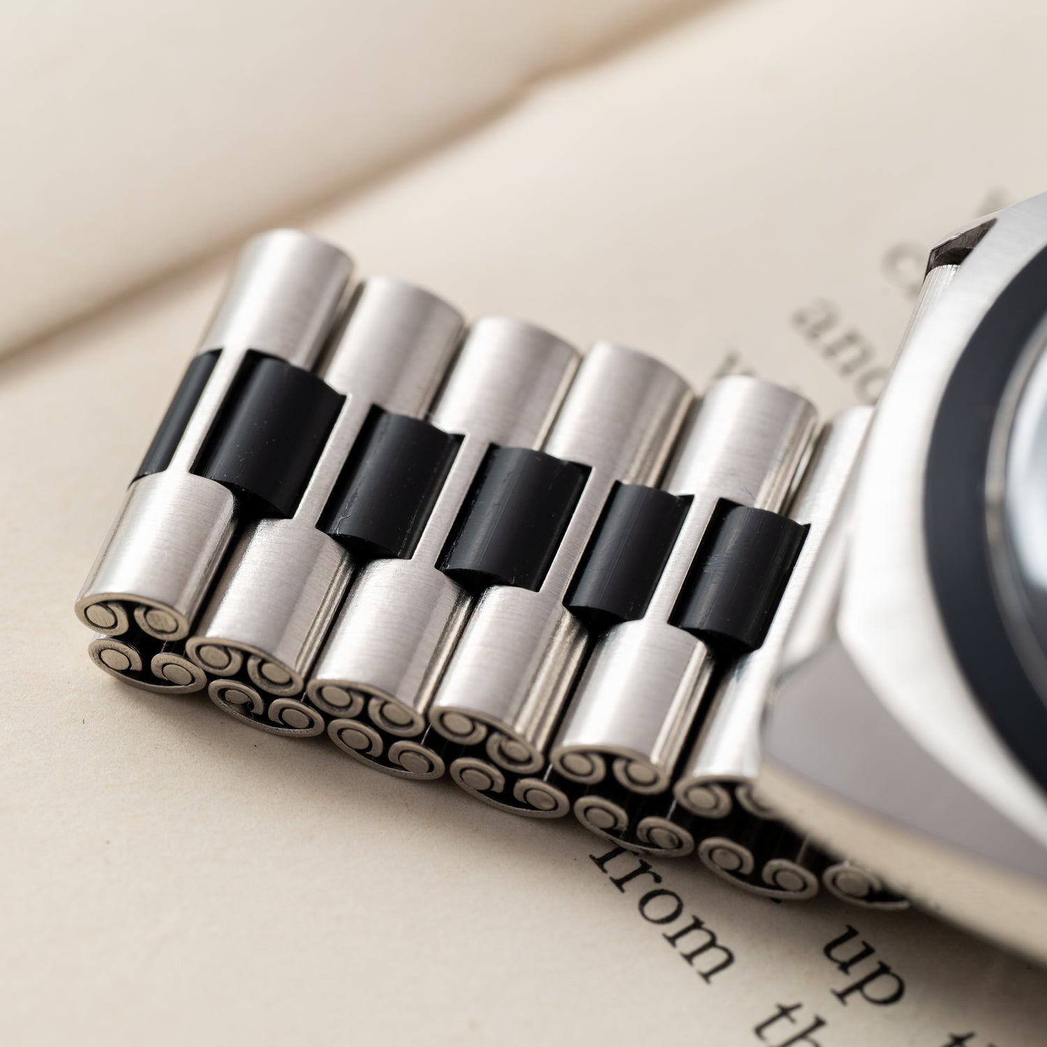 But the Autavia was far from the only significant chronograph that Heuer made. Take this EXCEPTIONAL model that is seldom seen even in Heuer collecting circles -- a Jarama! Dating to 1977, this piece pays tribute to Circuit Del Jarama which hosted the Spanish Grand Prix from 1968 to 1981. Housed in a stainless steel cushion case, this piece features a blacked out bezel, charcoal black dial, and a date at 6 o'clock. Plus, it features a lovely very 70s cushion case with a signed, stainless steel bracelet with matching black coating, as well as its period-correct box!