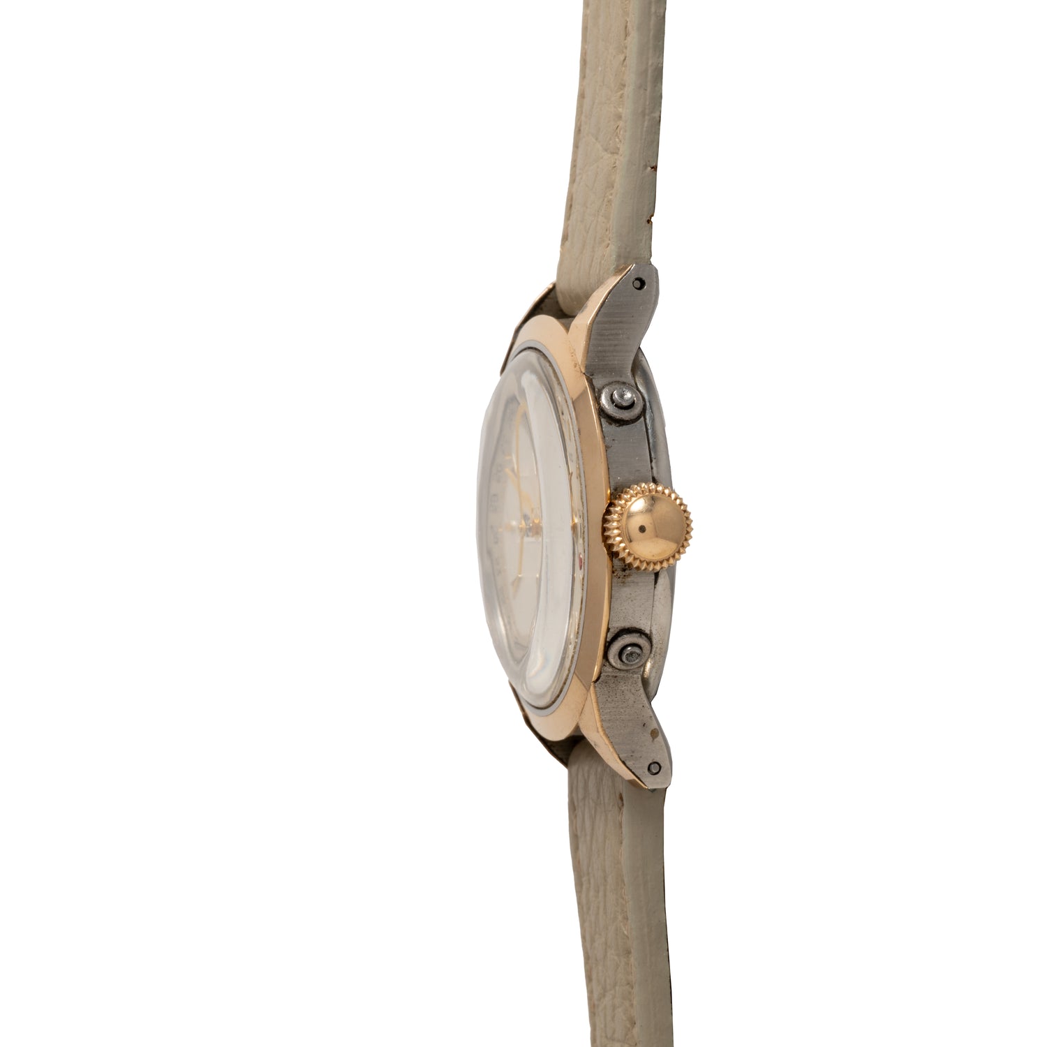 This Calendograph, dating from the 1940s, is one of those gems that reminds you just how good Movado once was. Its 33mm stainless steel case by famed casemaker François Borgel features elegant, multi-stepped lugs — the kind of meticulous detail that’s all but vanished from modern production — along with a smooth yellow gold bezel, an acrylic crystal, dual calendar correctors, a gold unsigned crown, and a screw-down caseback. The multi-tone dial is a showstopper, complete with an outer grey section with a peripheral date scale in black and an inner white section with applied yellow gold-tone 'arrow' and 'Arabic' indices, an 'alpha' handset, and dual day and month apertures at 9 and 3 o'clock, respectively.