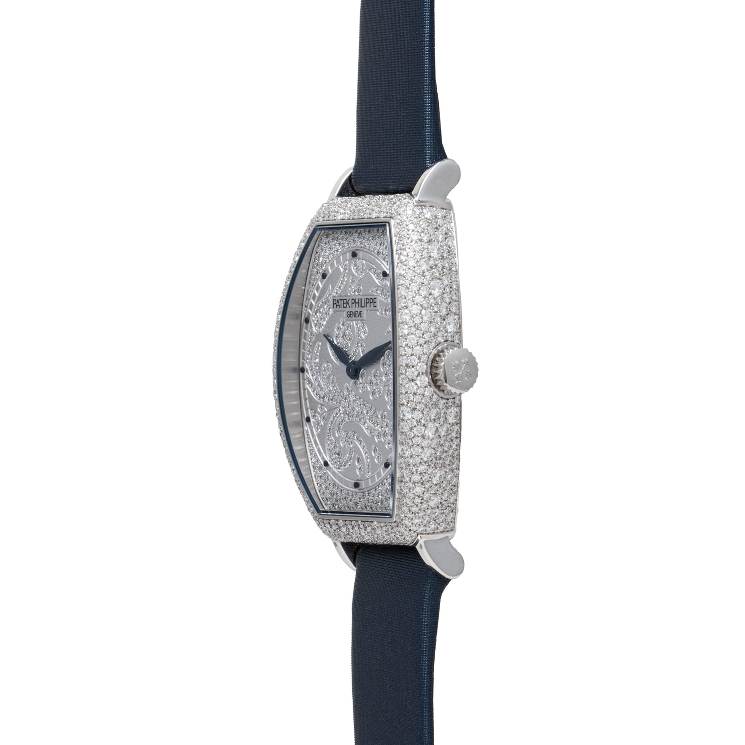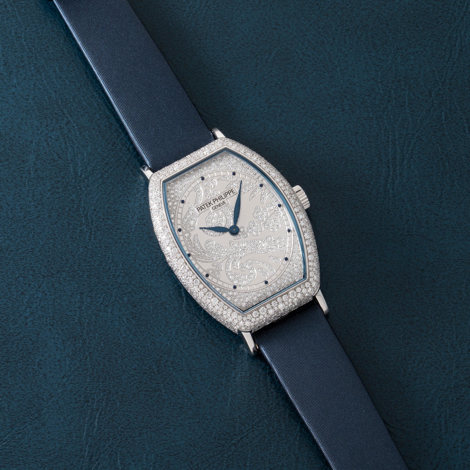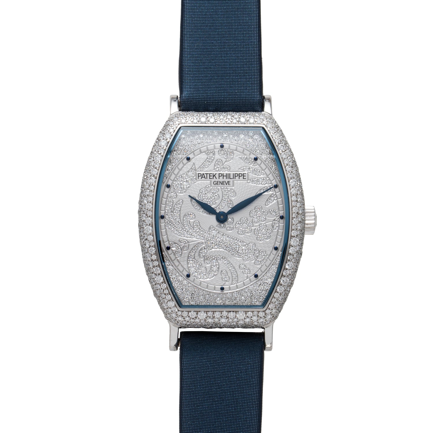 This example, a Reference 7099G-001, dates to 2021 and features an 18K white gold tonneau case with a curved sapphire crystal, a signed crown and an exhibition caseback showcasing Patek’s manual-winding Calibre 25-21 REC movement. Its silver dial features a mesmerizing mix of guilloche finishes and applied diamonds, a minimalist set of applied hour indications, and a diamond set bezel.