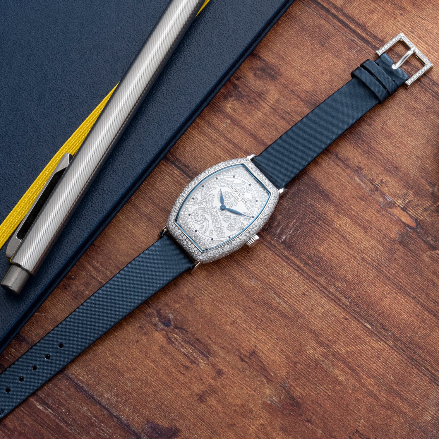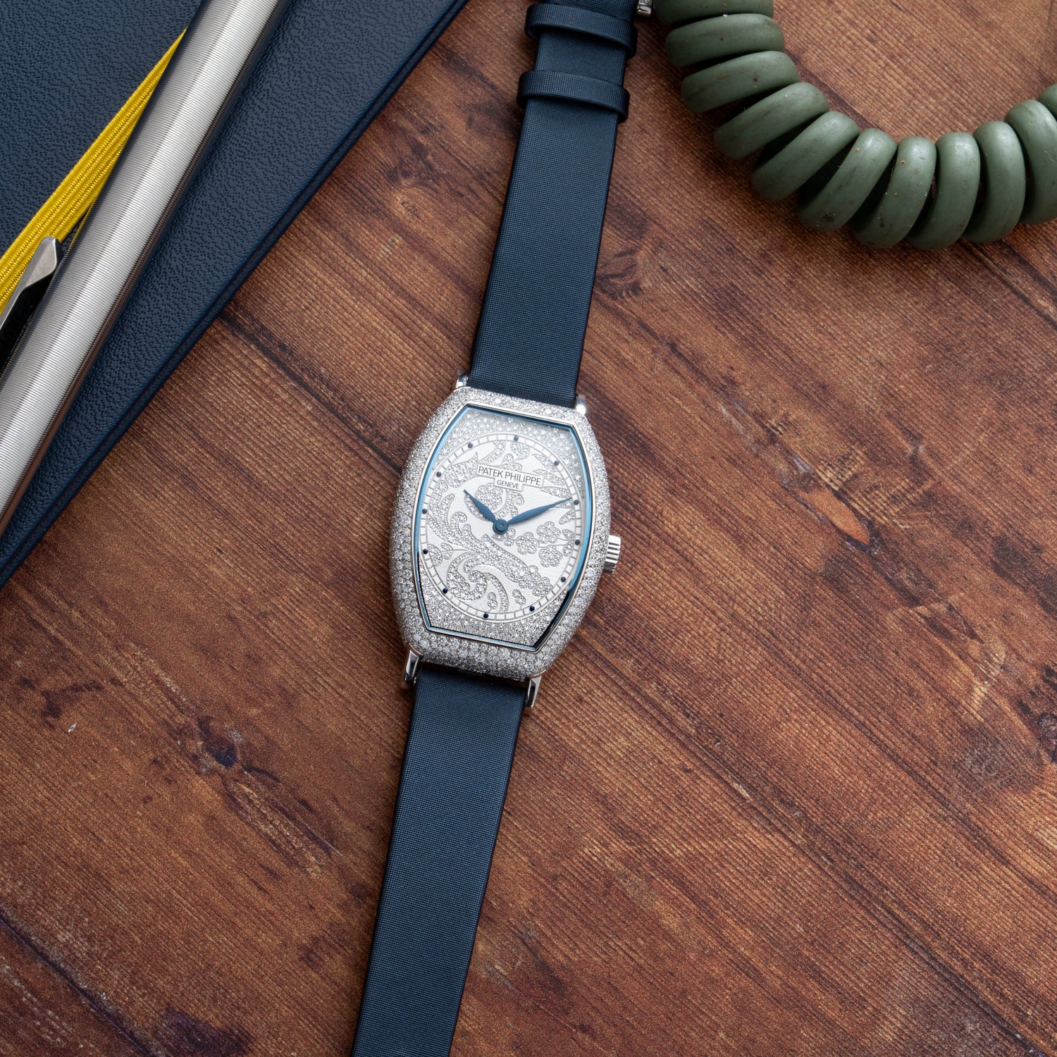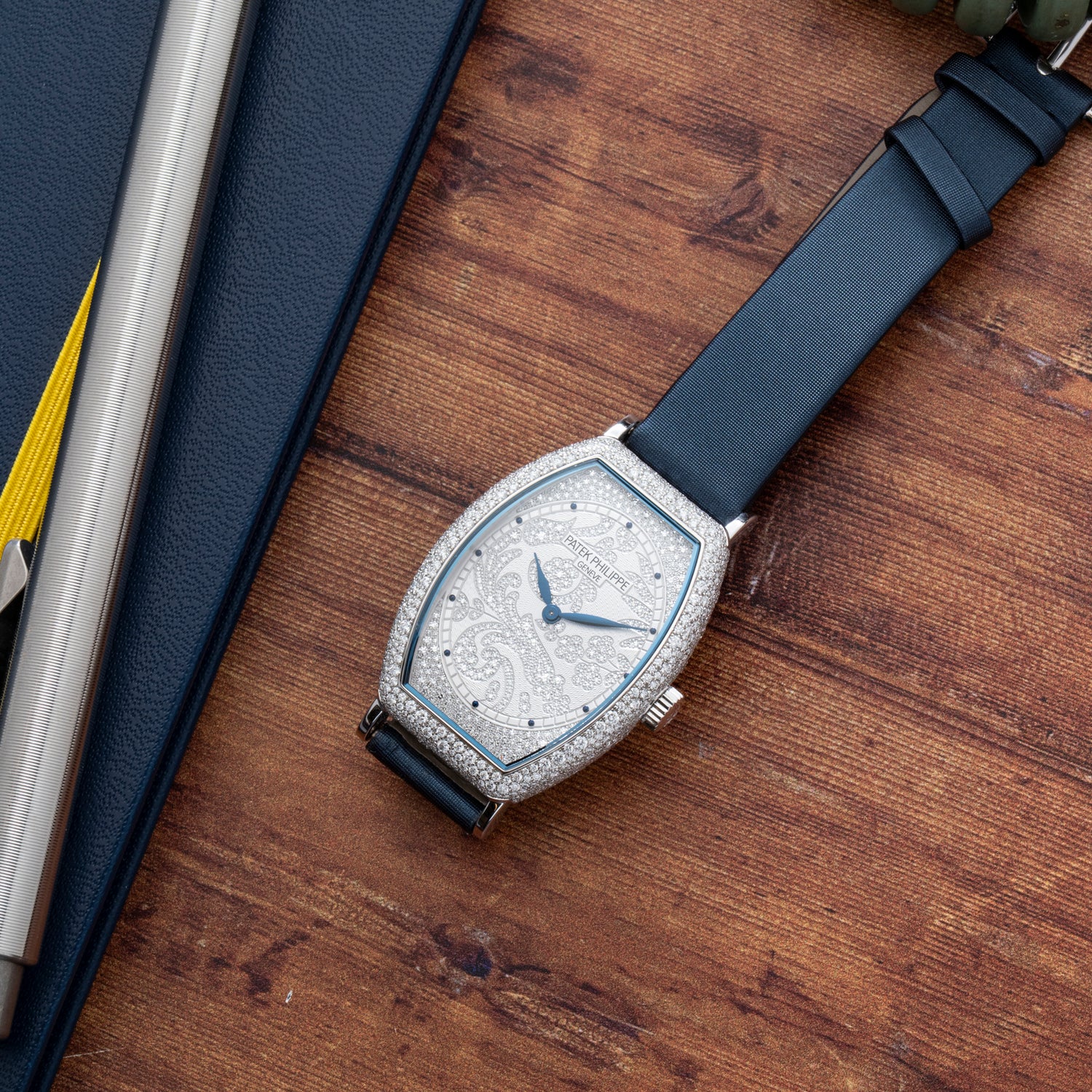 This example, a Reference 7099G-001, dates to 2021 and features an 18K white gold tonneau case with a curved sapphire crystal, a signed crown and an exhibition caseback showcasing Patek’s manual-winding Calibre 25-21 REC movement. Its silver dial features a mesmerizing mix of guilloche finishes and applied diamonds, a minimalist set of applied hour indications, and a diamond set bezel.