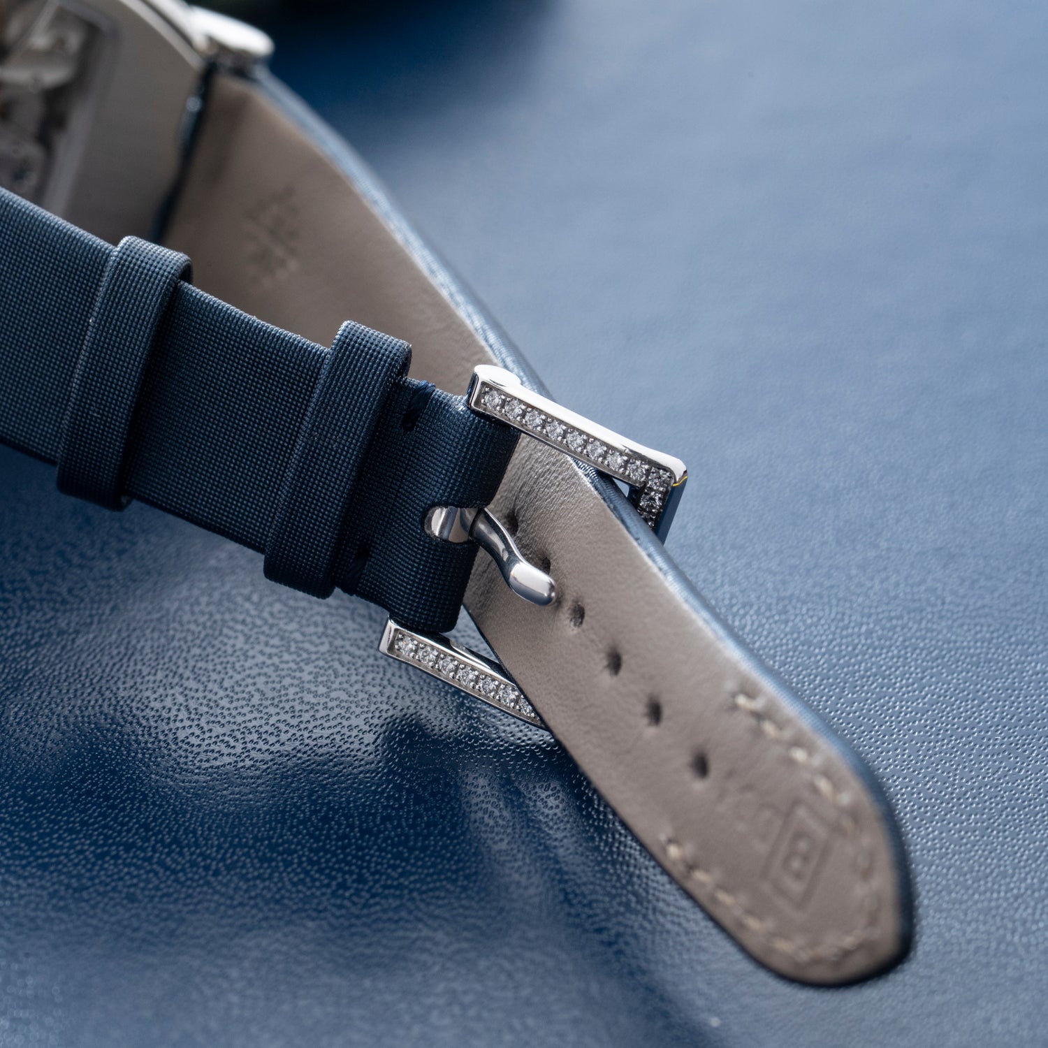 Includes Patek Philippe signed, blue satin strap with factory diamond set 18K white gold pin buckle. Also includes complete inner and outer box set, signed leather folio, factory booklets and Certificate of Origin dated December, 2021.