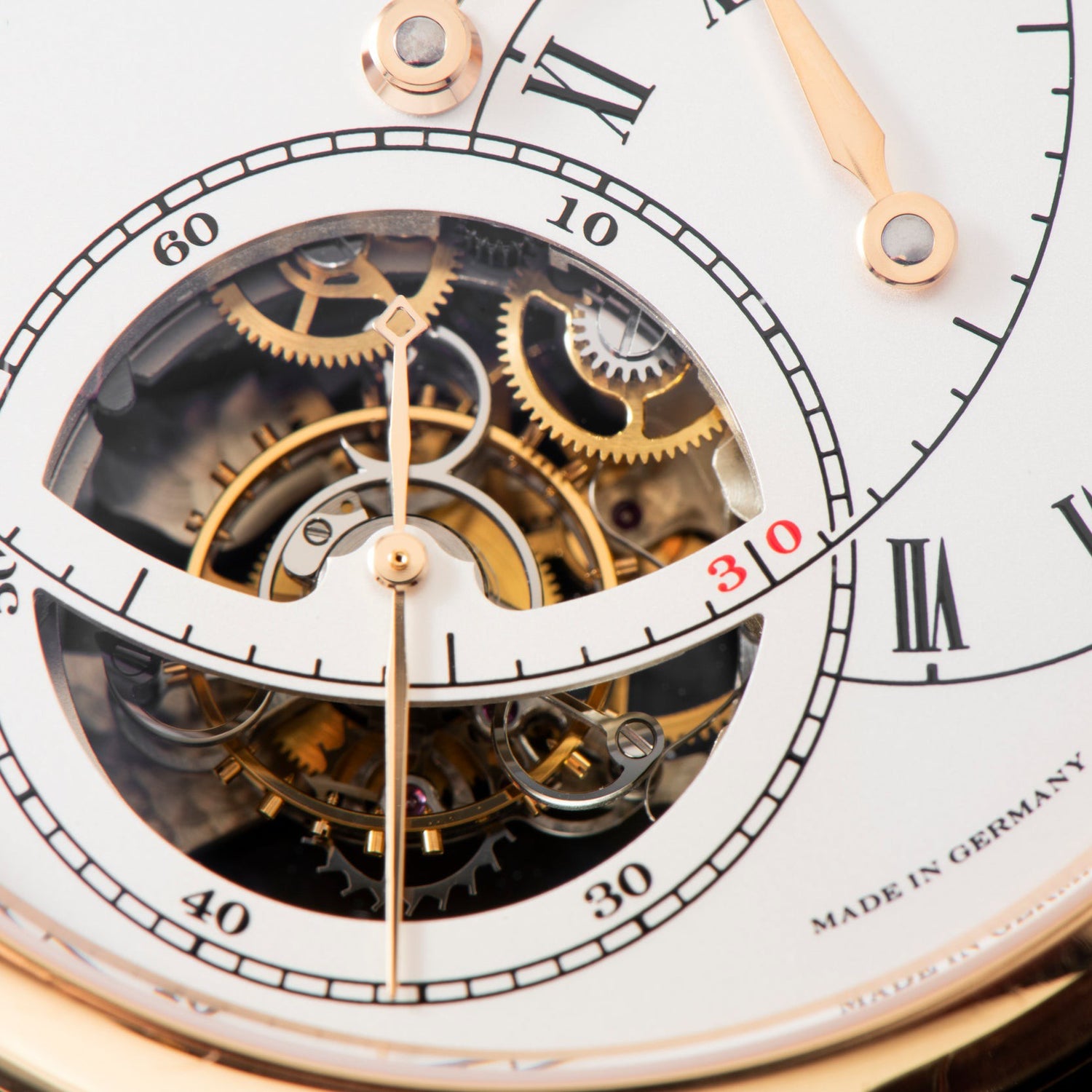 The Reference 760.032F featured here is a perfect example of this sophistication. It features a one minute tourbillon, counteracted by a fusee and chain constant force mechanism that guarantees equal amplitude on the escapement as the power reserve winds down--- a brilliant innovation. Additionally, the portion of the time display that intersects with the tourbillon aperture retracts from the cage when the hands are no longer pointing to that portion of the dial real estate. This is an added "complication" of sorts that is absolutely brilliant.
