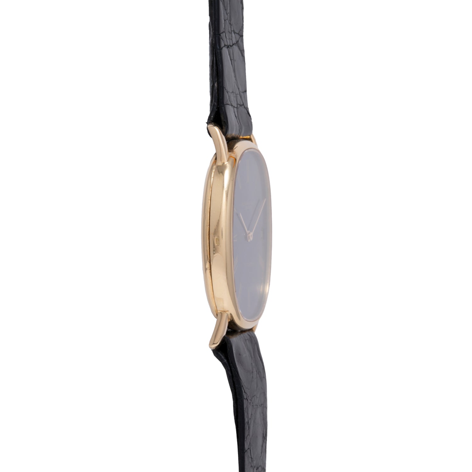 This particular watch features a beautiful yellow gold case with a crisp hallmark on the 9 o'clock side, houses a lovely deep navy blue 'sunburst' dial holding a lovely 'golden flaked' patina with printed 'Arabic' indices, a matching 'pencil' handset, and an automatic winding movement within! Following a classic ellipse format, this rare timepiece comes with a date window at 3 o'clock.