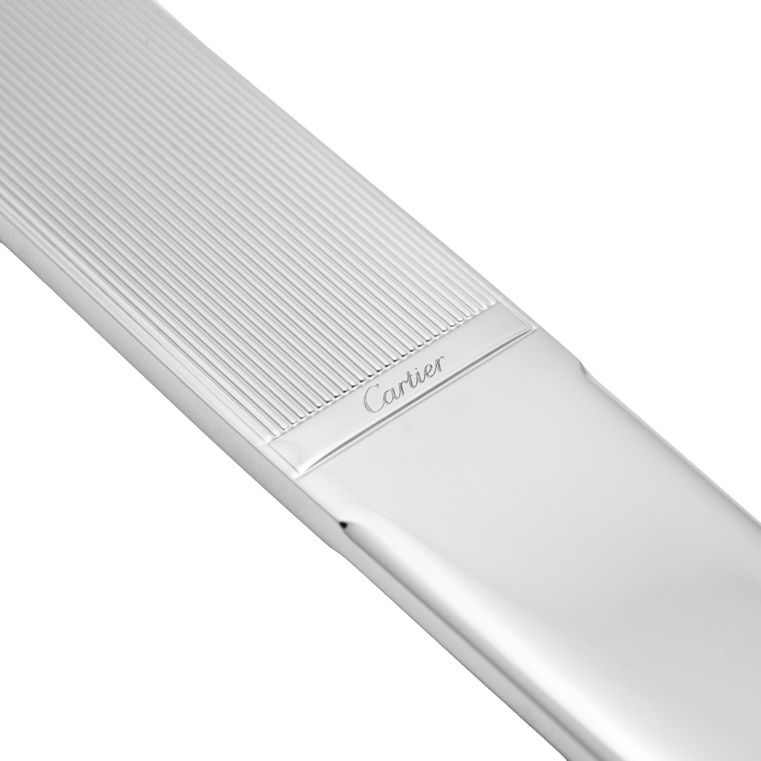 This gorgeous stainless steel letter opener comes from the King of Jewelers themselves, Cartier. Accompanied by its signature outer red presentation box and inner Cartier-embossed leather sleeve, it features a thin fluted pattern on its handle and a smooth "blade" of polished stainless steel.