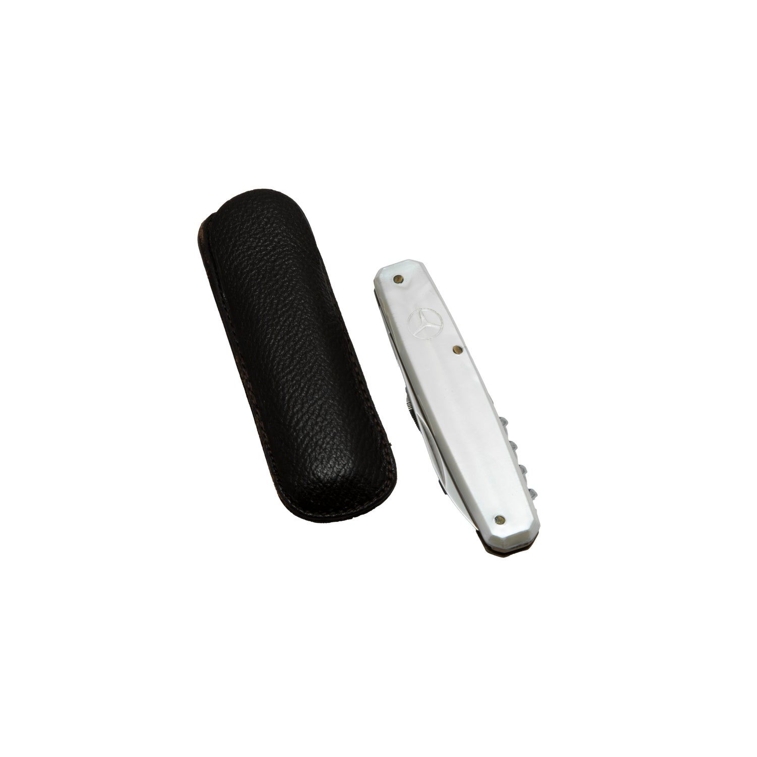 This folding pocket knife, made in Germany by Huba, features a shimmering mother-of-pearl handle — the kind of iridescent finish that says “Yes, like a Boy Scout, I am prepared, and yes, I have taste.” The blade itself carries the Mercedes-Benz logo, which means you can now brand your envelopes, oranges, or existential decisions with automotive authority.