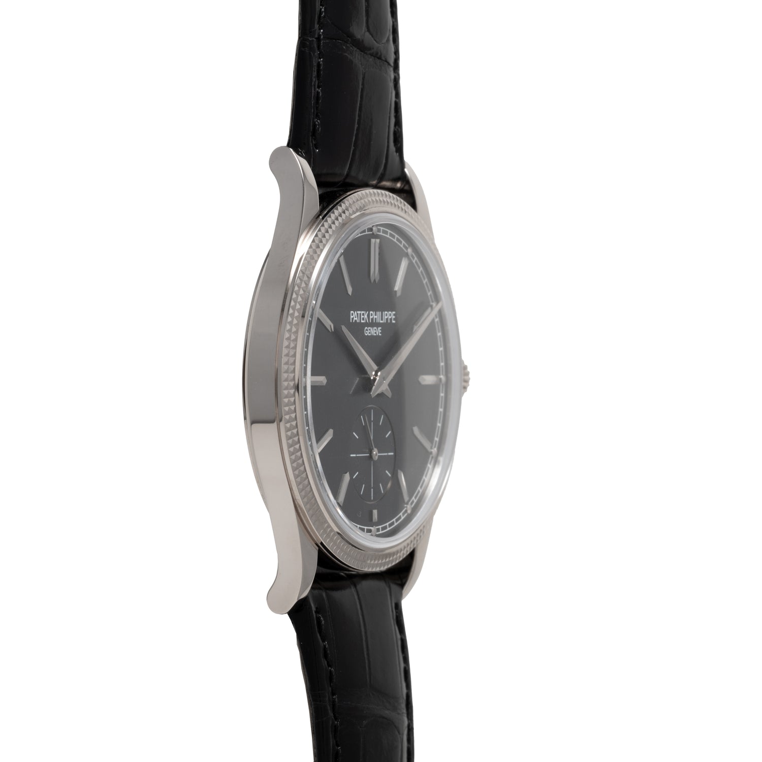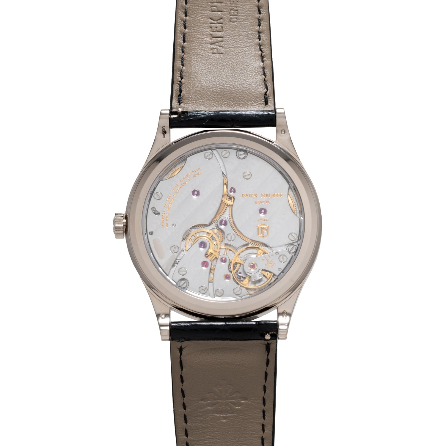 Powered and visible by way of a sapphire exhibition caseback, this Calatrava features a hand-wound Patek Philippe Calibre 30-255 PS and comes fitted to a signed black alligator leather strap with a signed 18k white gold pin buckle.