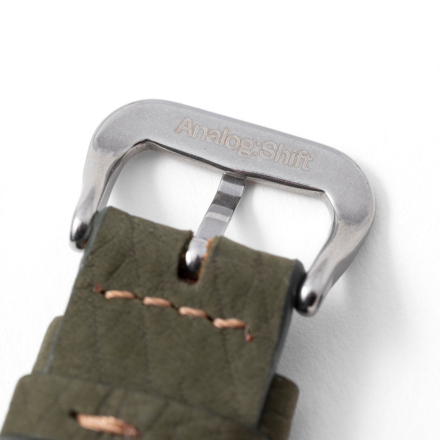 Analog:Shift Matte Calf Leather Straps are available in four lug widths, all of which feature a 16mm taper, tonal stitching, dual keepers, and a perforated backing. Each comes fitted with an Analog:Shift-signed stainless steel pin buckle.