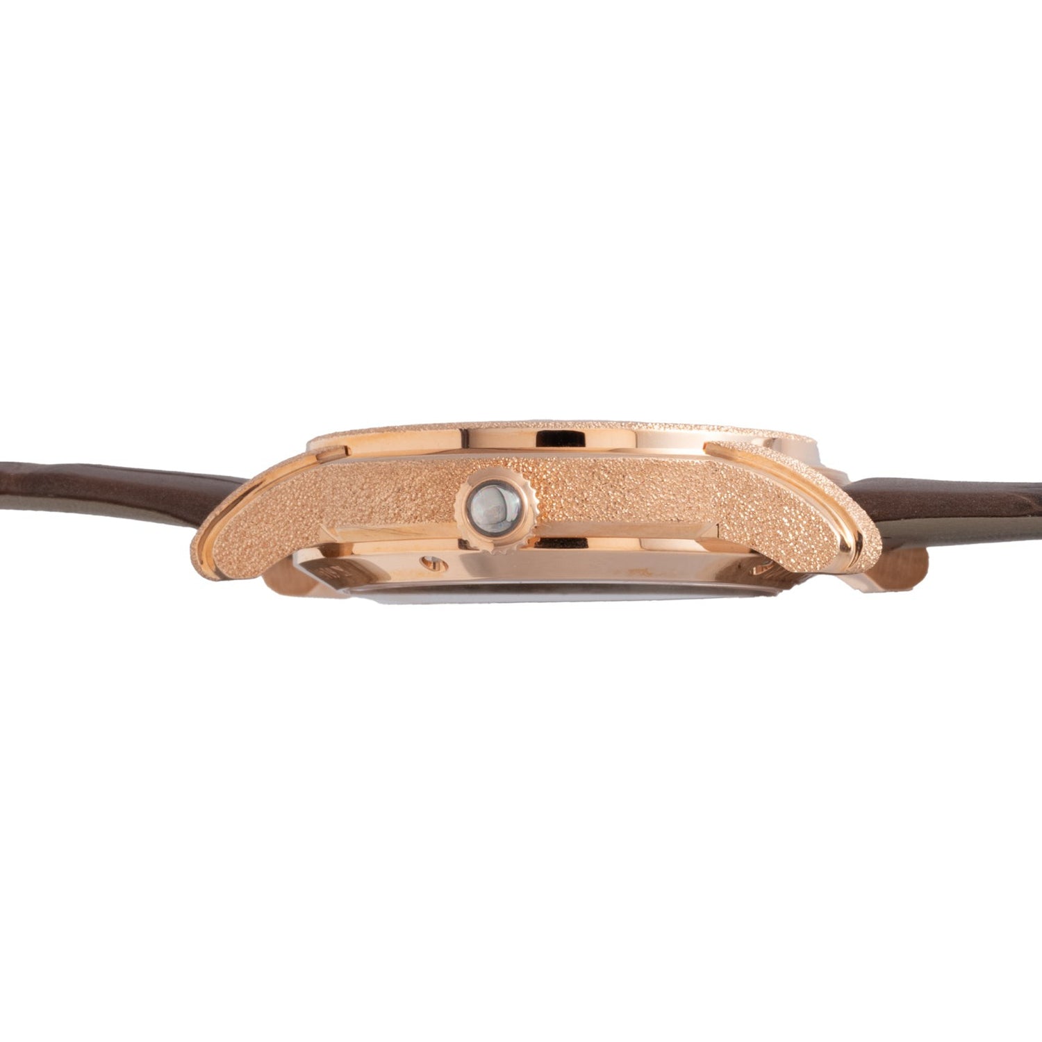 The Millenary Philosophique takes this theme to its natural extreme. This piece, in white gold, is rife with details to obsess over. Influenced by one-handed clocks dating to the 17th century, the Philosophique has just one slow-moving feuille hand that advances around the dial. Intrigue continues with the gorgeous blue dial which has been scalloped and grained in a complex, yet beautiful way making it one of the most subtly-striking dials on the market. The 18K rose gold case has been hand hammered to produce a frosted finish almost giving the case a gem set look, but in actuality, it’s merely achieved by hammering the smooth surface to produce a grain-texture finish.