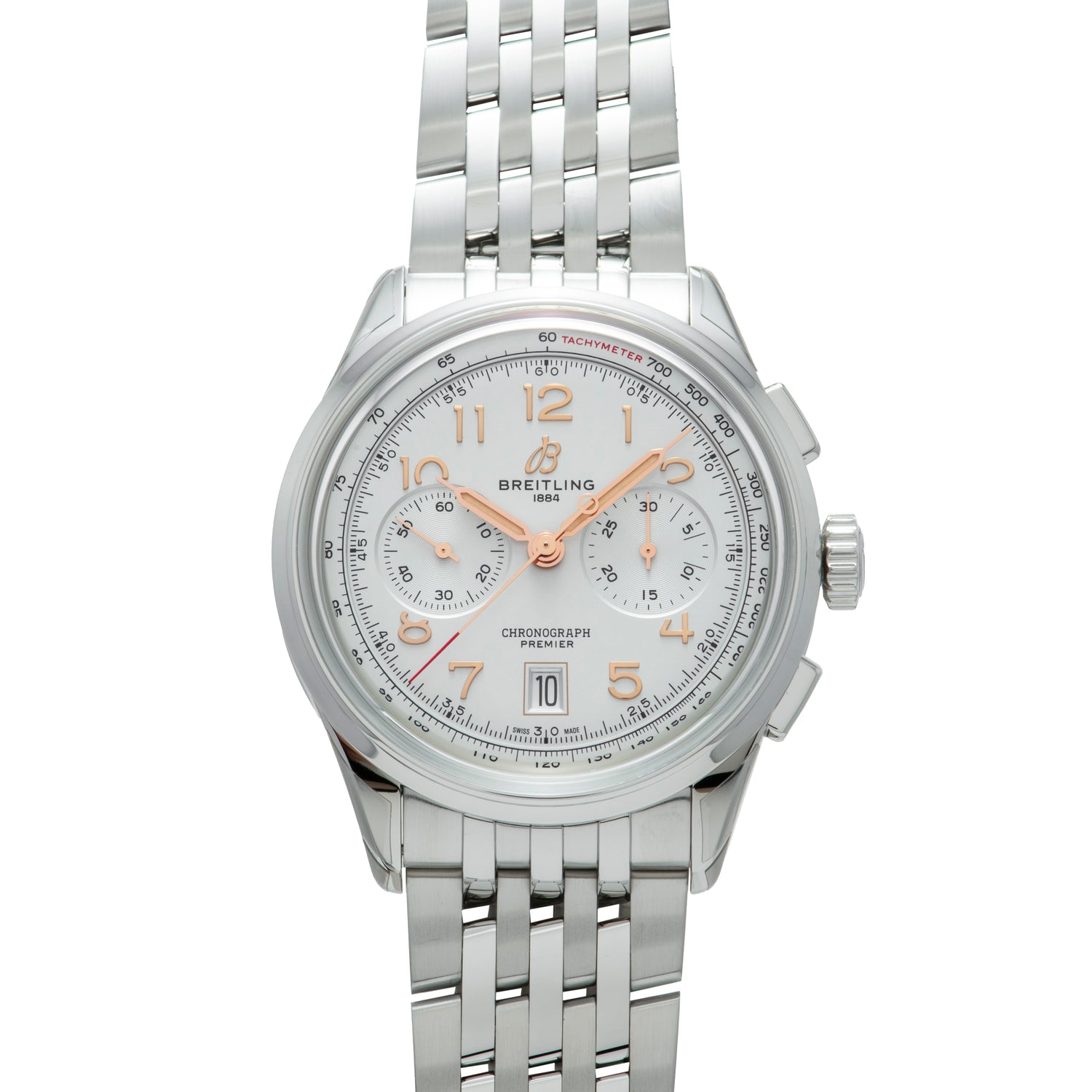 Housed in a 42mm stainless steel case with stepped flanks, a sapphire crystal, a signed crown, dual ‘cushion’ pushers, and a polished bezel, this Premier features crisp, luminous silver dial with applied Arabic indices in a vintage typeface, dual recessed chronograph totalizers, an outer tachymeter scale, a 6 o'clock date window, and a luminous 'syringe' handset with vintage-colored lume.