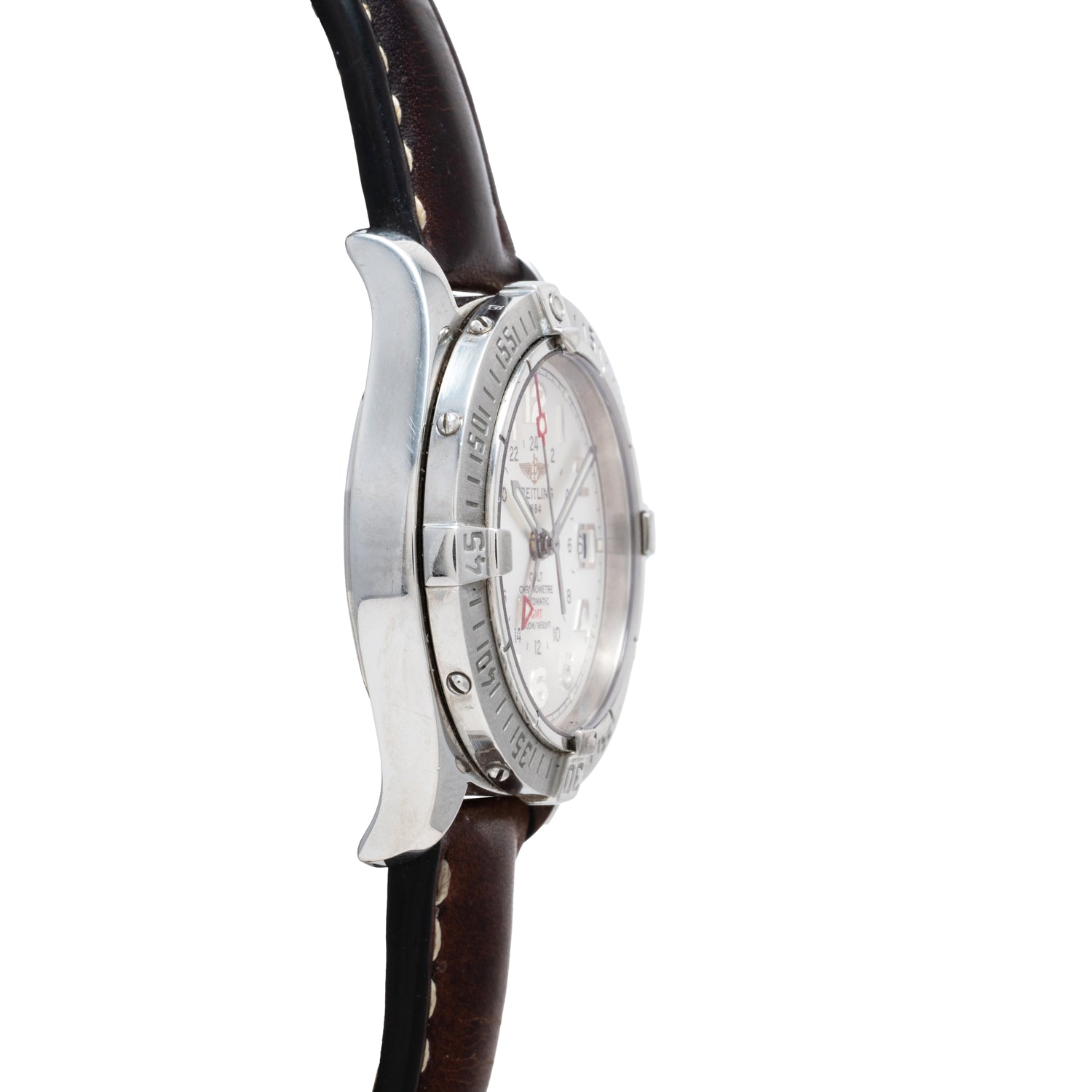 This particular variant, a Reference A32350, dates to the circa 2010s. Housed in a 40.5mm stainless steel case with a sapphire crystal, a signed crown, and a steel unidirectional timing bezel with Breitling’s famed ‘rider tabs’ for easy grip, it features a matte white dial with applied luminous indices, a matching handset with a red-tipped seconds hand and red GMT hand, an inner 24-hour scale, and a date window at 3:00.
