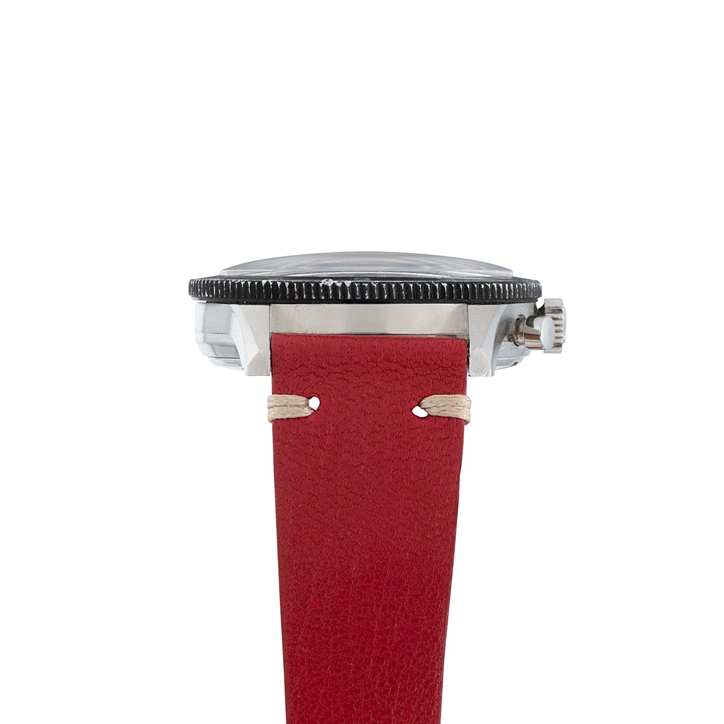 Powered by a Venus Calibre 178 manual winding chronograph movement, this piece comes fitted to one of our red Analog:Shift Montone leather straps with a steel pin buckle.