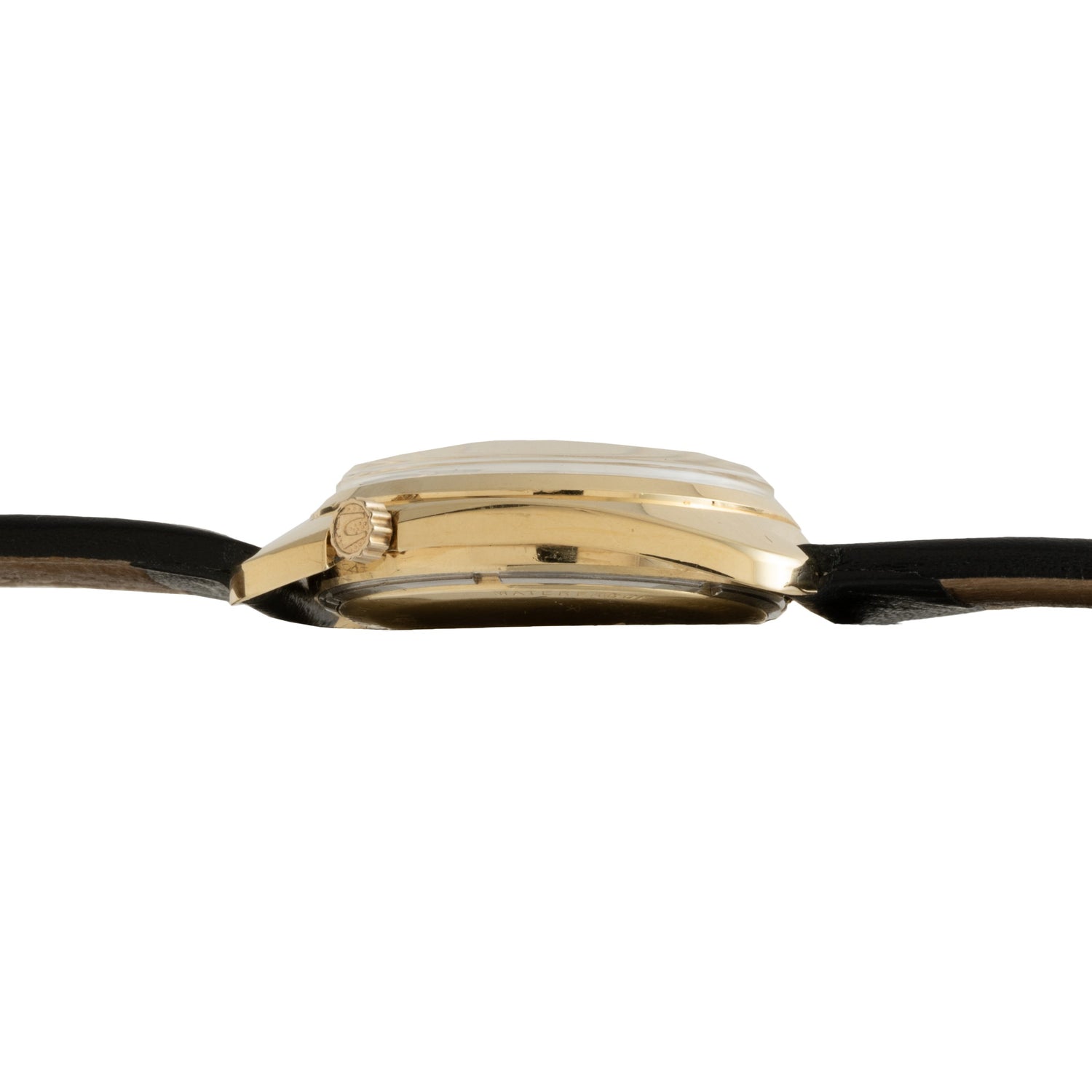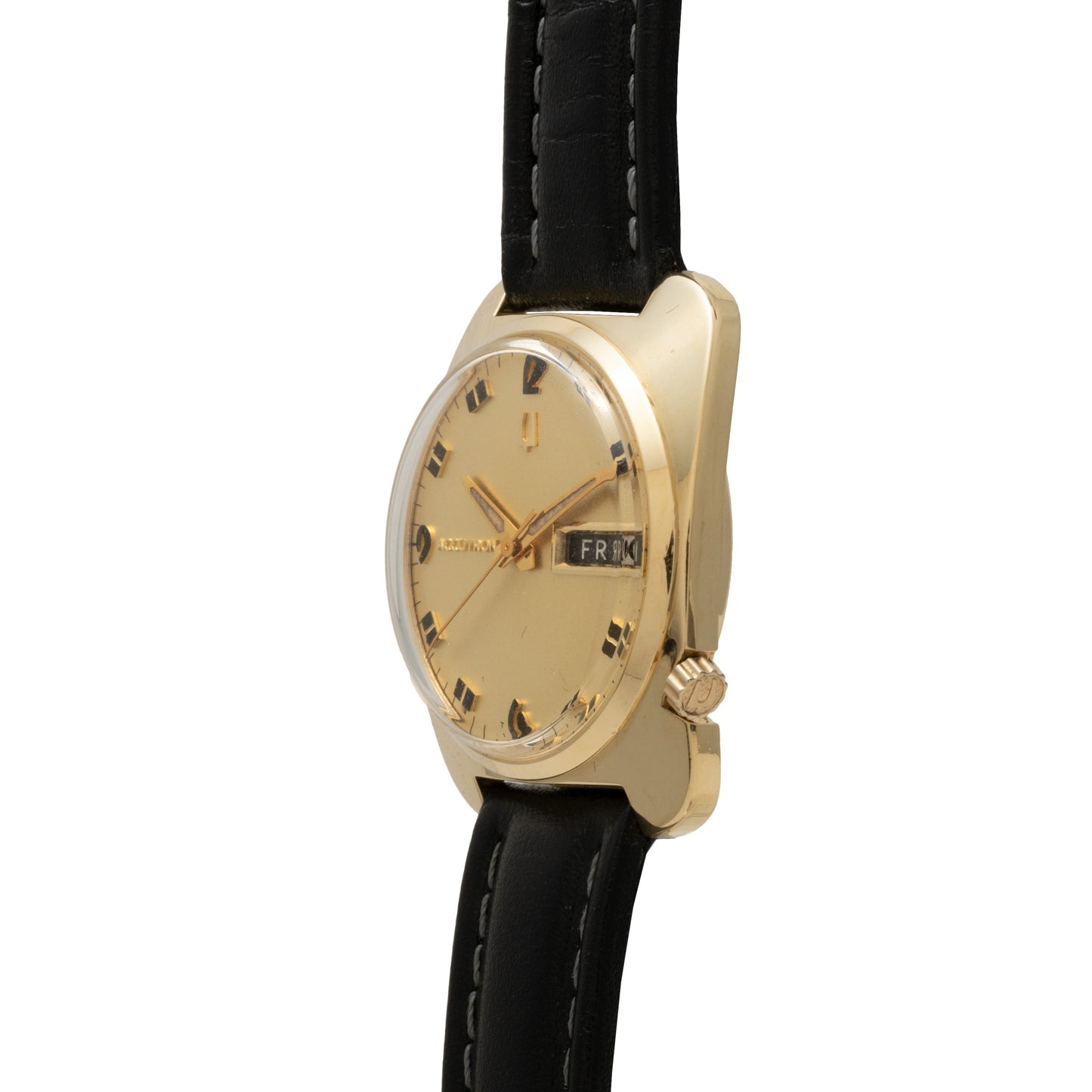 Housed in a 14K gold 'cushion' case with a domed acrylic crystal and a screw-down case back, it features a stunning 'sunburst' dial with Arabic numerals and applied stick indexes, an applied Accutron logo counterbalanced with the Day Date complication. No matter your mechanical-movement inclinations, there is no denying that tuning fork movement is a one-of-a-kind piece of horological history.