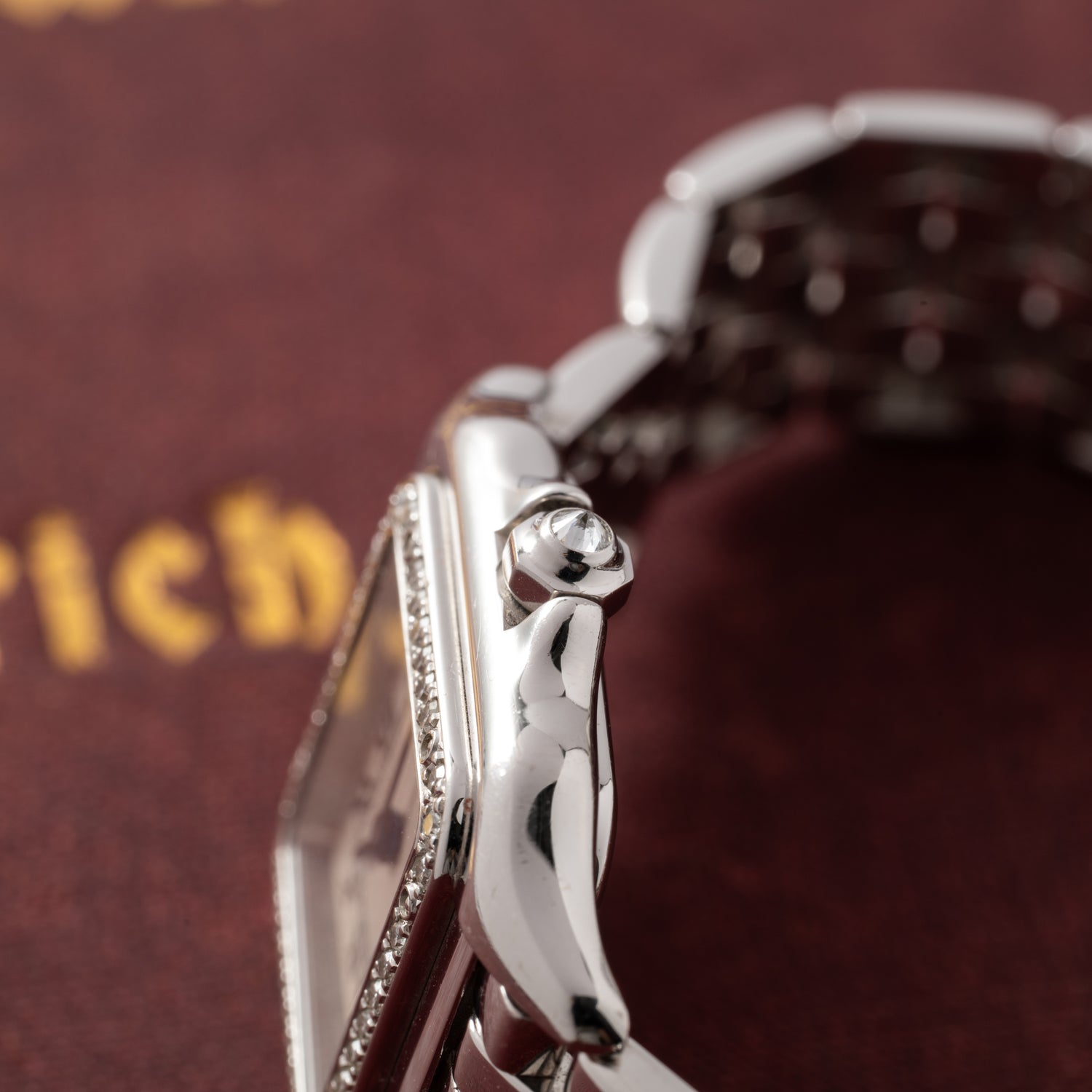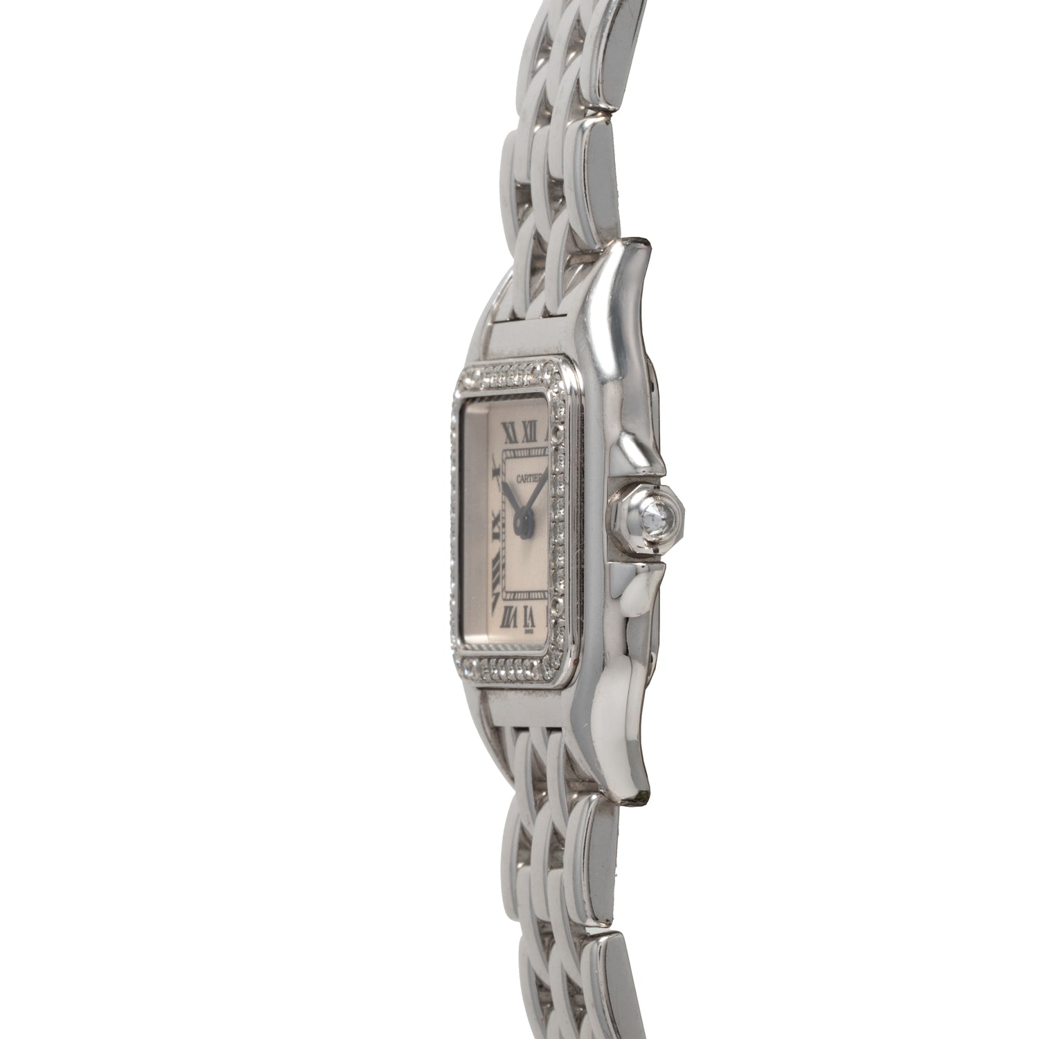 Powered by a quartz movement and paired to a matching, white gold multi-link bracelet, this svelte wristwatch is the very essence of Cartier: beautiful, elegant, and lasting.