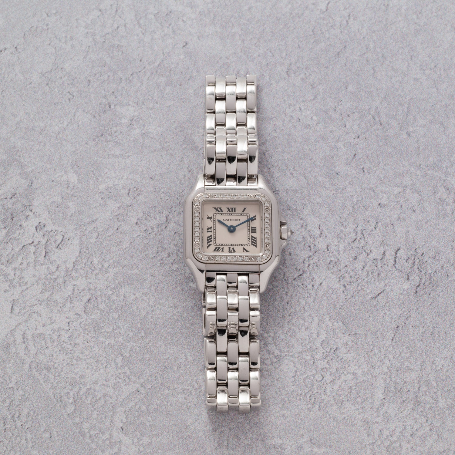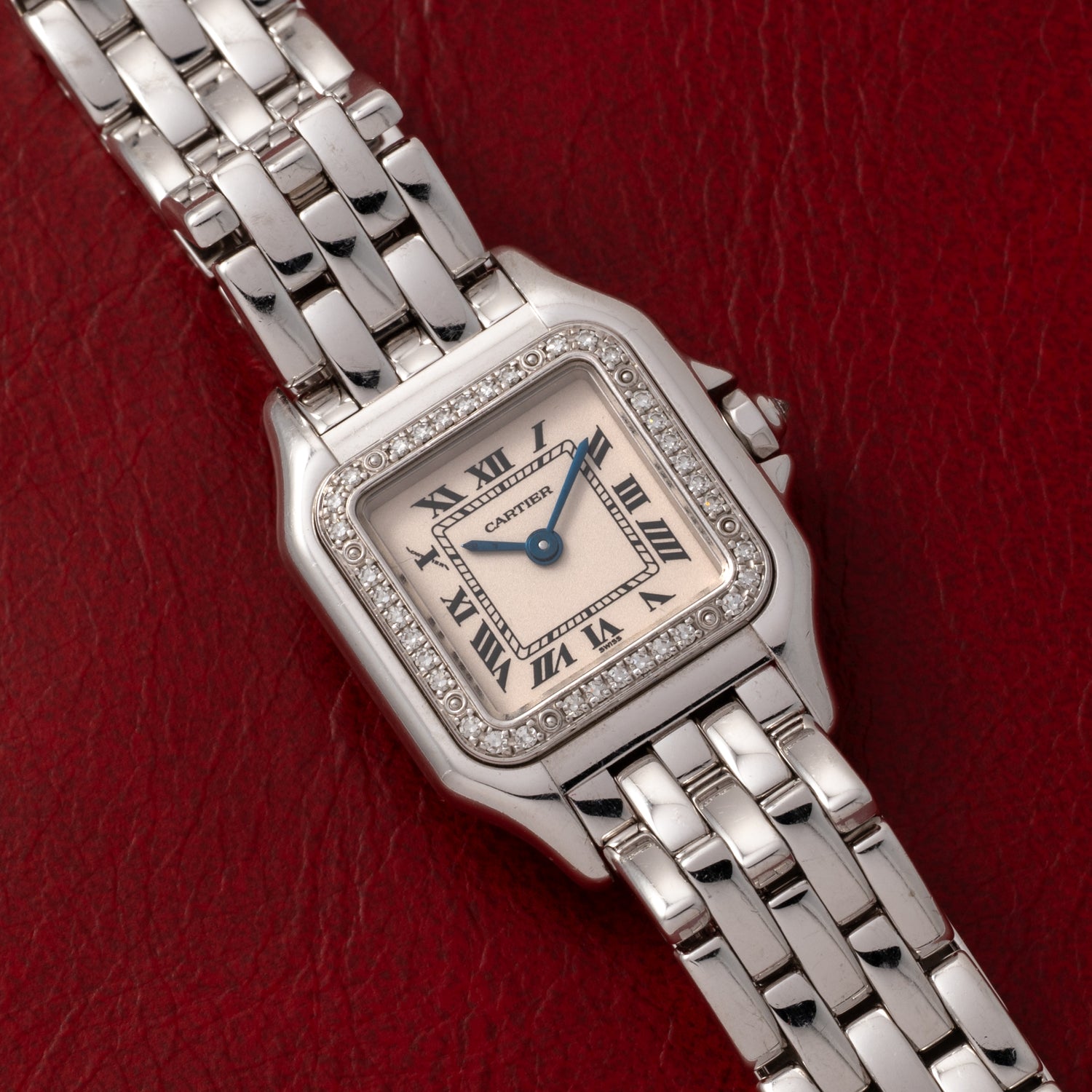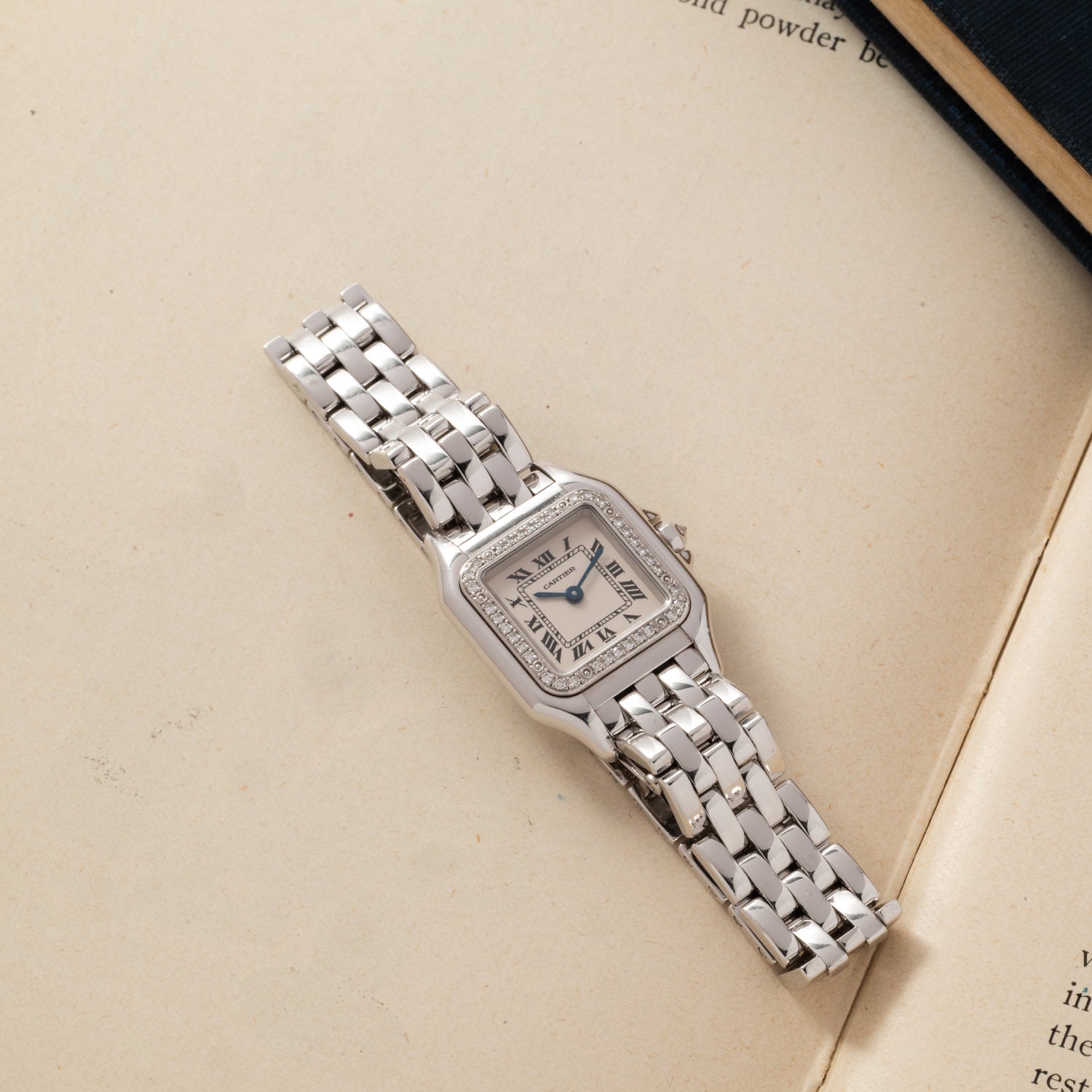 Over a century later, the Panthère line is still a fixture in the Cartier catalog, and the big cat motif appears frequently on watches, jewelry, and more. This particular Panthère de Cartier is a ladies’ wristwatch in the brand’s 'mini’ size. Housed in a 22mm white gold case, a sapphire crystal, and a stepped bezel with diamond settings, it features a silver Roman dial and a matching blued-steel ‘sword’ handset.