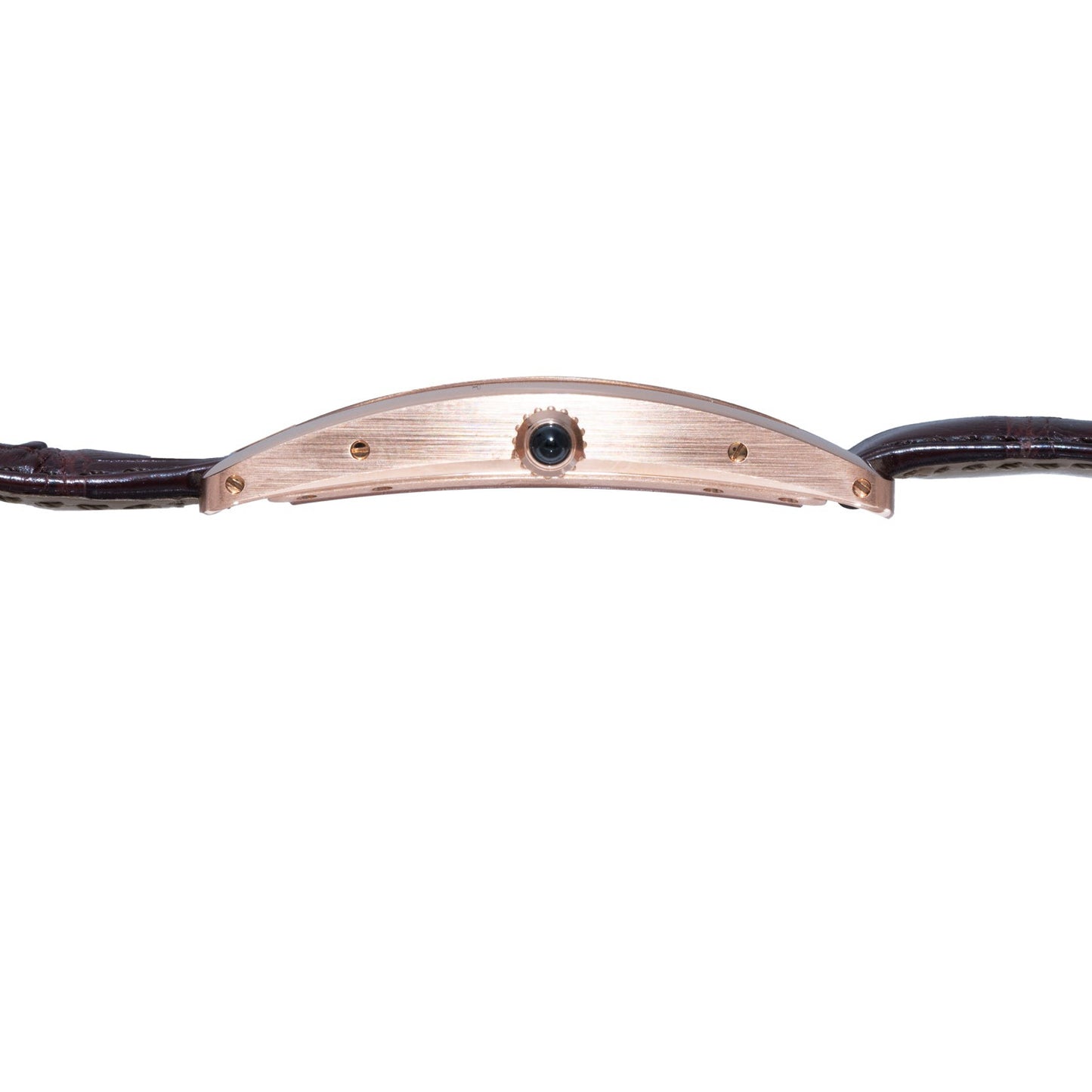 This particular Cintrée ref. 3974, a limited edition of 100 pieces from 2017, features a 23mm 18K rose gold curved case with a curved crystal to match, a sapphire cabochon crown, and Cartier's signature blued steel handset.