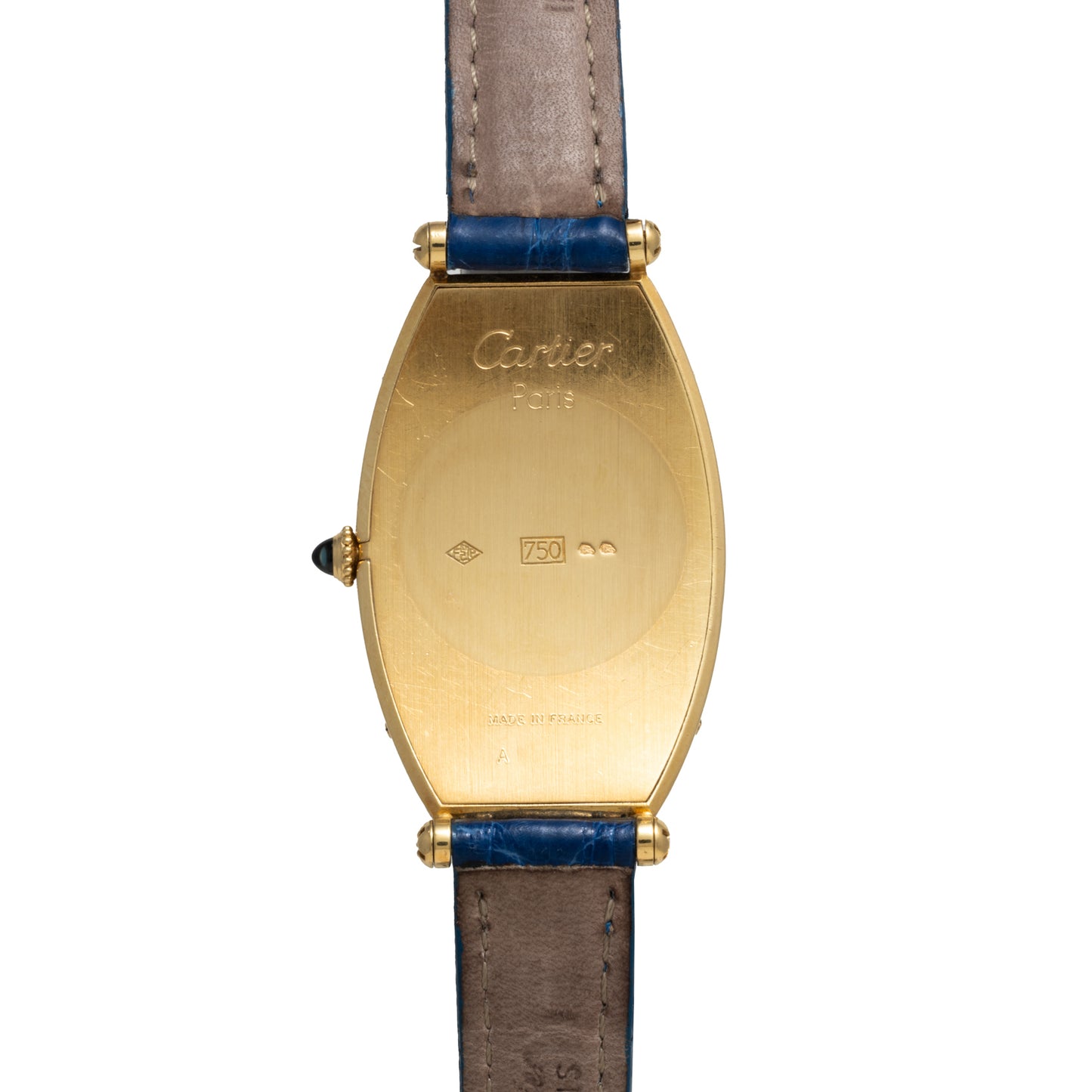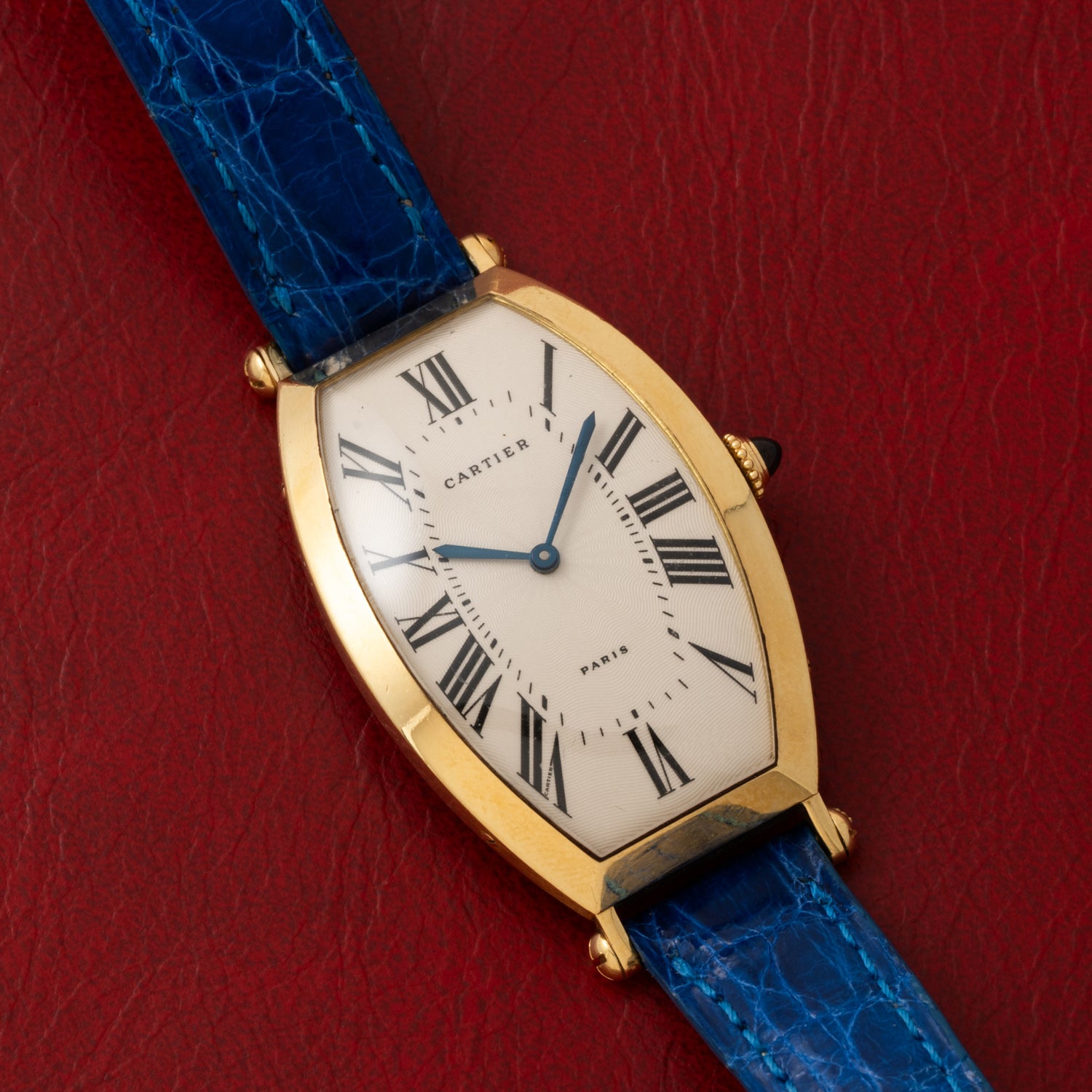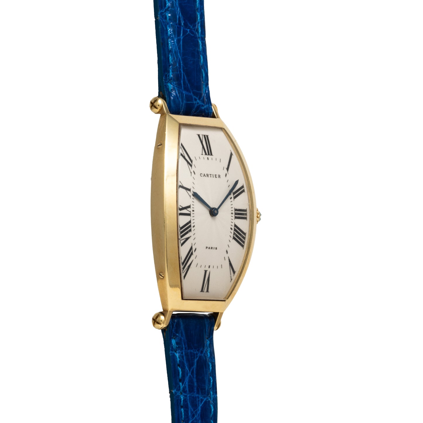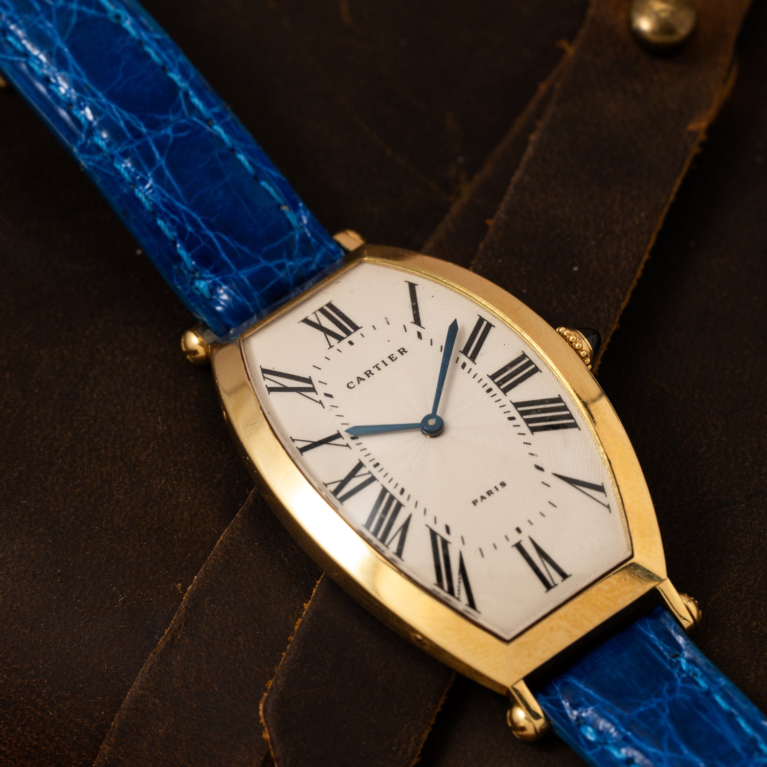 This particular example, a Tonneau model, dates to circa 1990s and features a 26mm 18k yellow gold case with a wildly cool, curved crystal, a lovely white guilloché Paris-signed dial with printed 'Roman' indices, a matching blued-steel 'sword' handset, and Cartier’s ubiquitous sapphire cabochon crown.