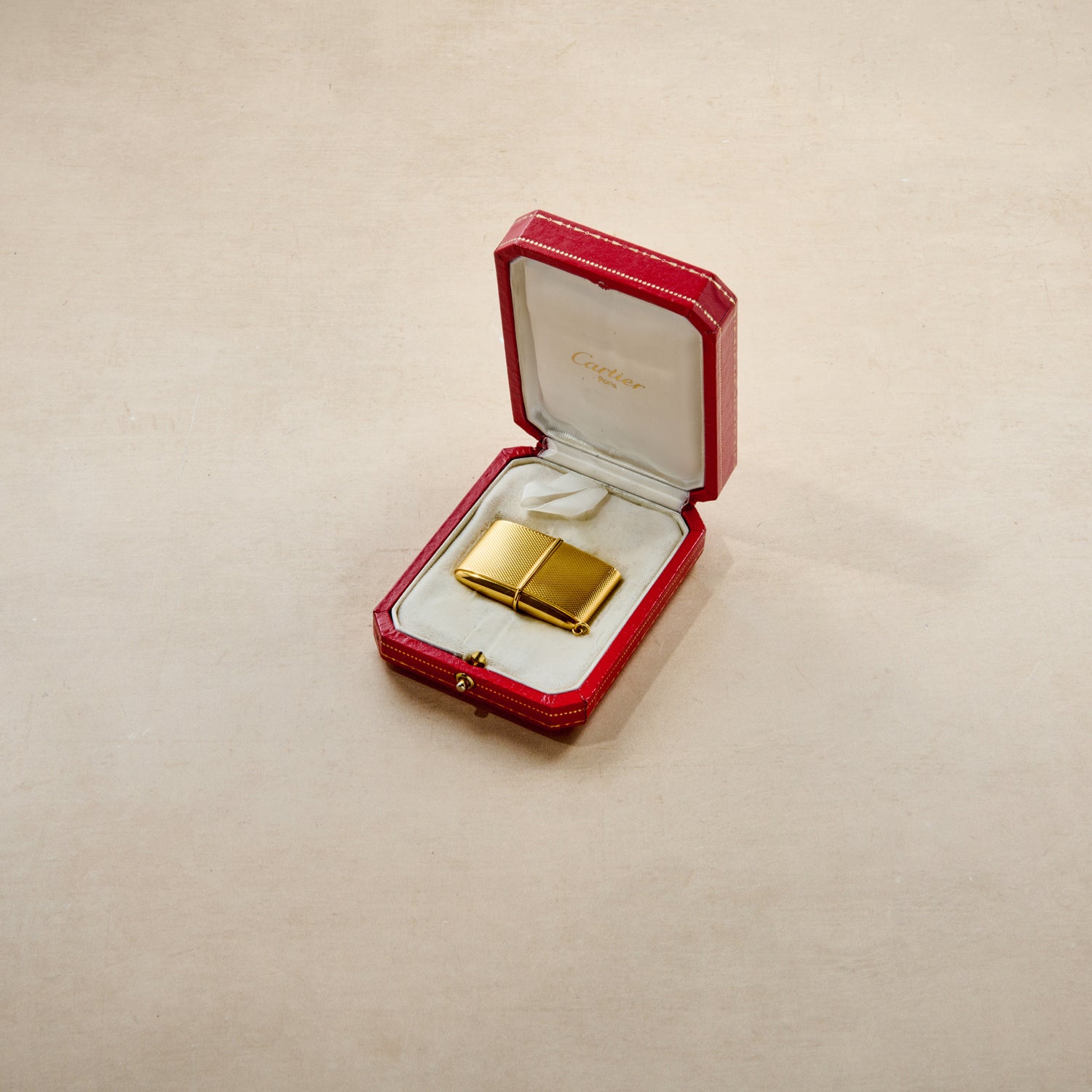 Measuring 50mm x 36mm in its compact form, this Normal-sized model features a solid 18K gold enclosure finished in a beautiful embossed texture. What's more, this is no typical Ermeto, but a version retailed by famed Parisian jeweler Cartier: Its multi-tone silvered dial features an outer open minute track, applied gold 'dart' and 'Arabic' indices, and an inner section double-signed by both the manufacturer and the retailer. Finished with a gold 'dauphine' handset, this spectacular piece in excellent condition is powered by a hand-cranking movement from Movado that is wound via the 12 o'clock crown.
