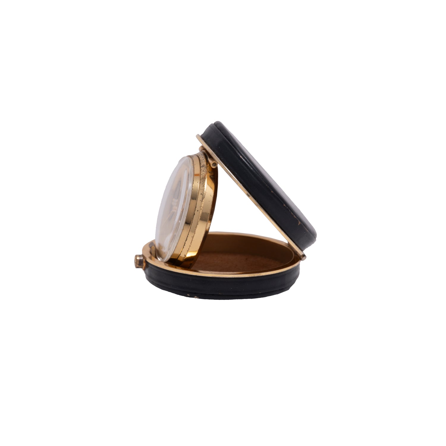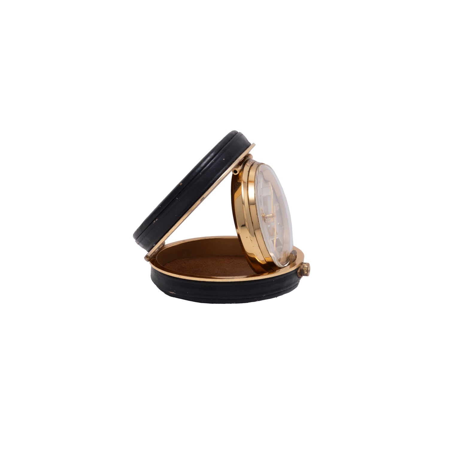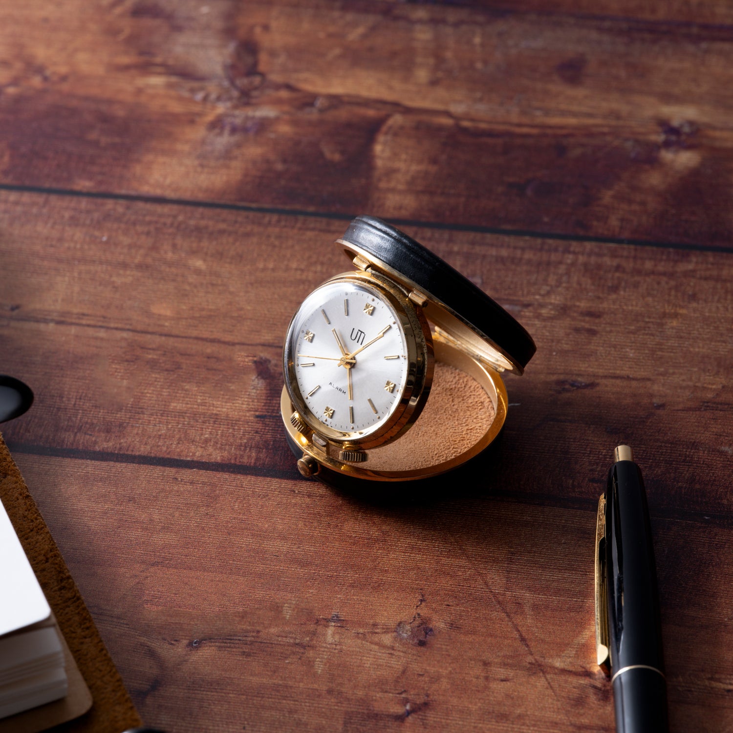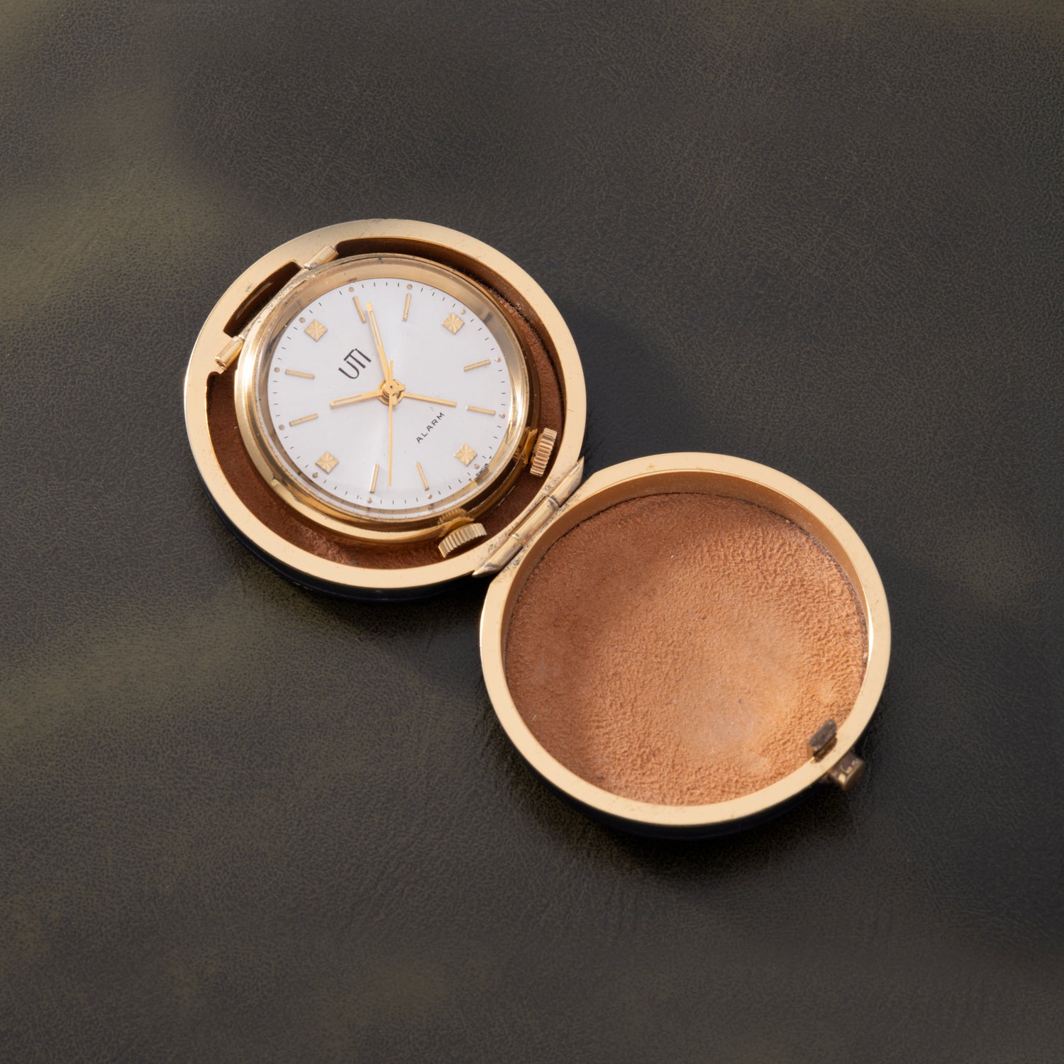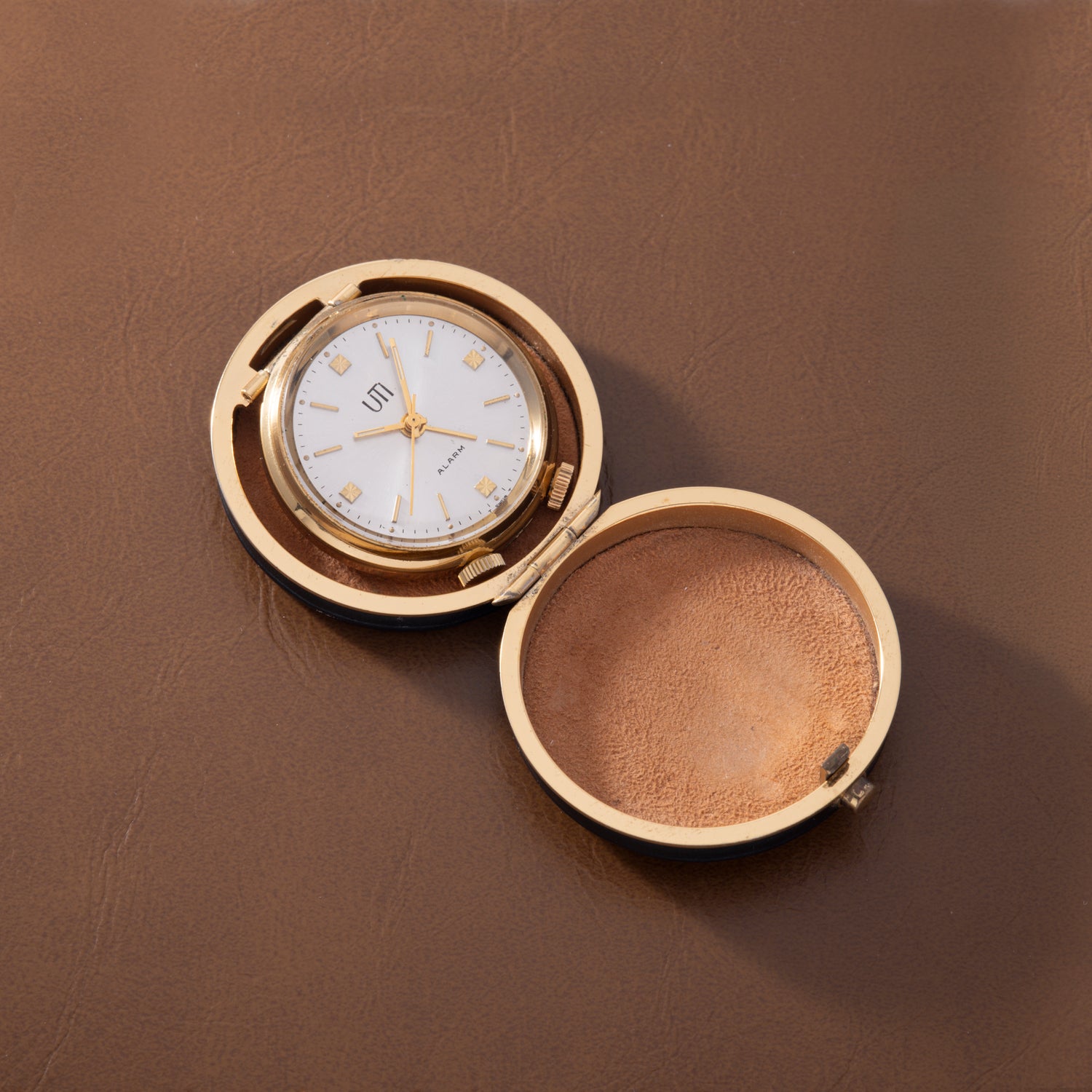 Dating to the 1950s, this handsome travel alarm clock is from UTI (or UTINAM), a defunct French manufacturer that designed beautiful pocket and railways stopwatches before its purchase by Matra in 1984. Mounted within a 46mm black leather and brass hinged pouch with a 'push-button' closure, it consists of a 35mm 'gilt' brass and chrome snapback case with twin unsigned crowns at 5 and 7 o'clock and an acrylic crystal. Paired to this is a handsome silver 'sunburst' dial with applied 'gilt' indices and luminous tritium plots, a luminous 'obelisk' handset, and non-luminous seconds and alarm indicator hands.