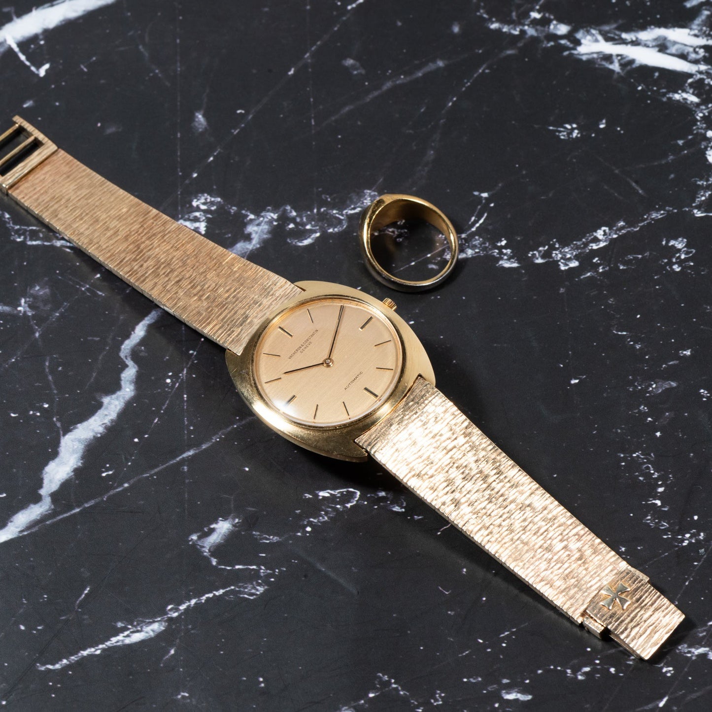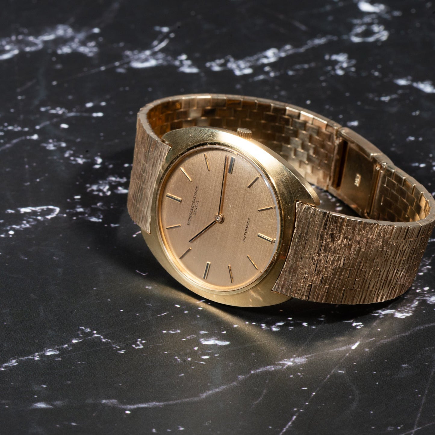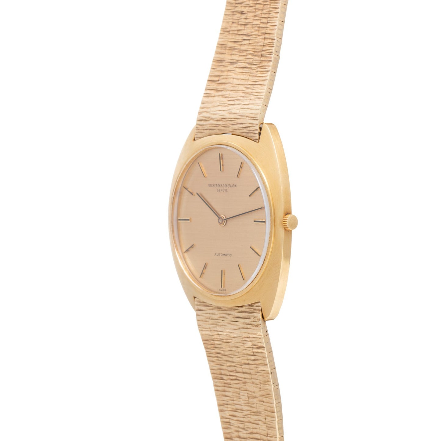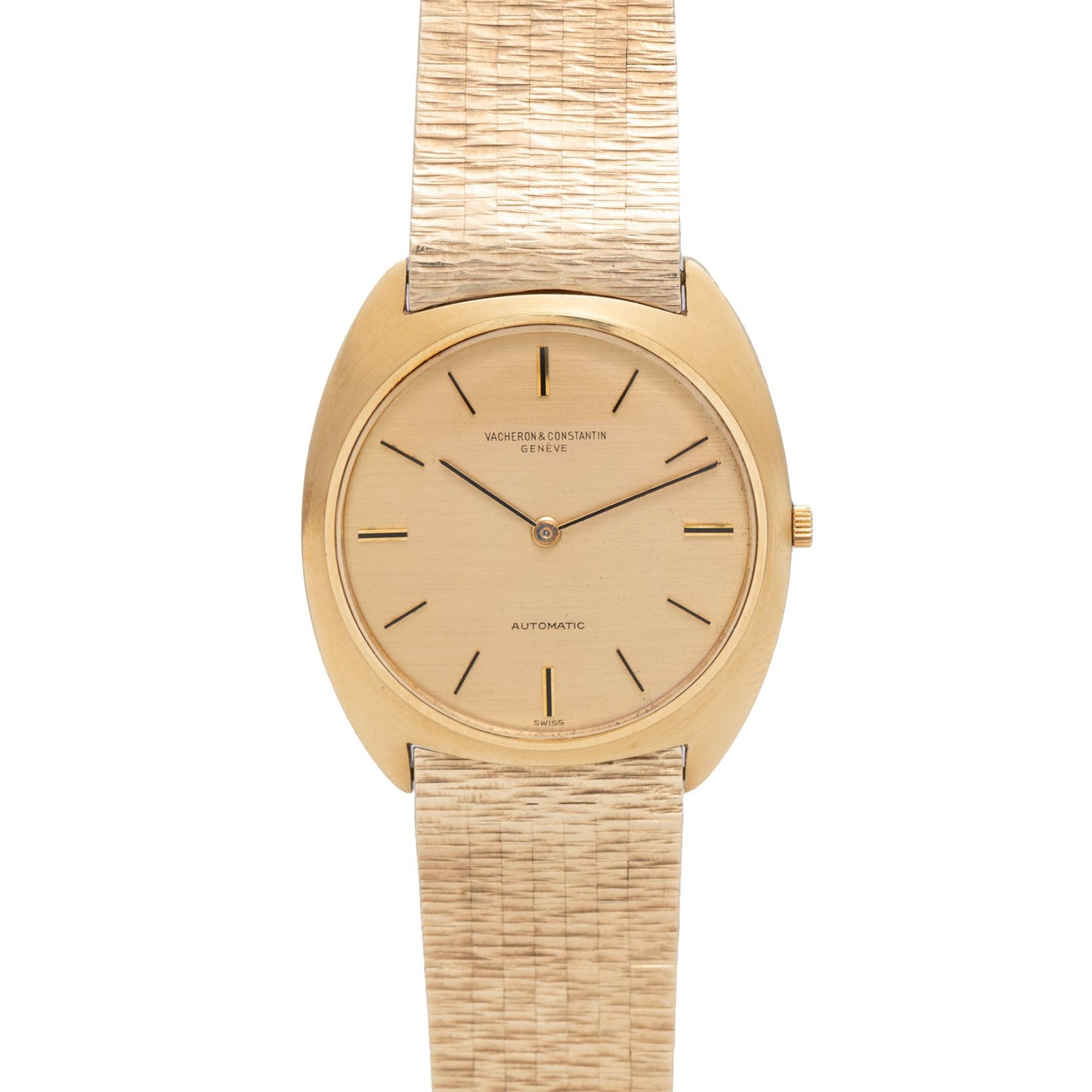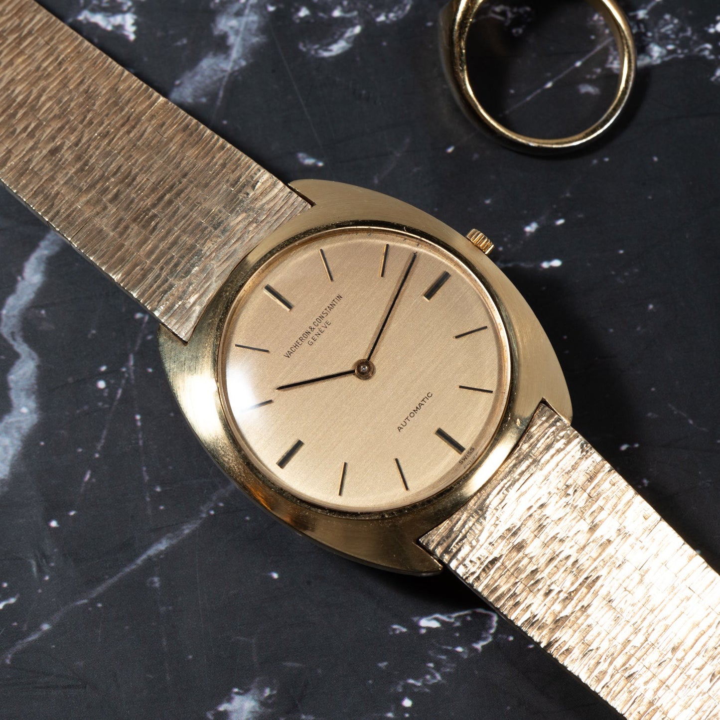 This particular watch, a Reference 7595, dates to the 1970s and features an 18k yellow gold 'cushion' case housing a lovely brushed champagne dial with applied indices, pencil handset, and Vacheron's Calibre K1121 automatic-winding movement within.