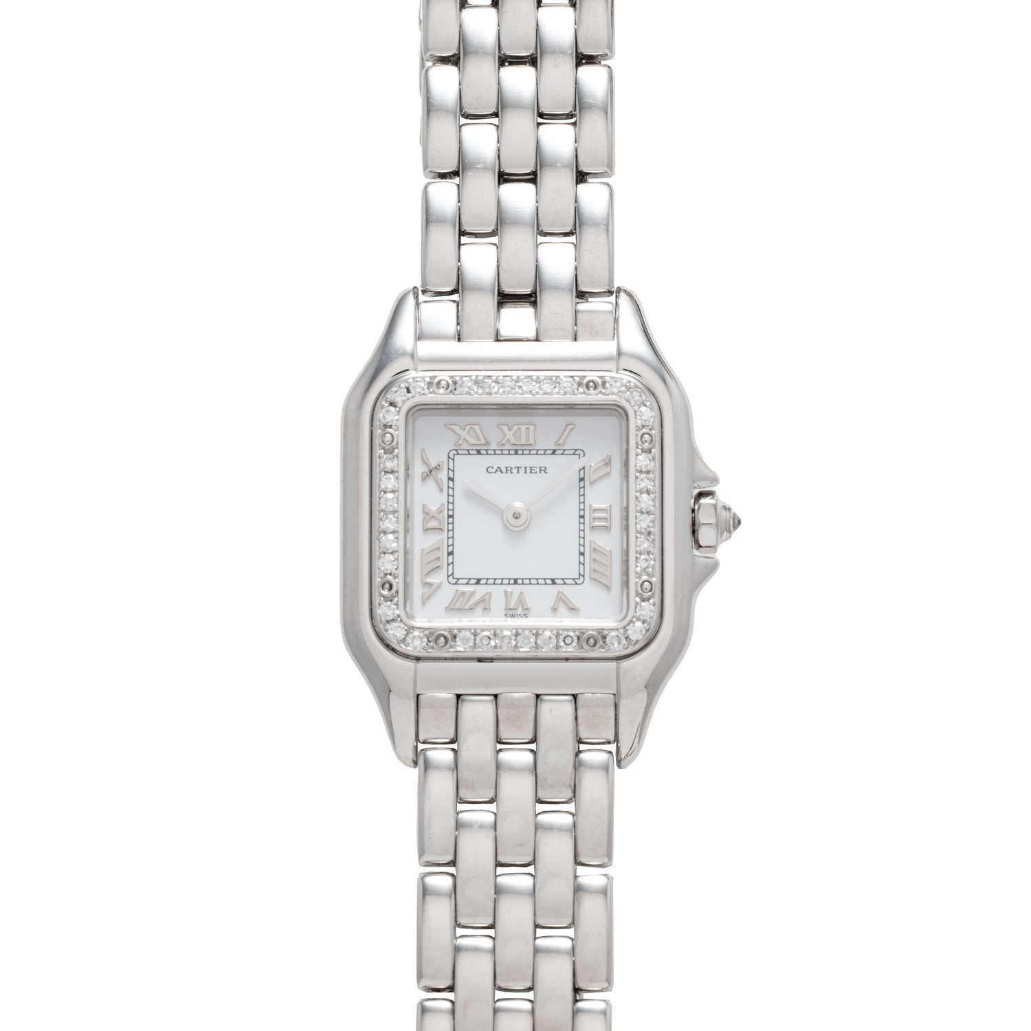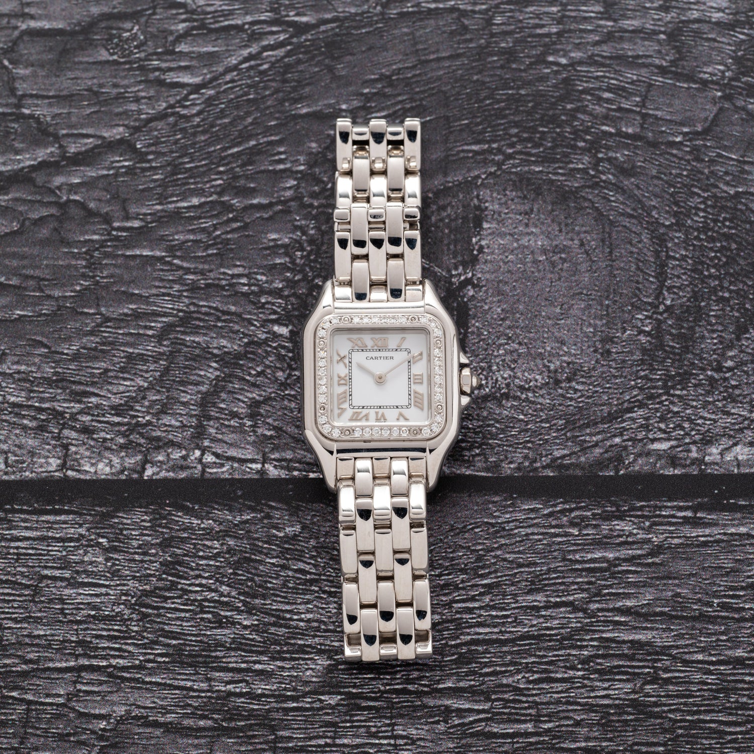 Over a century later, the Panthère line is still a fixture in the Cartier catalog, and the big cat motif appears frequently on watches, jewelry, and more. This particular Panthère de Cartier is a ladies’ wristwatch in the brand’s 'Small’ size. Housed in a 22mm white gold case, a sapphire crystal, and a diamond-set stepped bezel, it features a silver Roman dial and a matching white gold ‘sword’ handset.