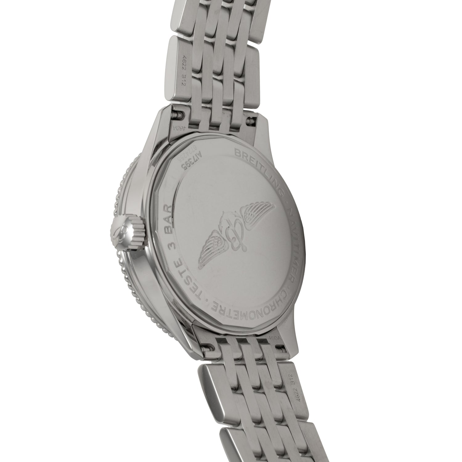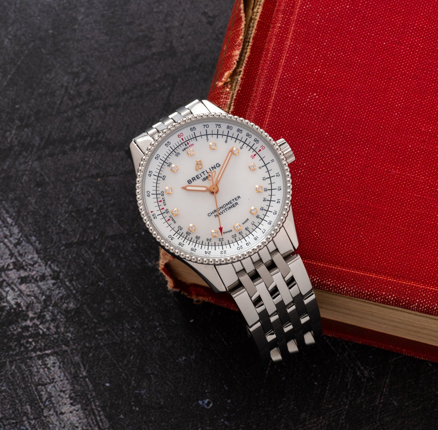 In the decades since its introduction, the Navitimer collection has seen countless variations that offer a wide range of design features, materials, complications and casing materials. This example, a Reference A17395 offers a 35mm stainless steel case and features a sapphire crystal, signed crown and a bi-directional internal rotating bezel displaying a slide-rule navigational scale. Its stunning mother-of-pearl dial features a peripheral speed scale, applied, factory diamond set markers and a luminous handset, a red-tipped center seconds hand, and a dimpled bezel.