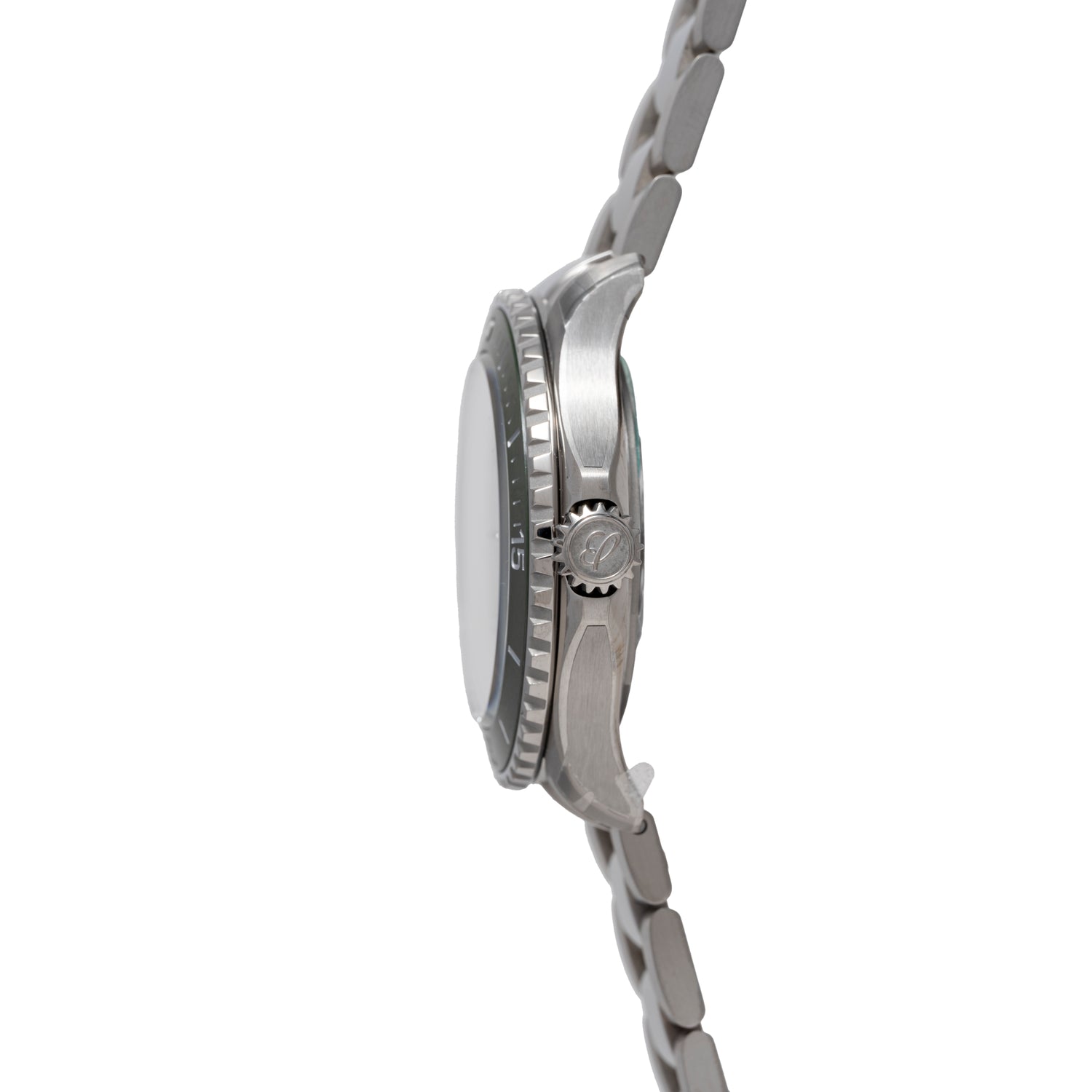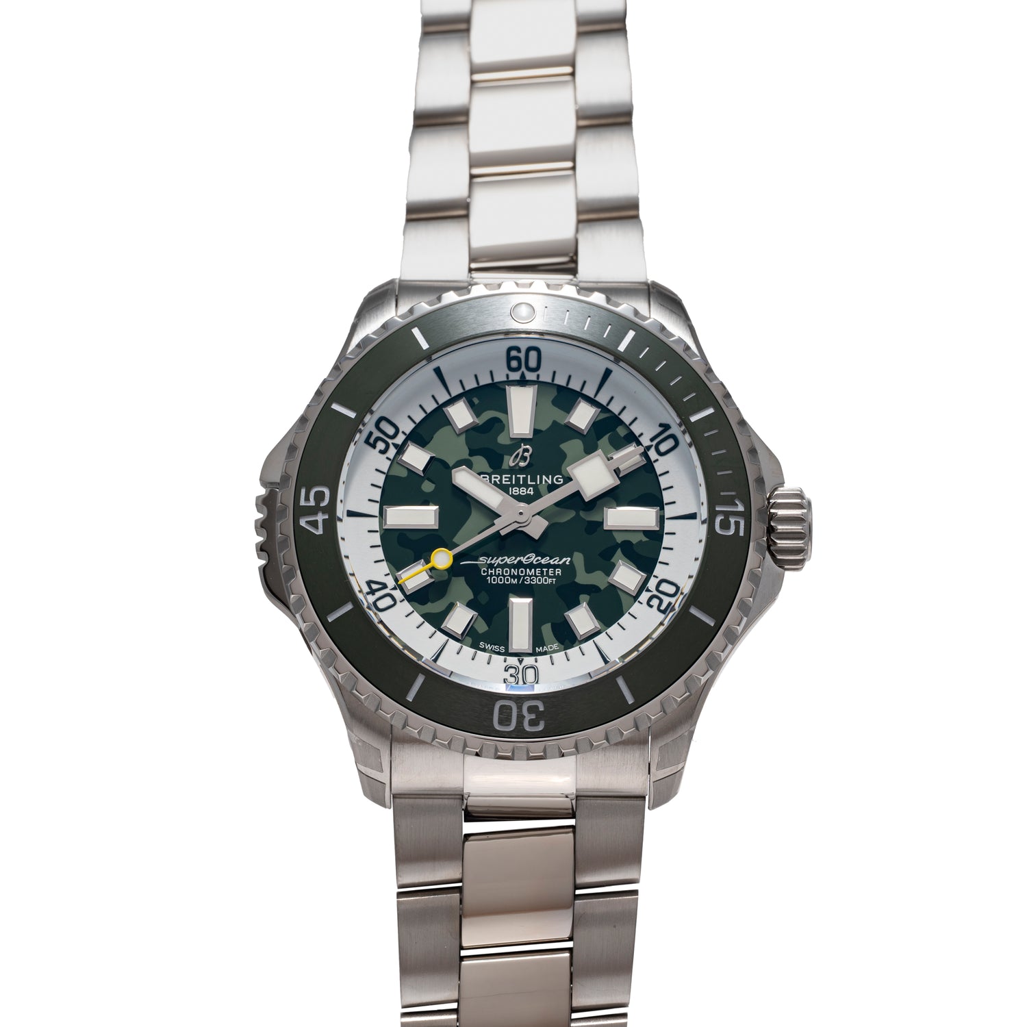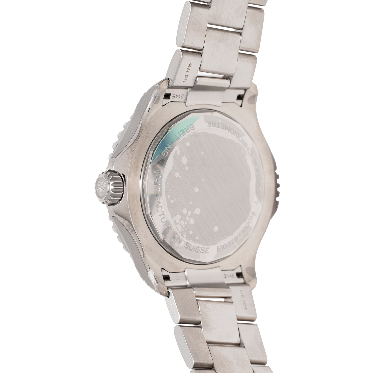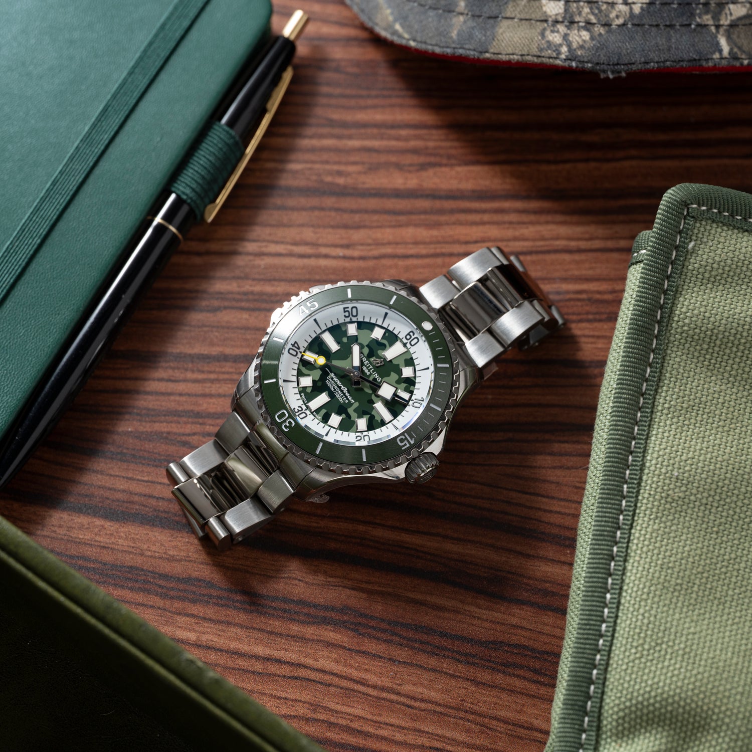 Housed in an unabashedly substantial (but similarly light) 46mm titanium case with a polished, green ceramic timing bezel; a signed, screw-down crown; a sapphire crystal; a bezel-locking mechanism at 9 o’clock; and Breilting’s signed, ‘slant-link’ bracelet with a signed, push-button deployant clasp, it's certainly one of the most capable pieces on the market.