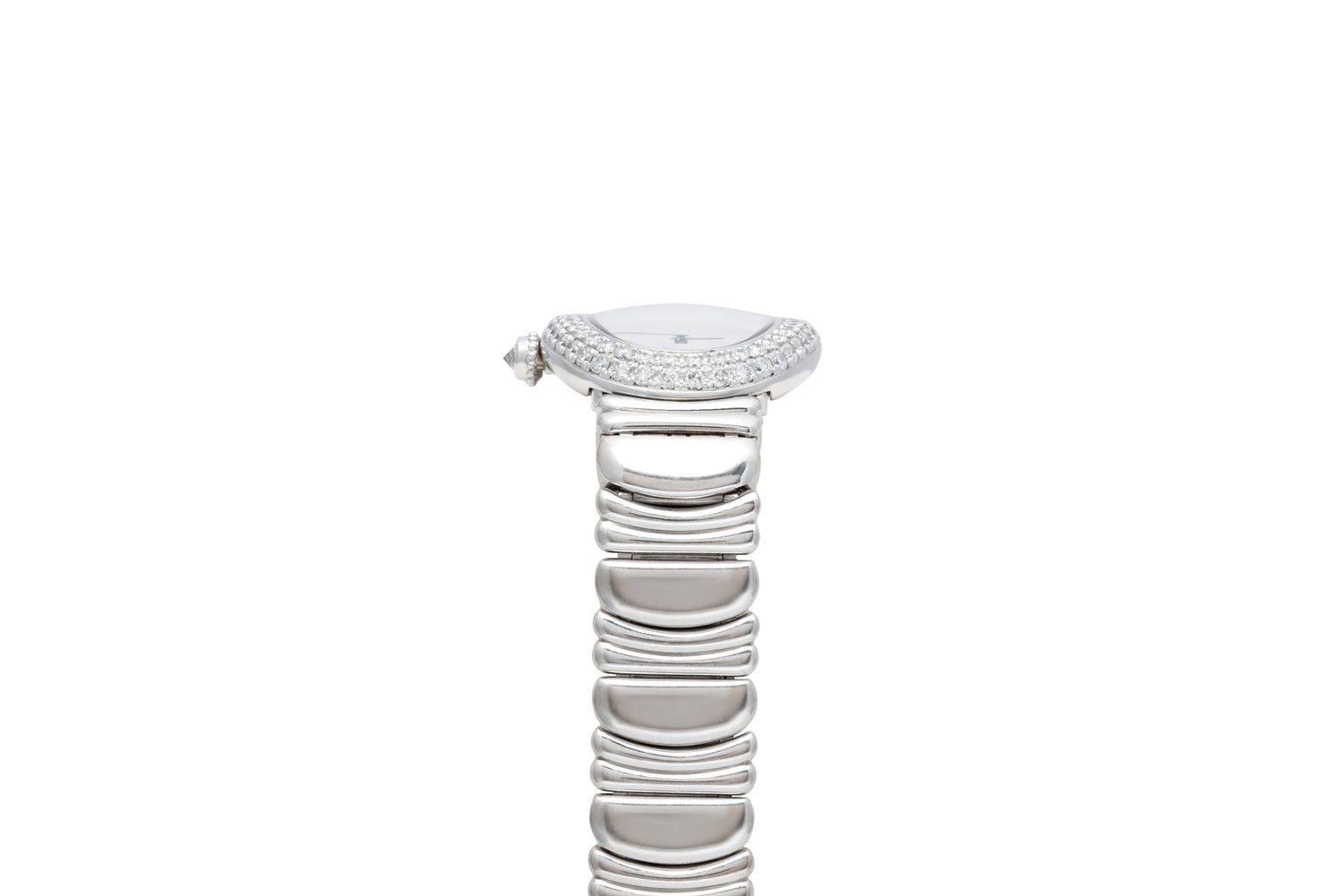 This particular example dates back to the early 2000s and features a 22mm x 30mm solid 18K white gold case with a factory-set diamond bezel, diamond cabochon setting crown, sapphire crystal, a creamy eggshell-white dial with printed black Roman indices and a matching 'sword' handset, and is fitted to a stunning stylized solid gold bracelet with a hidden, double fold-over deployant clasp.