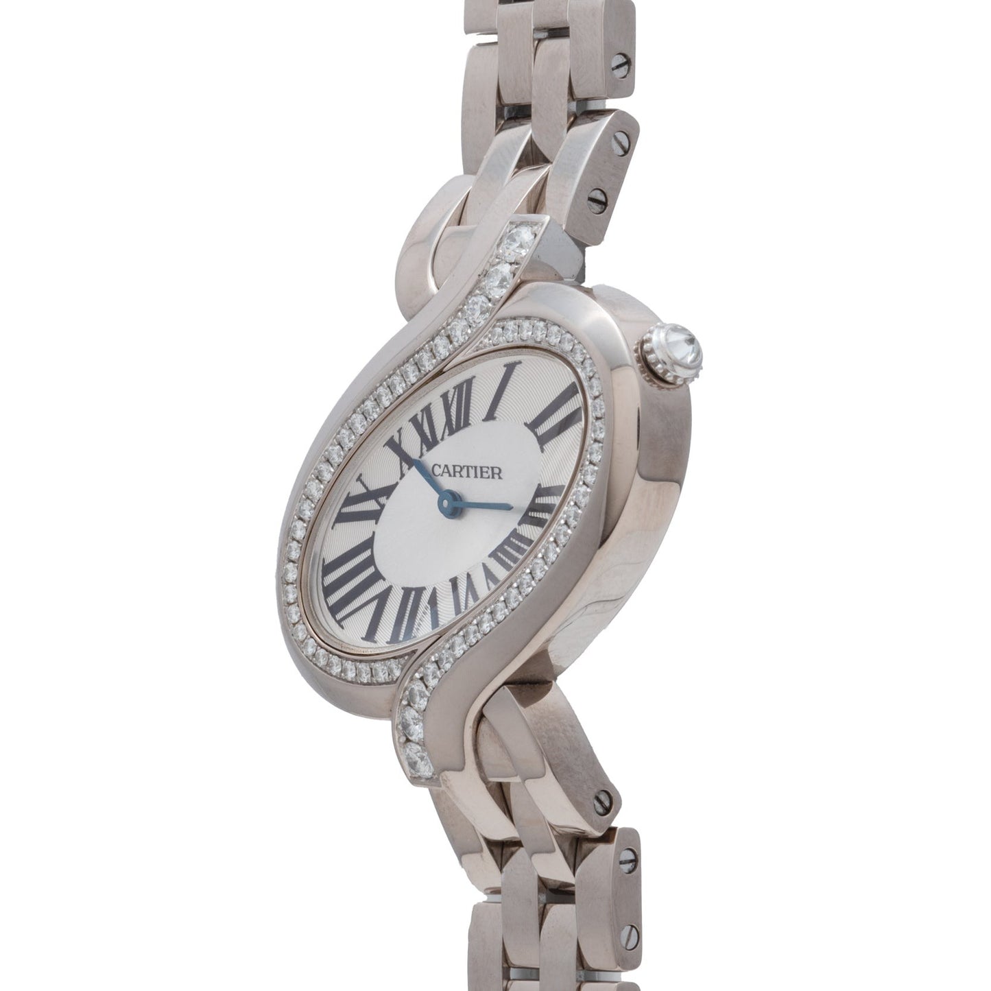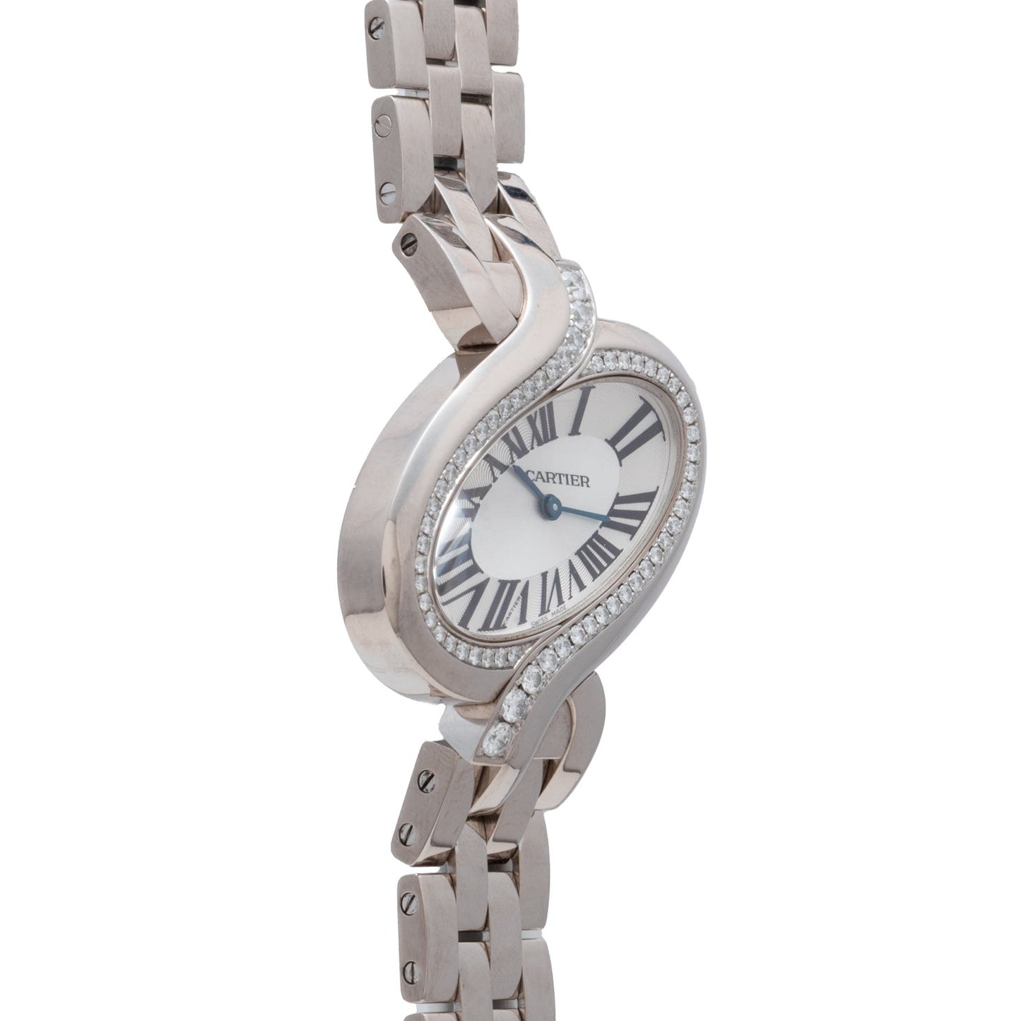 Fitted with a solid 18k white gold three-link bracelet seamlessly integrated into the case, this lovely piece is powered by Cartier’s Calibre 059 quartz movement and comes with its inner and outer presentation box set.