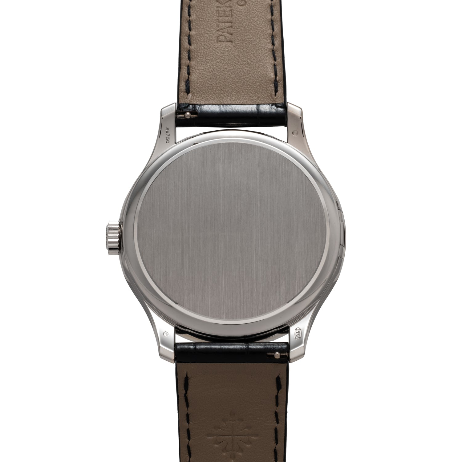 Outfitted to a signed black alligator leather strap with an 18K white gold pin buckle, this piece is an exceptional example of the traditional Calatrava design and the maison’s artisanship. It also happens to come with a signed leather folio, books, pamphlets and its Certificate of Origin.