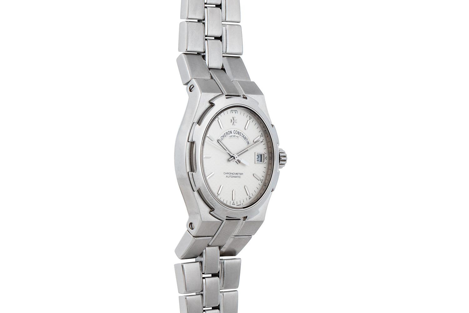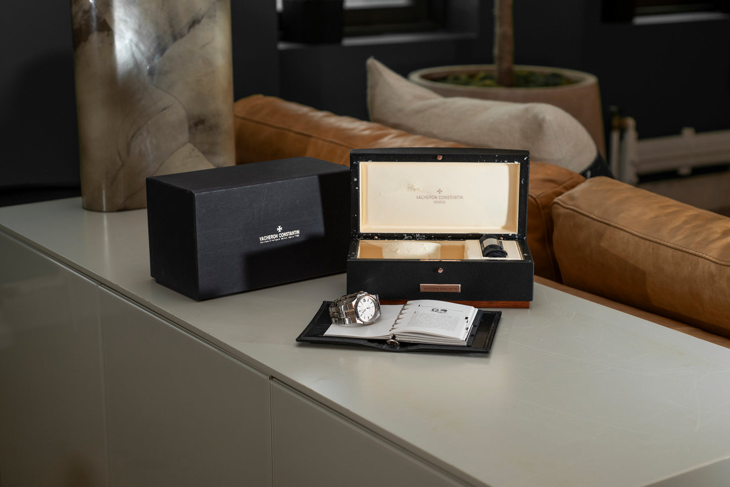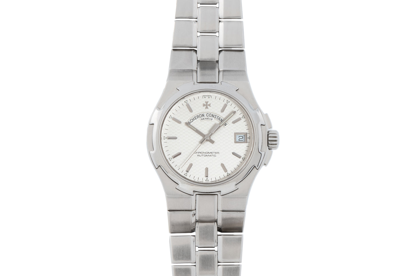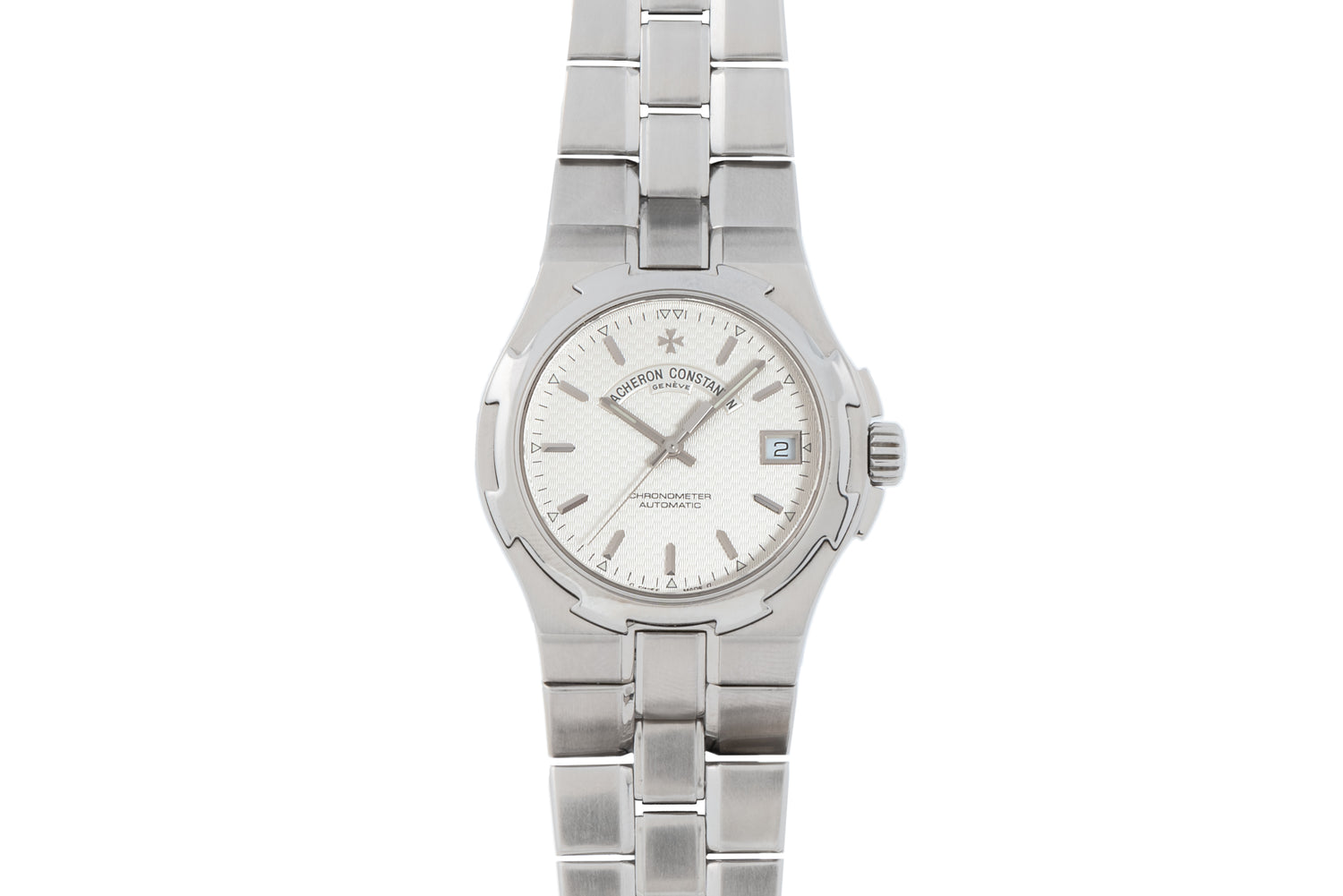 This particular example, an Overseas Reference 42042, dates to circa the early 2000s and features a solid stainless steel case with an integrated style bracelet, a Maltese stylized bezel, and a luminous textures silver dial dial with applied indices and a matching handset.