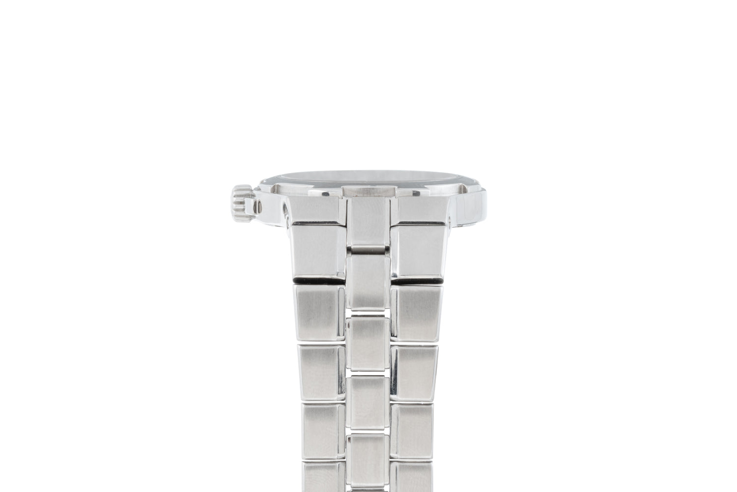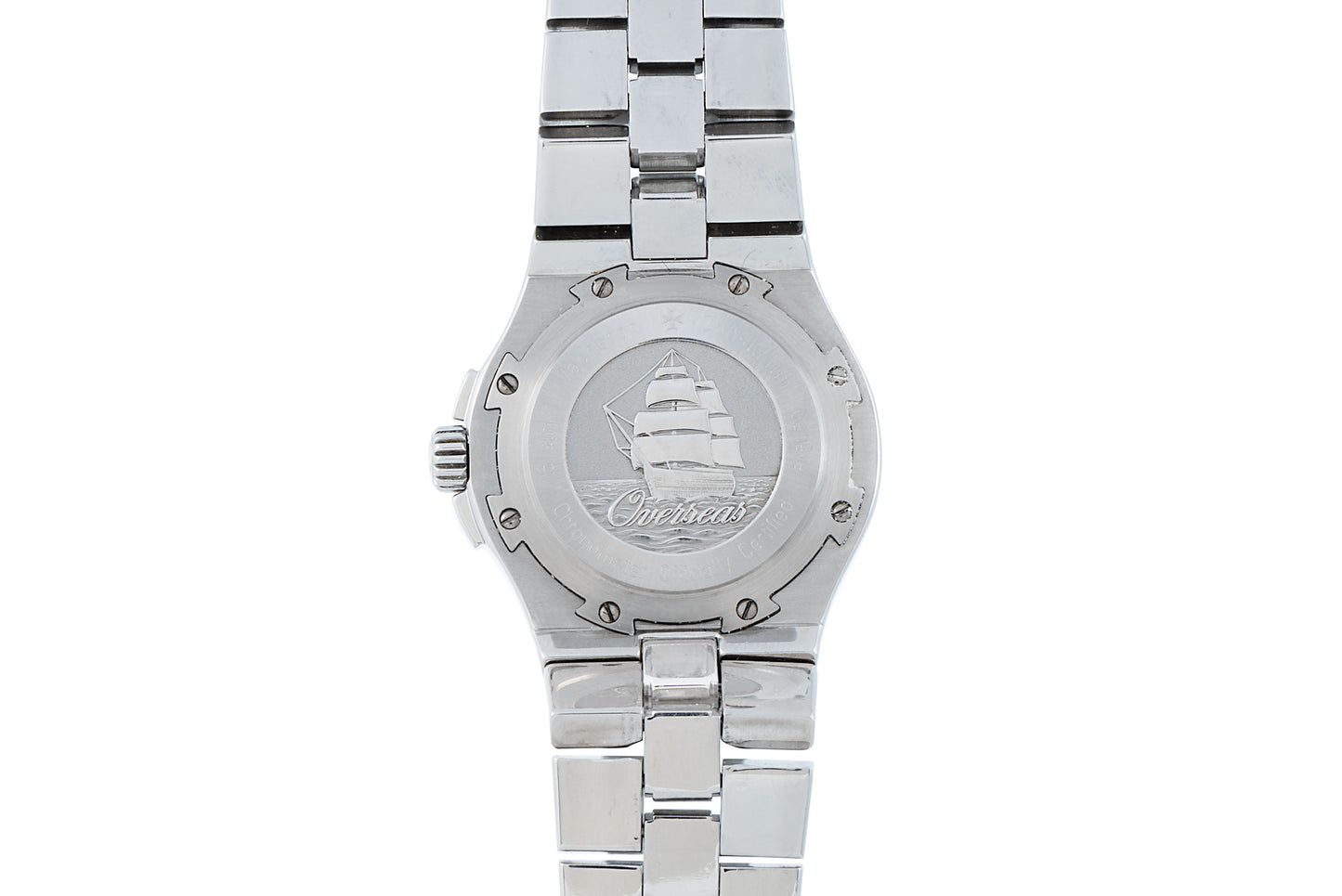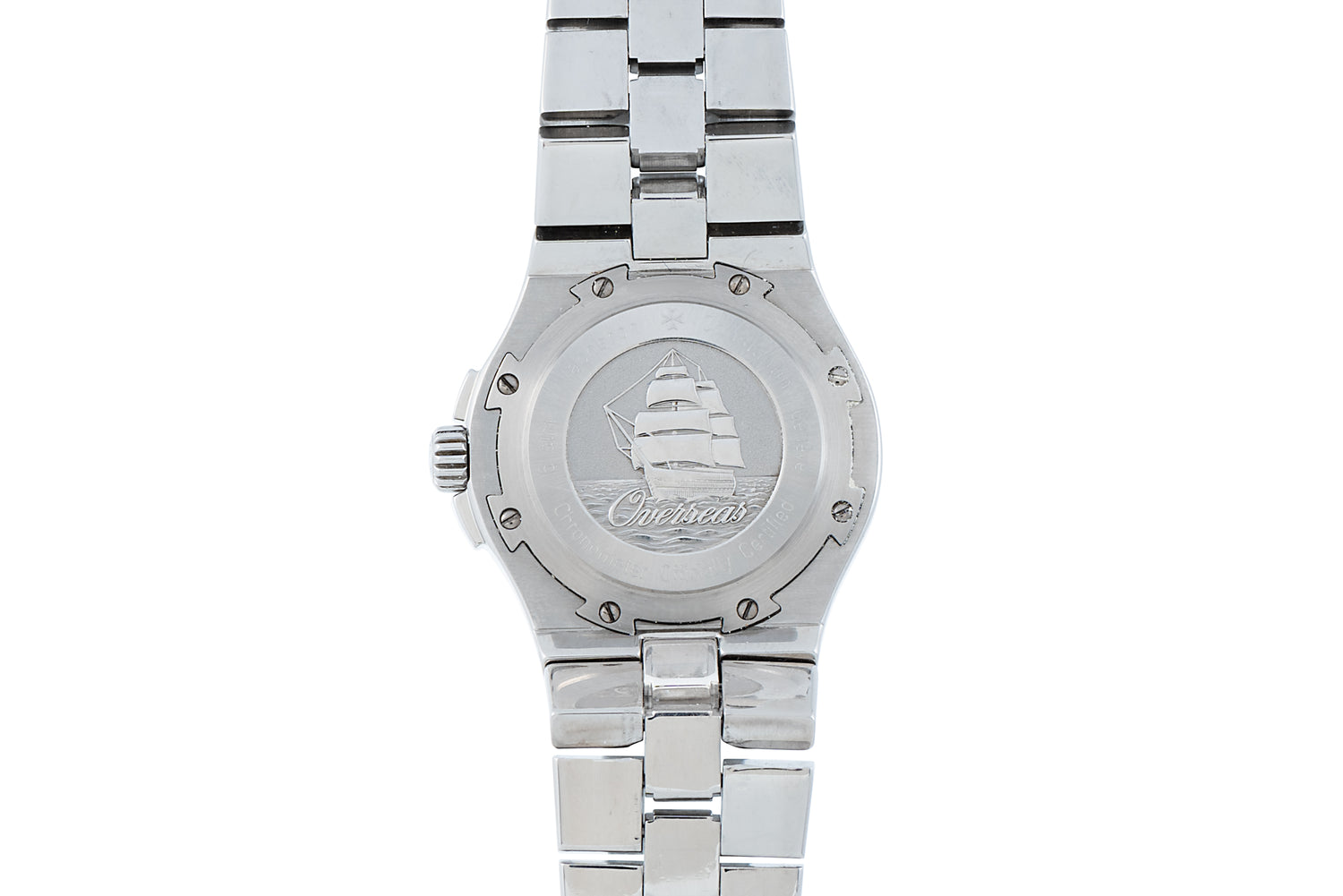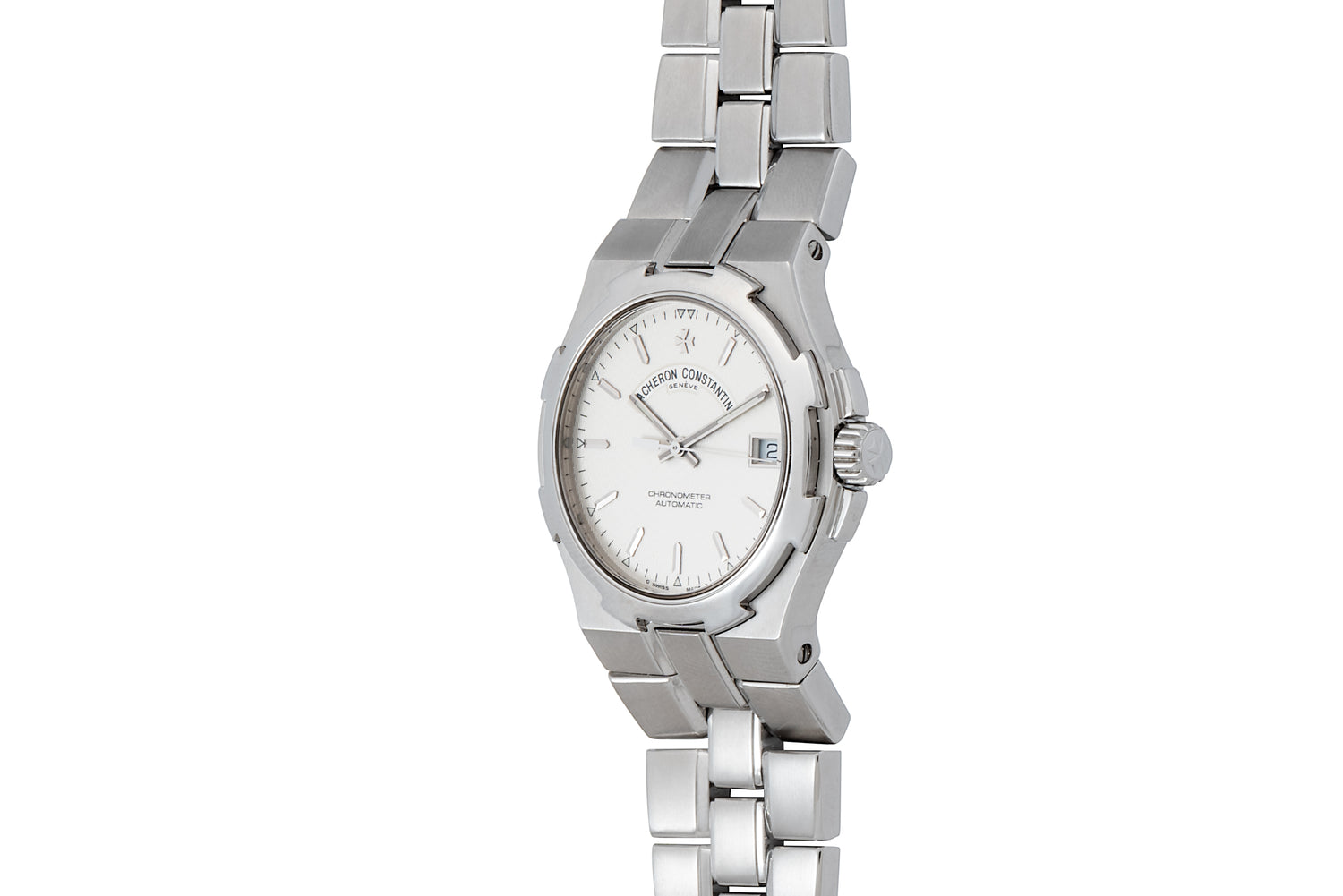 This particular example, an Overseas Reference 42042, dates to circa the early 2000s and features a solid stainless steel case with an integrated style bracelet, a Maltese stylized bezel, and a luminous textures silver dial dial with applied indices and a matching handset.