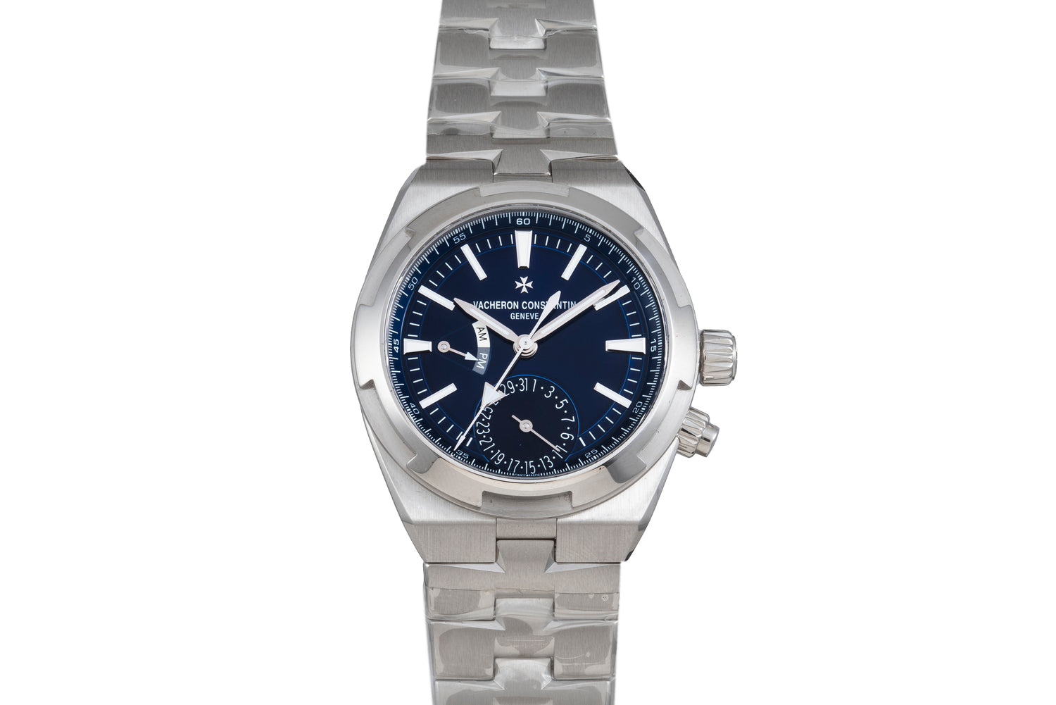 This particular example, an Overseas Dual Time Reference 7900V, features an absolutely gorgeous, deep glossy blue dial with applied luminous indices, an AM/PM indicator, a date indicator at 6:00, a signed crown, and a fantastic, matching stainless steel bracelet with a signed deployant clasp.