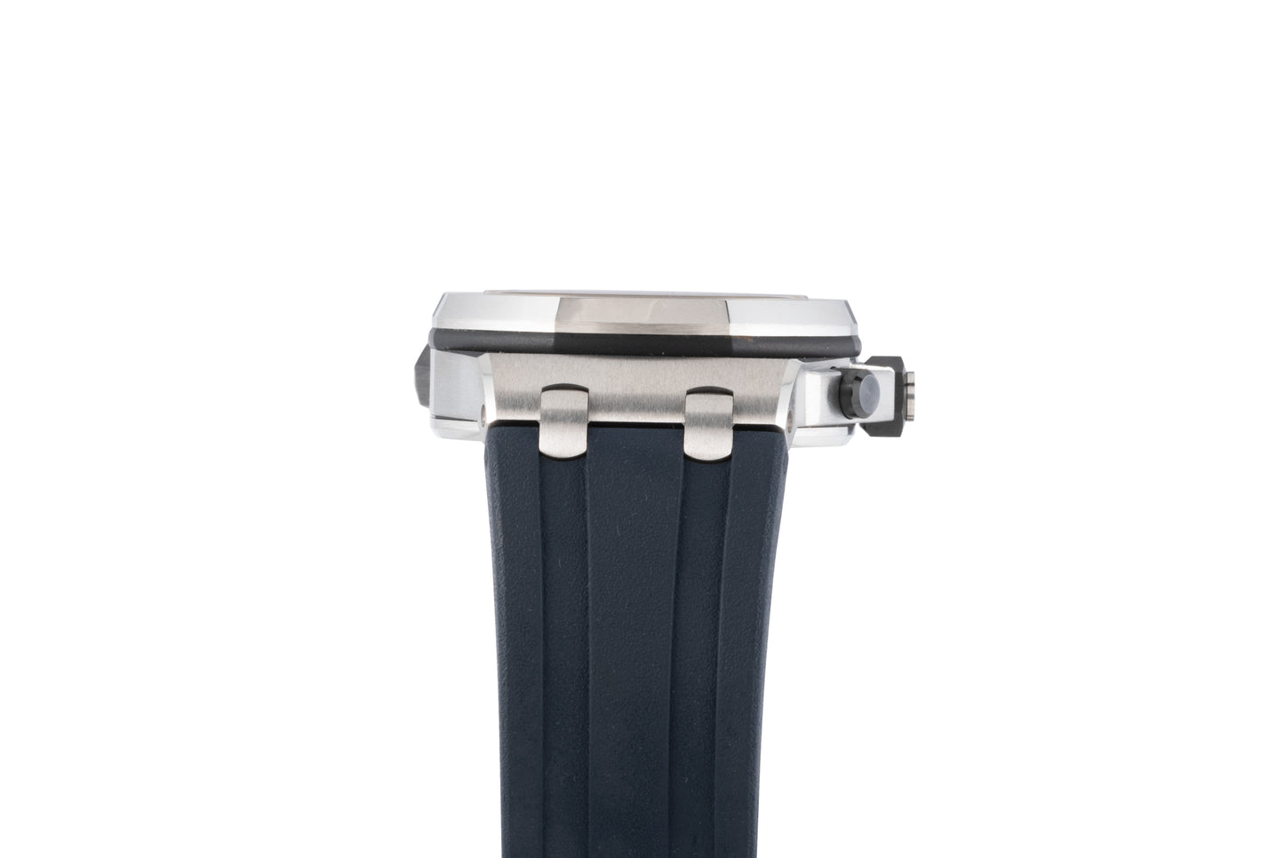 This particular model, a Reference 26703ST Offshore Diver Chronograph, is AP's take on a 'no frills' dive watch. It features a luminous navy blue macro-tapisserie dial with applied indices, a two-register chronograph layout, a matching handset, and an excellent integrated rubber strap manages to fit perfectly on the wrist despite its 42mm size.