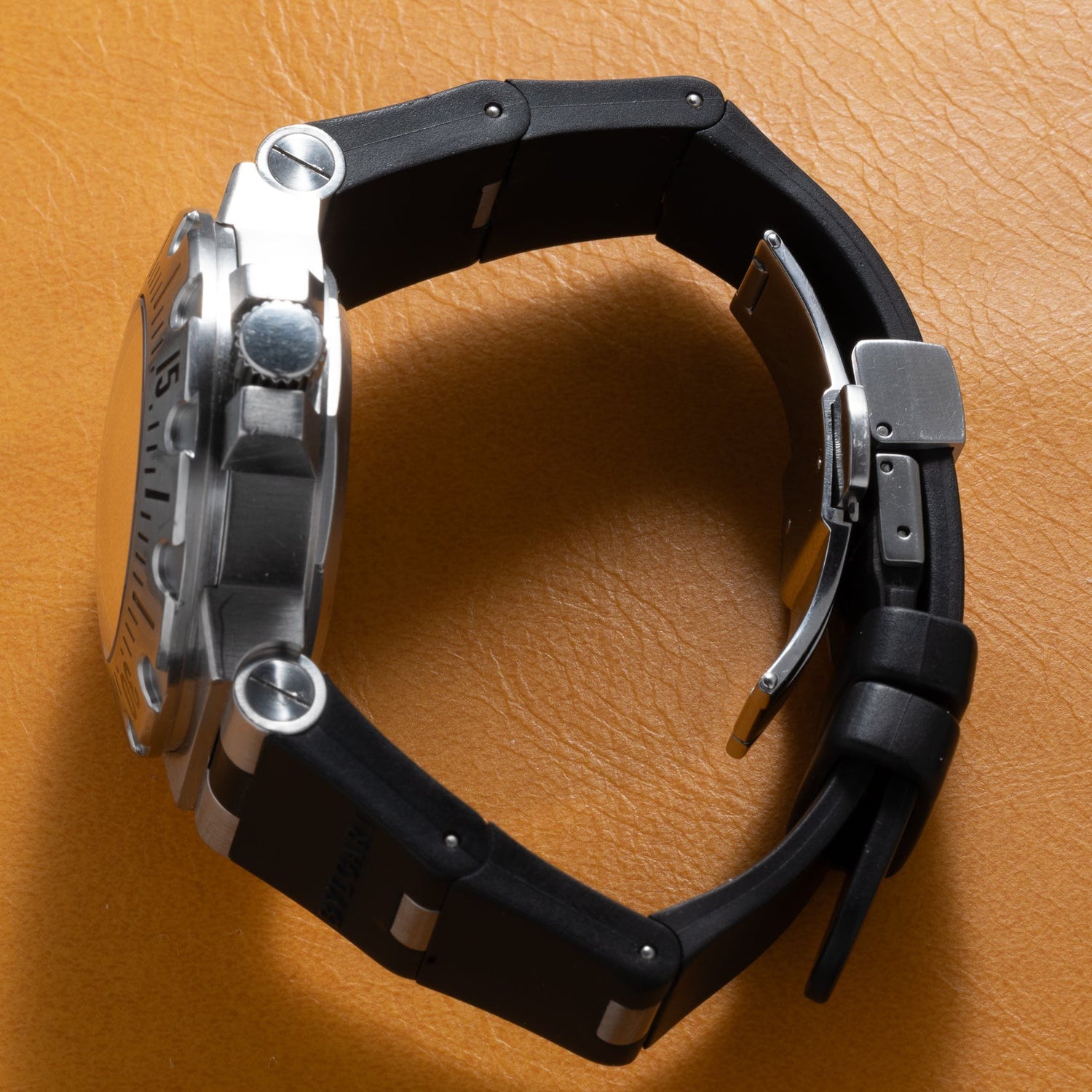 This example, a Reference SD 42, is unabashedly robust. It features a 42mm stainless steel case equipped with a chunky, fully-graduated timing bezel with large circular grooves for easy grip, and has become inextricably linked as part of its design panache. Complemented by a domed sapphire crystal, an unsigned crown flanked by crown guards and a Helium Escape Valve at 9 o’clock, this piece means business below the surface, boasting a whopping 2000 meter water resistance rating.