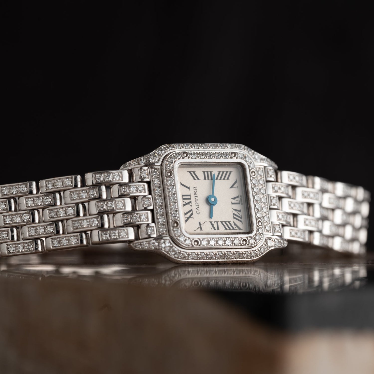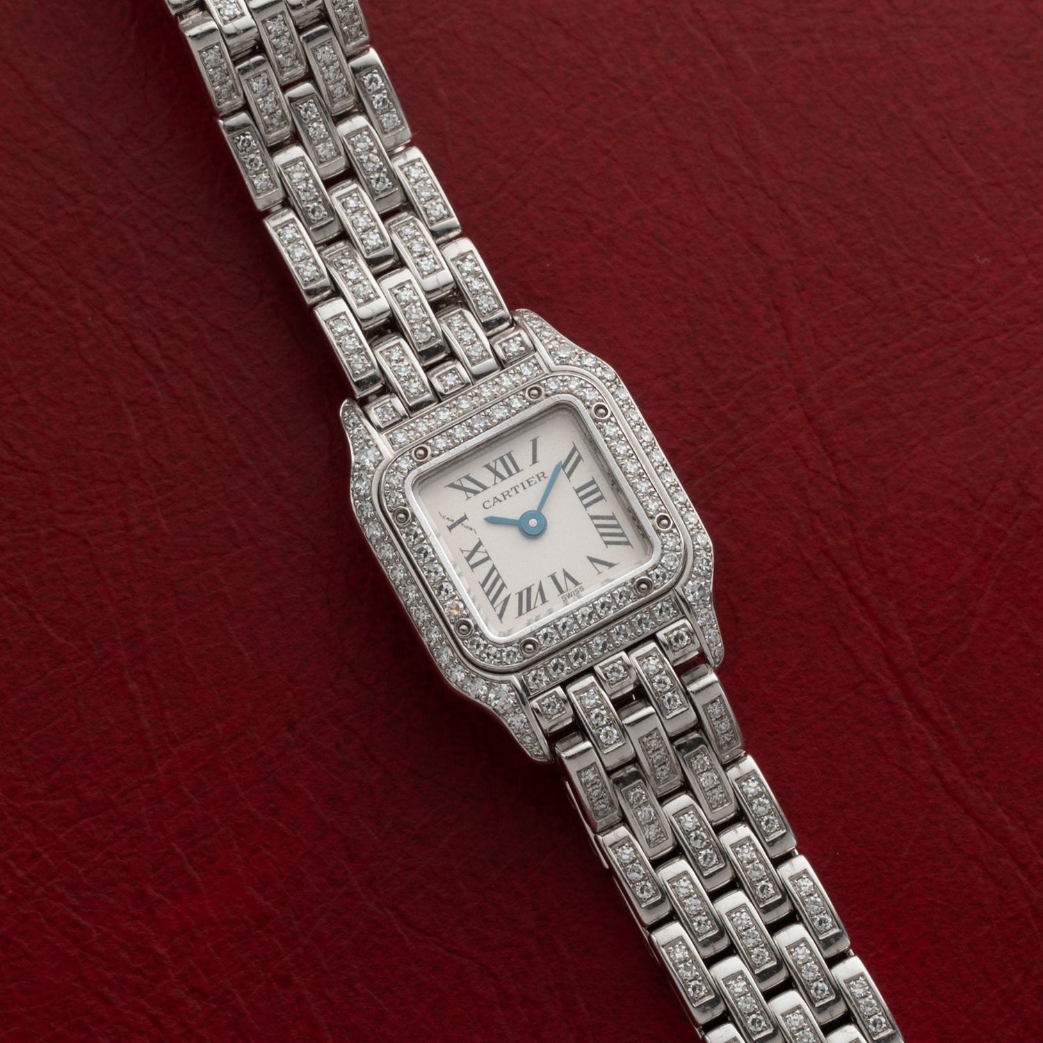 Over a century later, the Panthère line is still a fixture in the Cartier catalog, and the big cat motif appears frequently on watches, jewelry, and more. This particular Panthère de Cartier is a ladies’ staple, fashioned in white gold with a gorgeous correct 18K white gold bracelet. This piece features a diamond bezel diamond set bracelet and case, white ‘Roman’ dial topped with blued steel hands. This piece comes with a sapphire crystal in excellent condition.