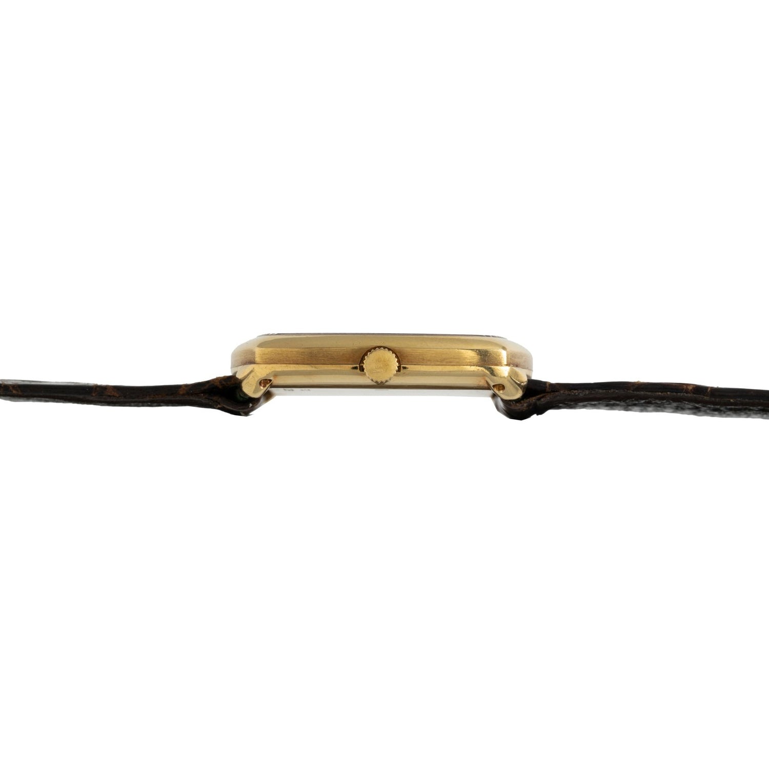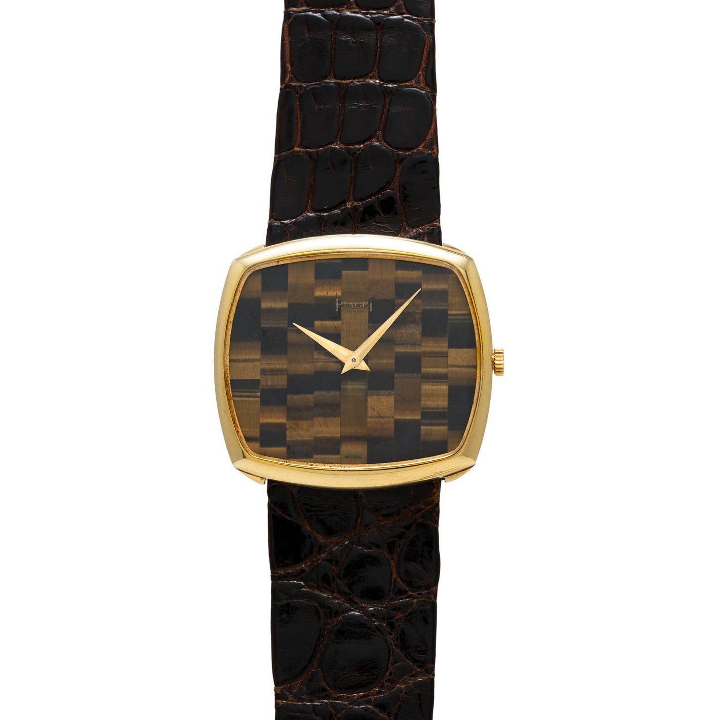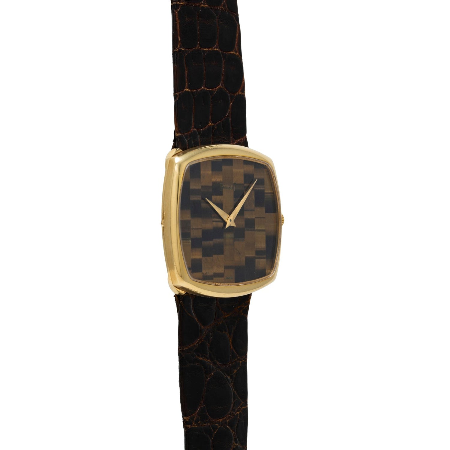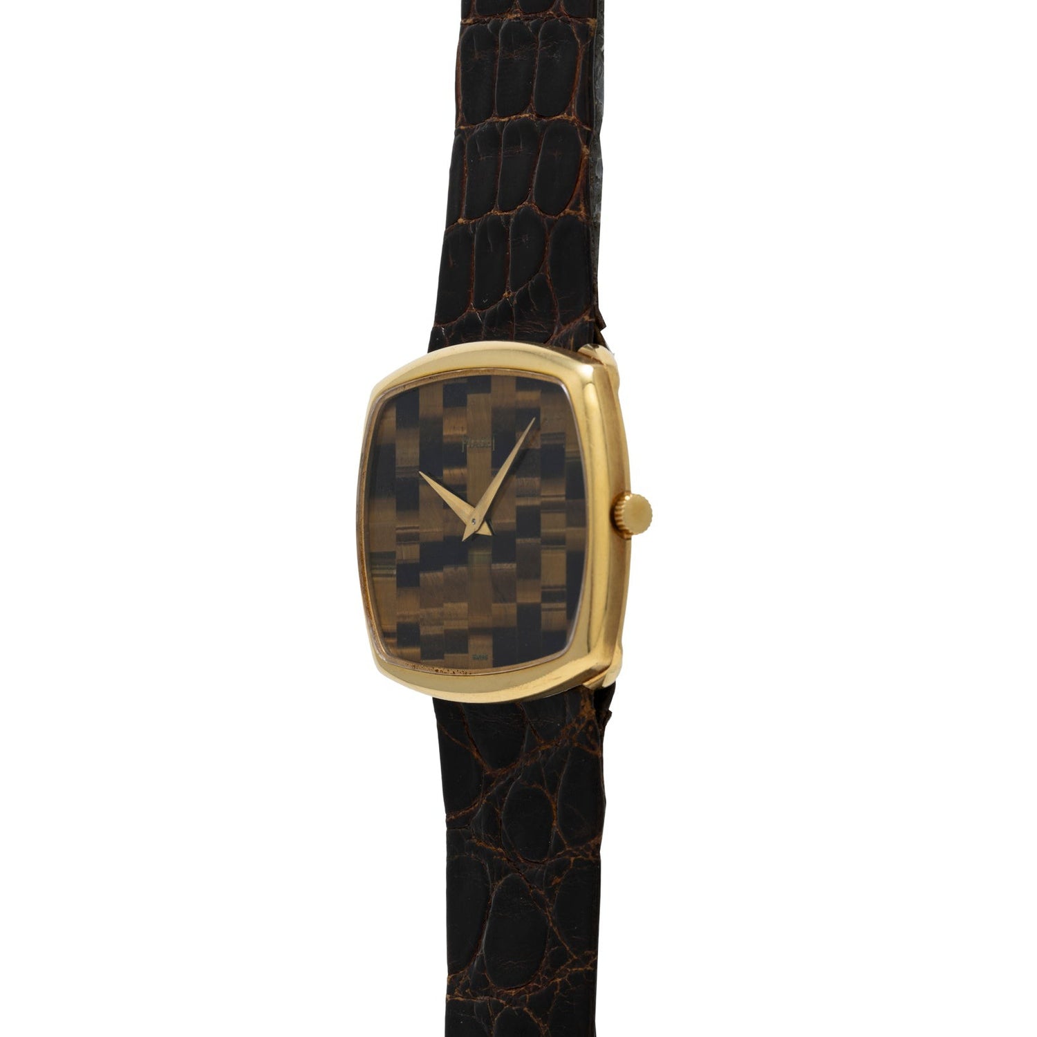 Executed in yellow gold, this piece has a brilliant ‘tiger’s eye dial, cut and staggered to create a checkerboard aesthetic. The alligator leather strap integrates directly into the case, allowing the cushion case to wear close and comfortably on the wrist.