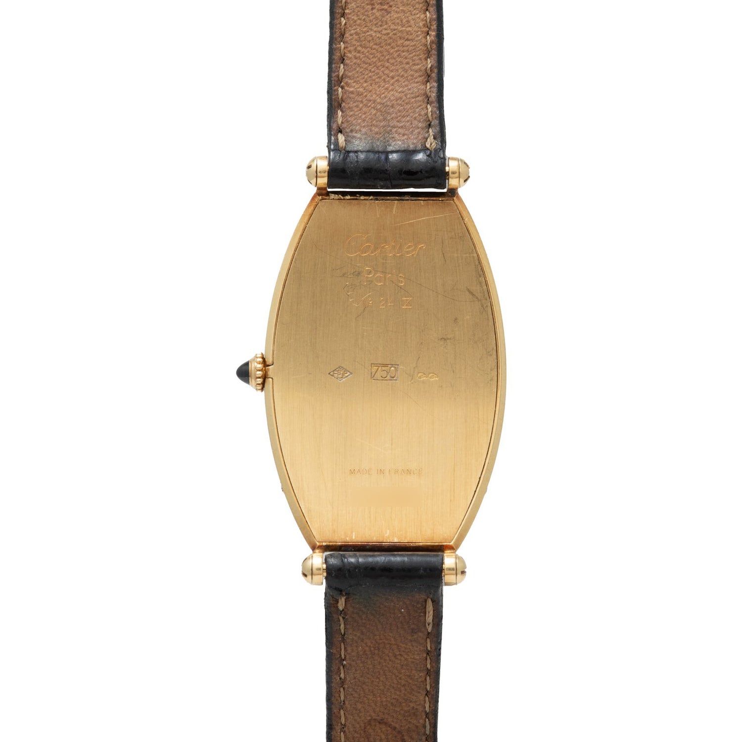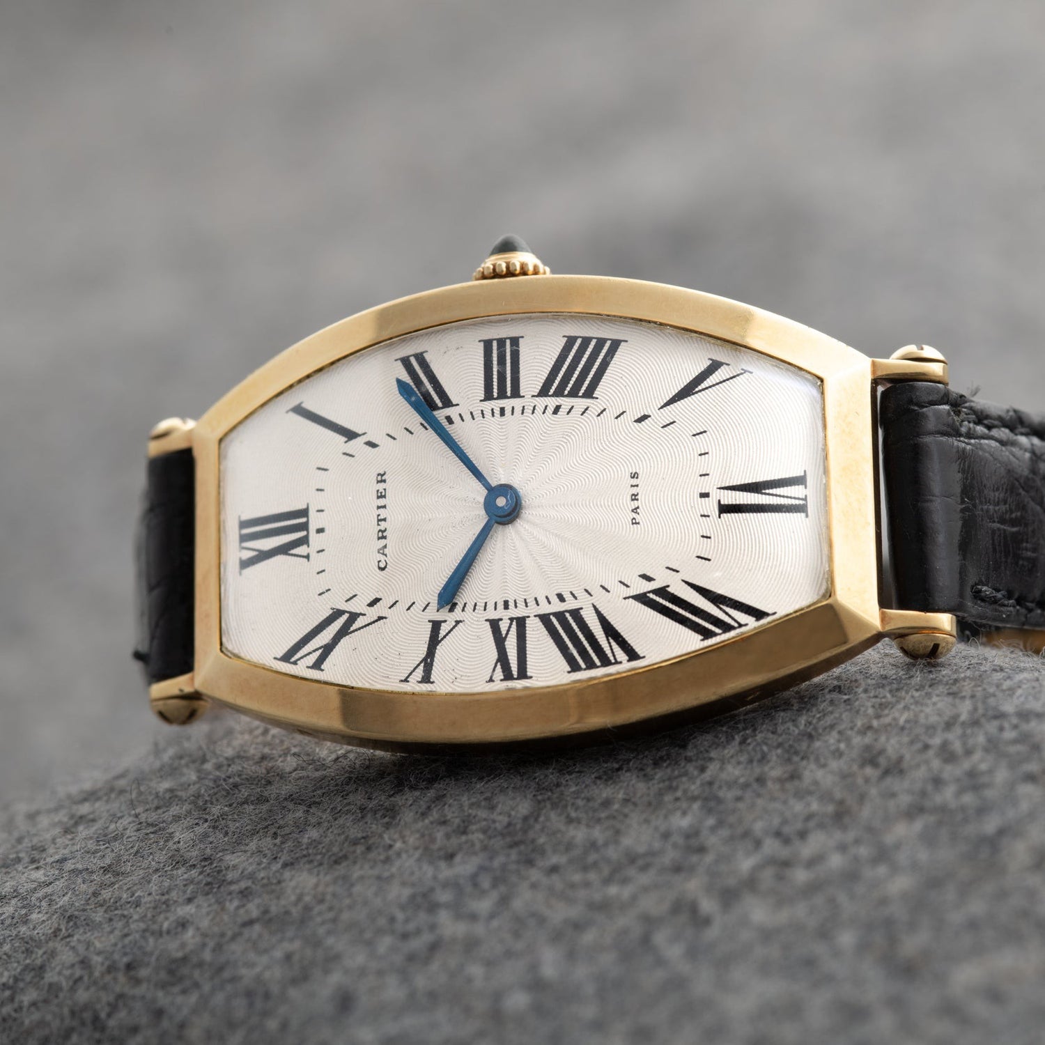 This particular example, a Tonneau model, dates to circa 1980s and features a 26mm 18k yellow gold case with a wildly cool, curved crystal, a lovely white guilloche Paris signed dial with printed 'Roman' indices, a matching blued-steel 'sword' handset, and Cartier’s ubiquitous sapphire cabochon crown.