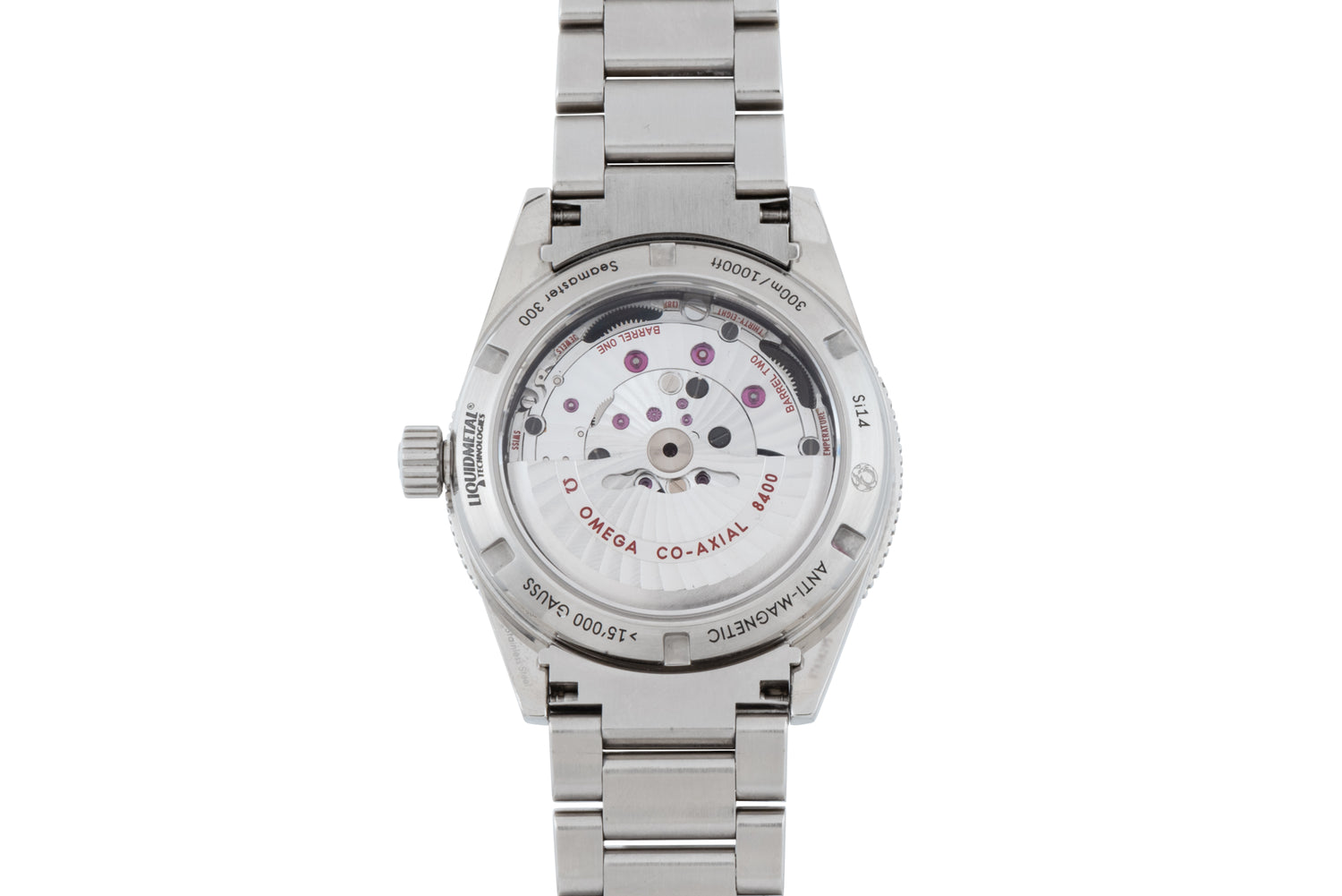 This particular piece, a Reference 233.30.41.21.01.001, features a 41mm stainless steel straight-lug case with a sapphire crystal, a signed crown, a rotating dive timing bezel with a black ceramic insert, and a luminous matte black 'sandwich' dial with a matching 'broad-arrow' handset. This piece comes fitted to Omegas excellent stainless steel bracelet with a signed push-button deployant clasp and is powered by the Omega Calibre 8400 Master Co-Axial Chronometer automatic movement, which can be viewed through its sapphire caseback.