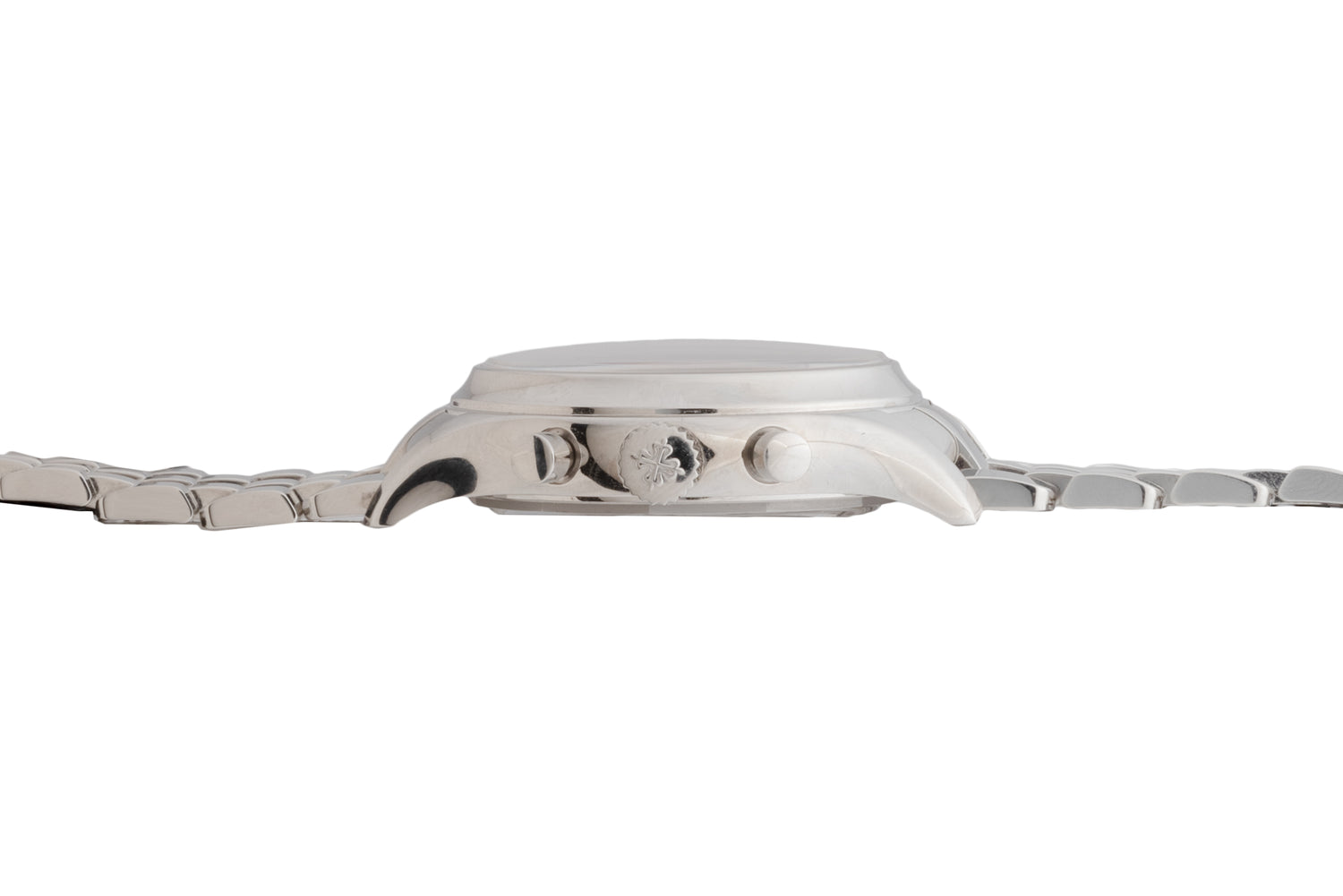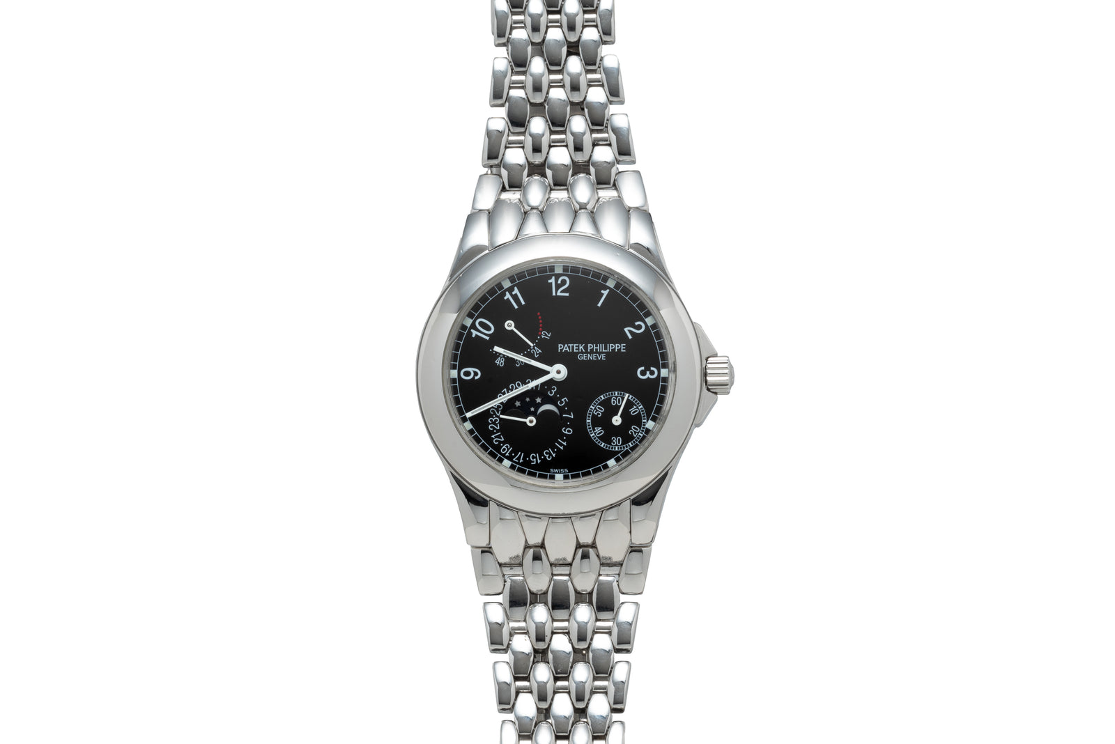 This piece transports us forward to the present day and is a handsome modern iteration of the Patek Philippe Complications Annual Calendar. Designated as a Reference 5960-1A, this lovely timepiece features a 40mm stainless steel case with sculpted, contoured lugs, a concave bezel, pump pushers and a signed crown.