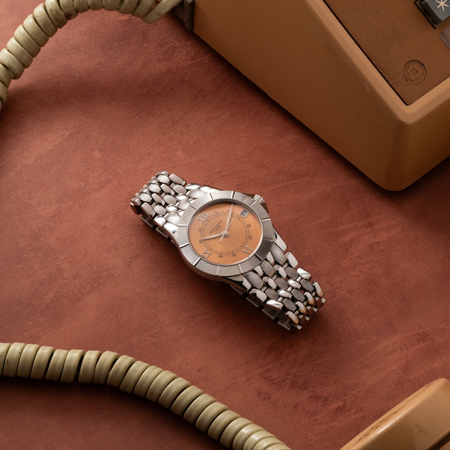 This piece, a Reference 5080/1A, features a 36mm stainless steel case with signature crown guards, a signed crown, a sapphire crystal, and a stunning fluted bezel with polished hour markers. The copper-hued dial features applied 'Roman' indices; a date indicator at 3 o'clock, luminous feuille handset, and a central chemin de fer minute track.