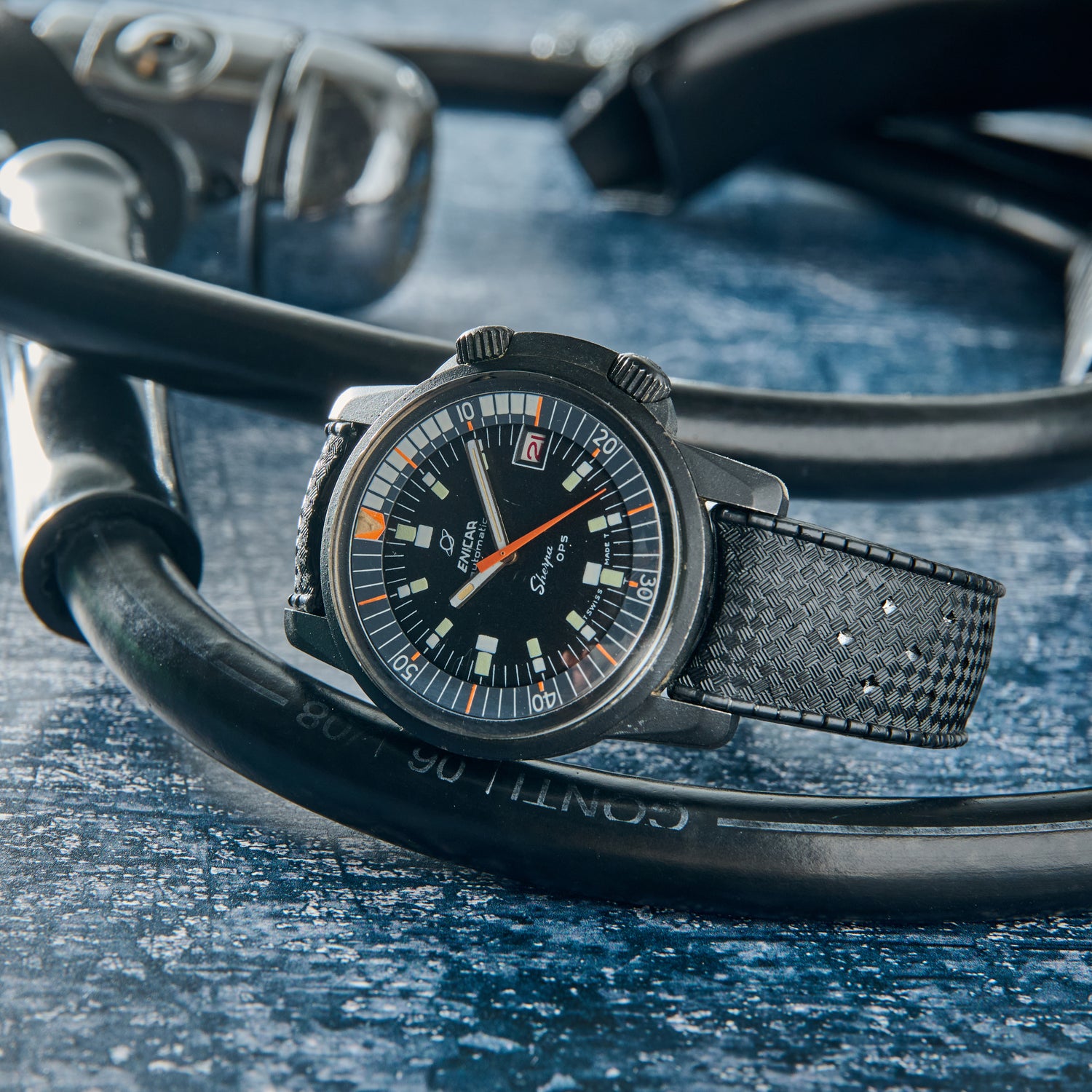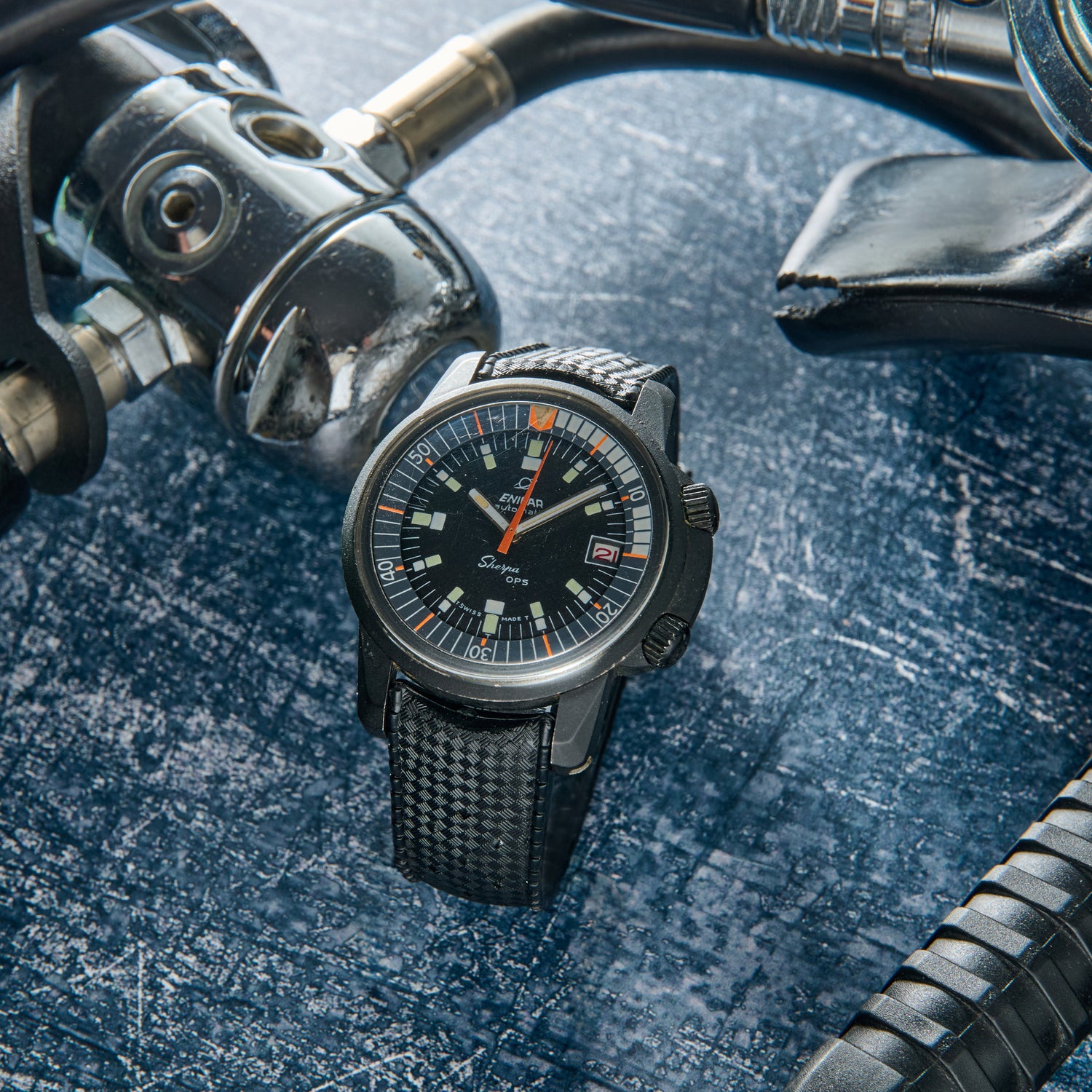 During the golden age of sporting wristwatches (1960s-1970s), this Swiss firm produced some incredibly high-quality and beautiful timepieces including divers and chronographs. With Heuer- and Omega-esque looks, Enicars often stand out for their colorful dials and unique case designs — especially those that use the unique SuperCompressor case popular in the 1960s.Â