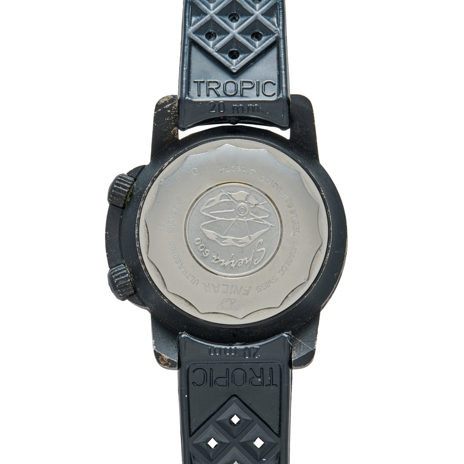 This piece, a Sherpa OPS, stands out primarily due to its PVD-finished steel housing. Amongst the first of its kind (alongside the Heuer Monaco "Dark Lord" and DOXA Army), the OPS is based on the Sherpa 600, but was geared towards a decidedly military/outdoors aesthetic. Finding one in excellent condition with its correct box, furthermore, is no simple feat — but we managed to do it!