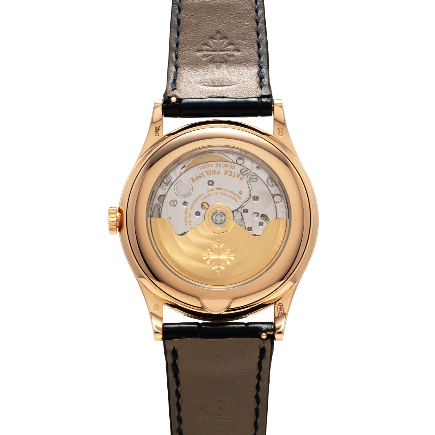 The reverse side of the case features an exhibition back providing a window through which to admire the self-winding Caliber 324 S QA LU, with its 21K gold winding rotor adorned with the hallmark Patek Philippe seal. Fitted to a signed blue alligator strap with a matching signed 18K rose gold deployant buckle, this piece is accompanied by its factory goodies including its Certificate of Origin dated to 218.
