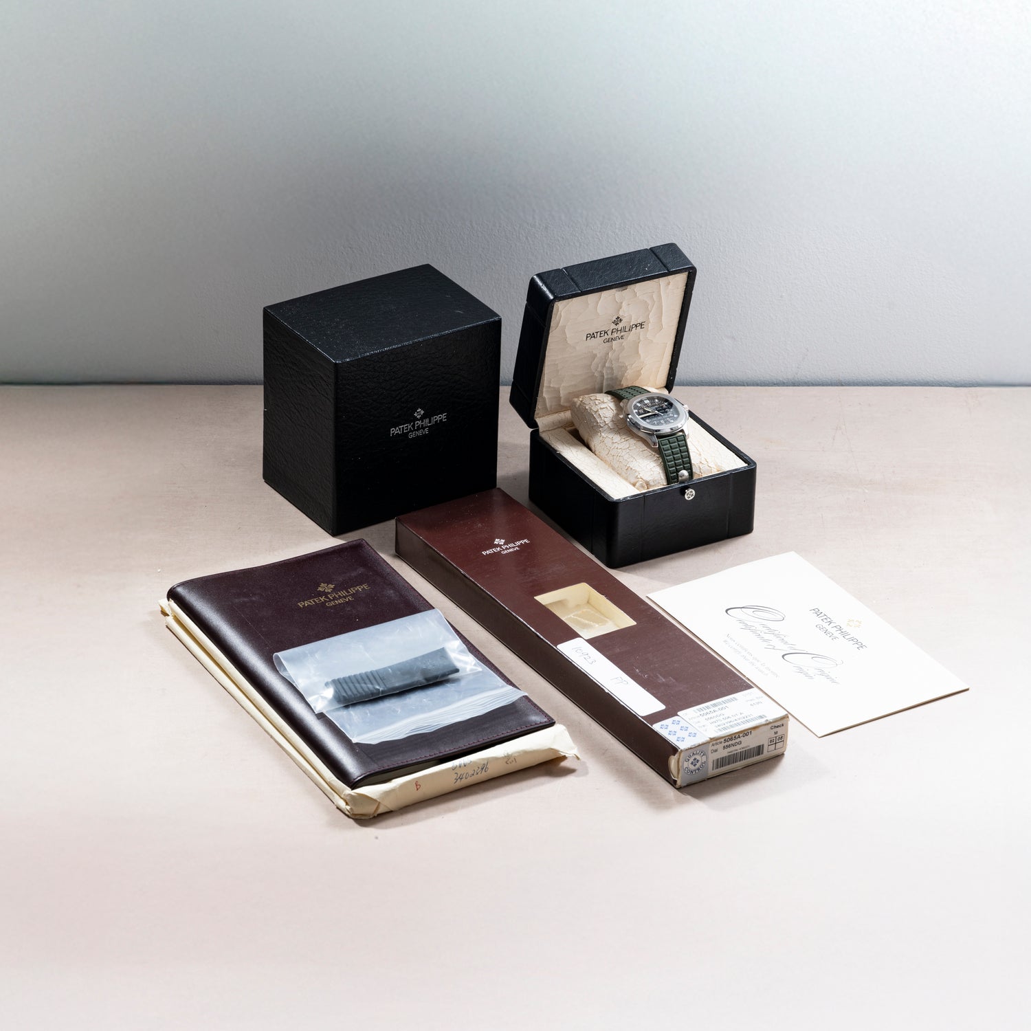 In great condition throughout showing light signs of honest use, this piece delivers with its factory box, books, leather folio, extra strap, and its Certificate of Origin dated 2005.