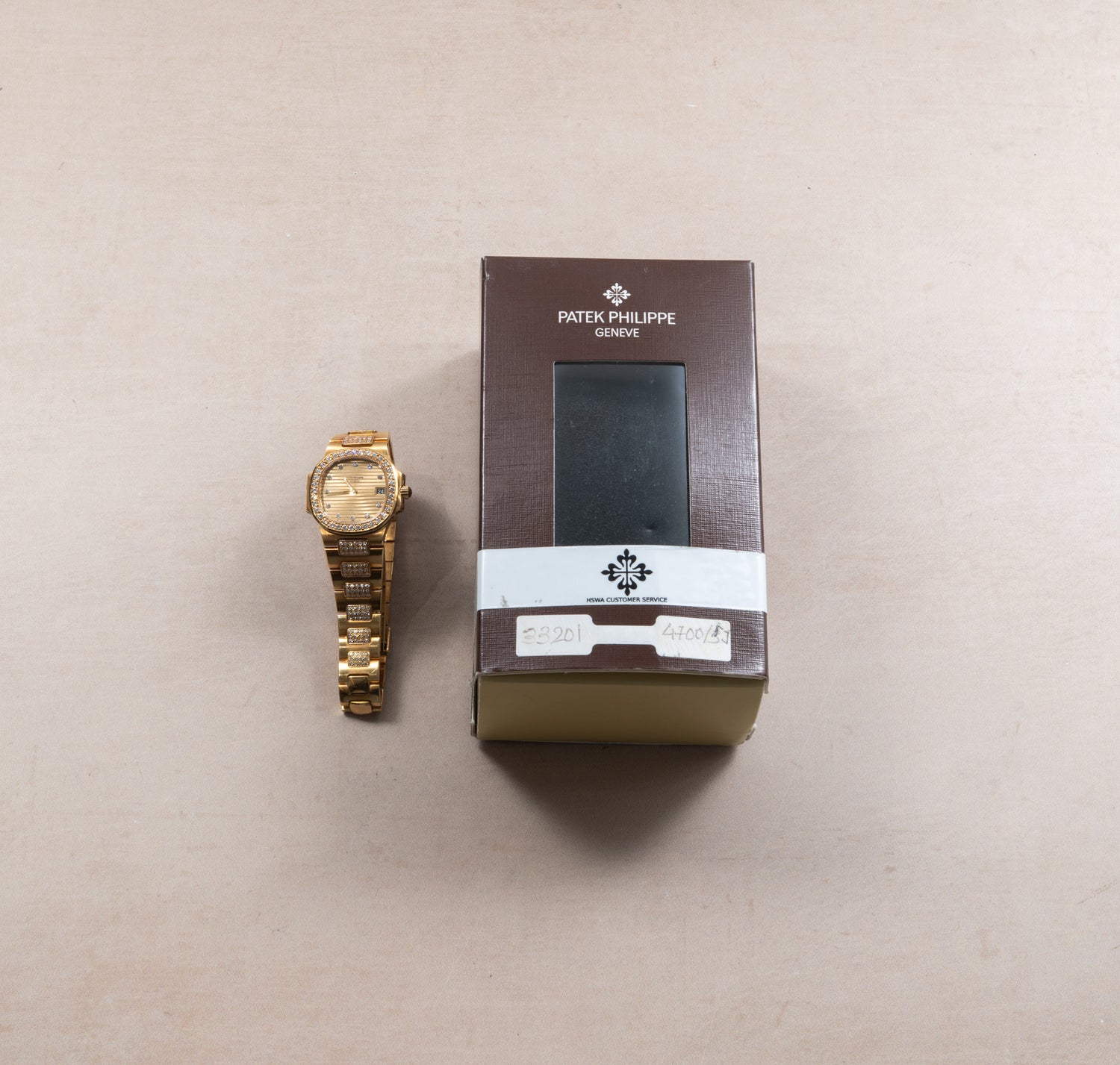 Housed in a 28mm yellow gold case, this example features a gold tone champagne dial with applied, diamond indices, a lumed ‘pencil’ handset, and the aforementioned black date wheel. Powered by a Patek Philippe quartz movement and paired to an integrated, yellow gold bracelet with matching factory diamond settings, it’s every bit as iconic as its larger, mechanical siblings.