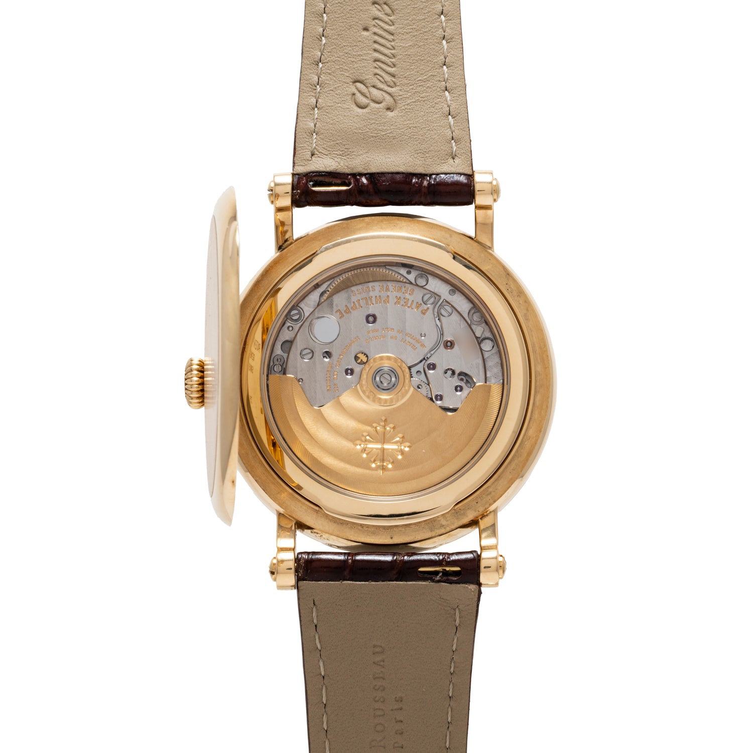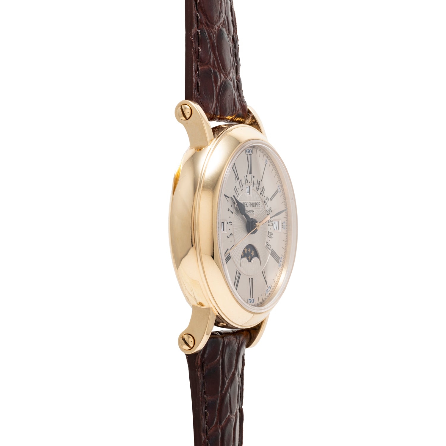 Perpetual calendars are Patek Philippe’s speciality — it’s been making them in series since the 1940s. This particular quantieme perpetual, a Reference 5159J-001, dates to the 2010s. Housed in a 38mm 18K yellow gold half-’hunter’ case with officer’s lugs, a domed sapphire crystal, a signed ‘onion’ crown, and a polished bezel, it features an opaline white guilloché dial with black painted Roman numeral indices, an outer 1/5th-seconds track, a black gold polished ‘spade’ handset, a retrograde date scale and red-tipped pointer hand, a moonphase aperture at 6 o’clock, a month aperture at 3 o’clock, and a day aperture at 9 o'clock.